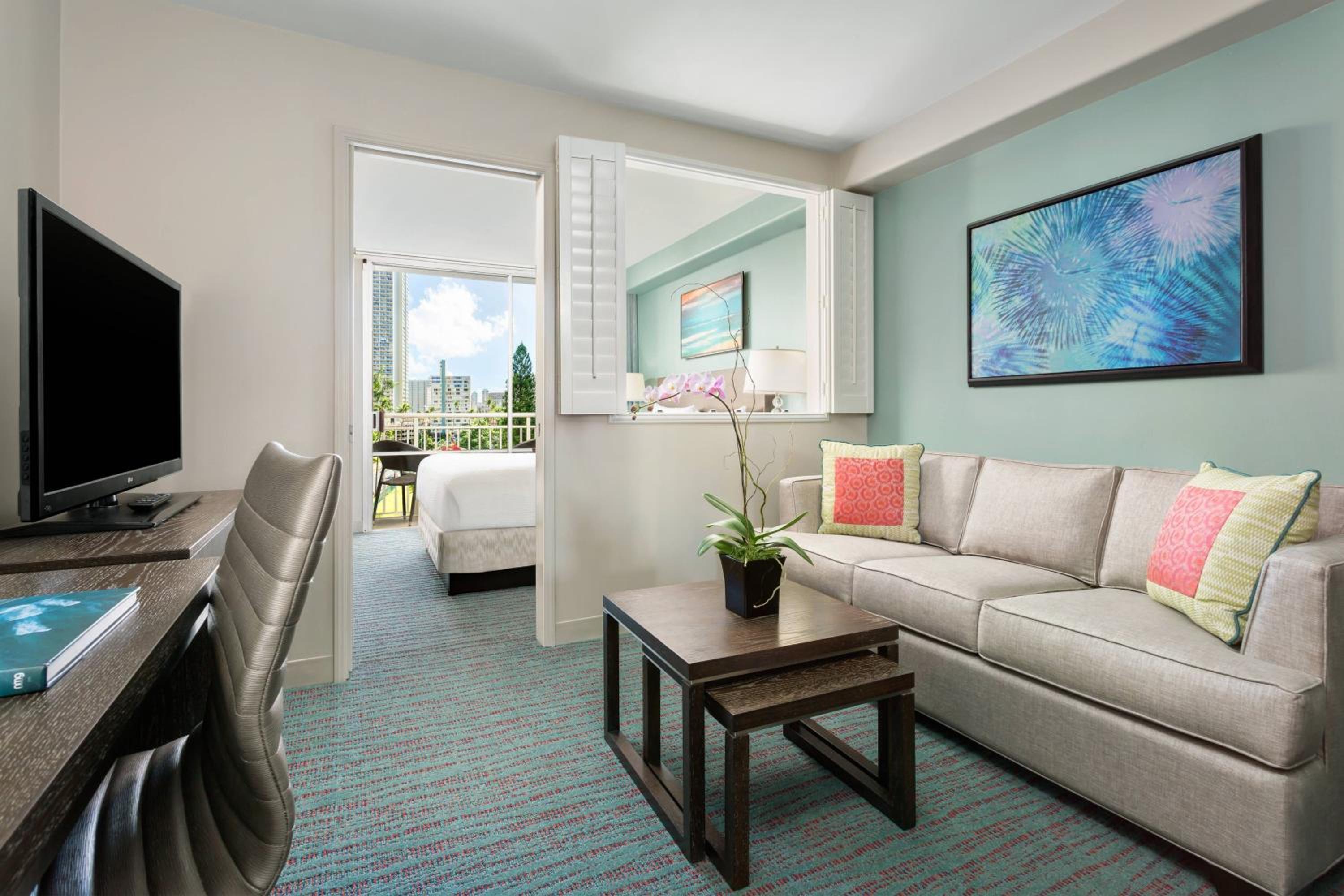 Relax in air-conditioned guest rooms featuring a refrigerator, flat-screen TV, Hawaiian coffee, and premium toiletries. Some rooms even include a cozy seating area for added comfort.