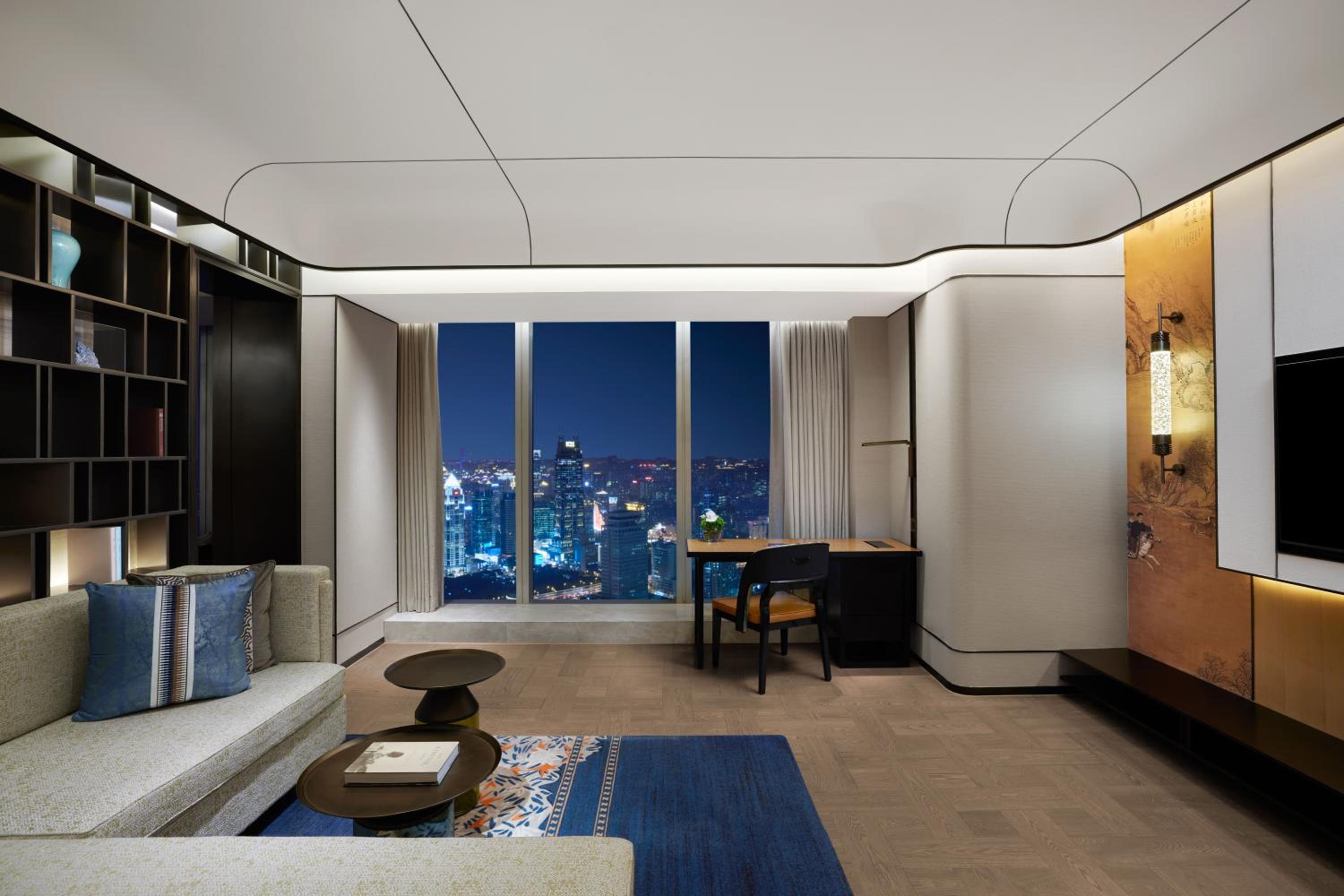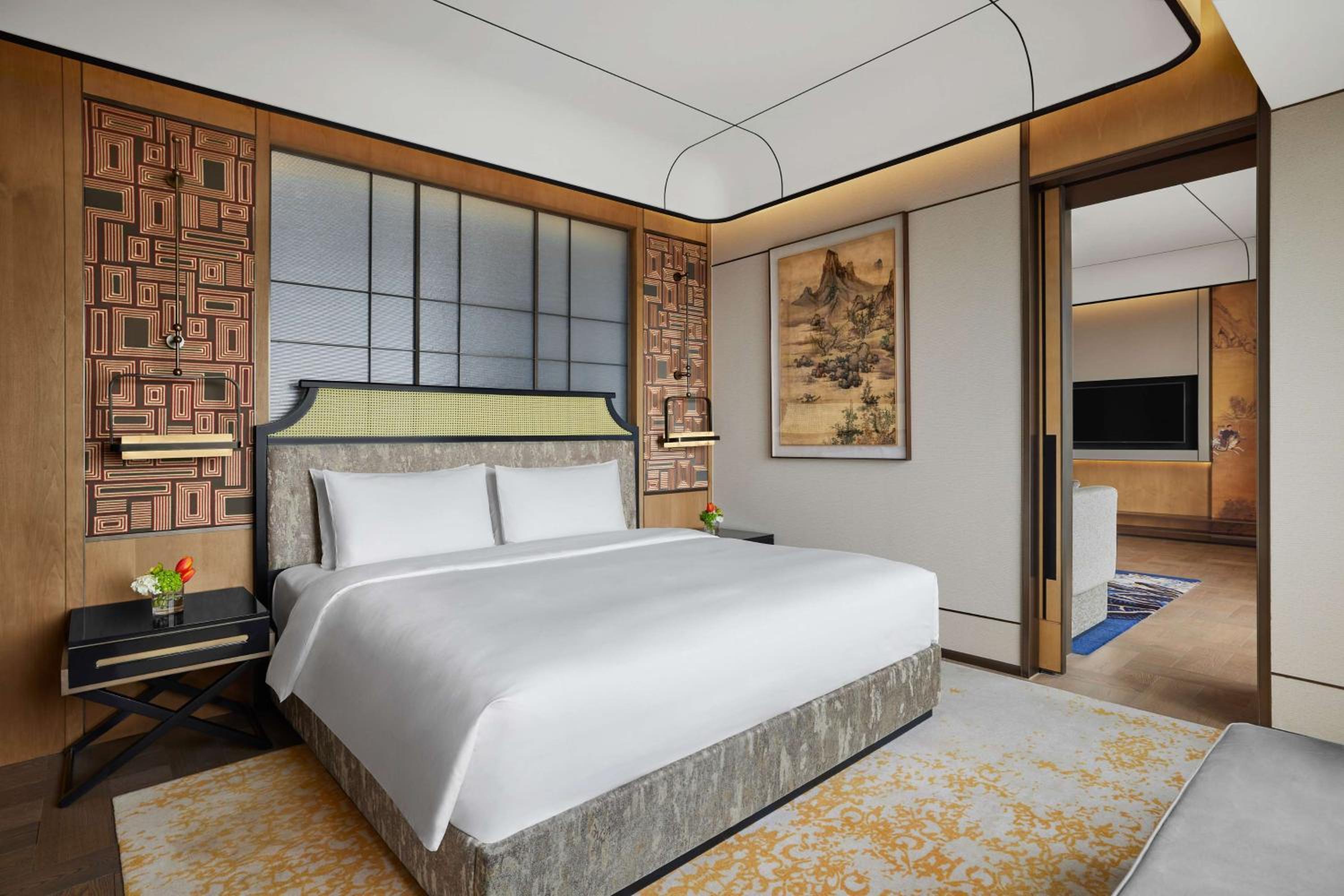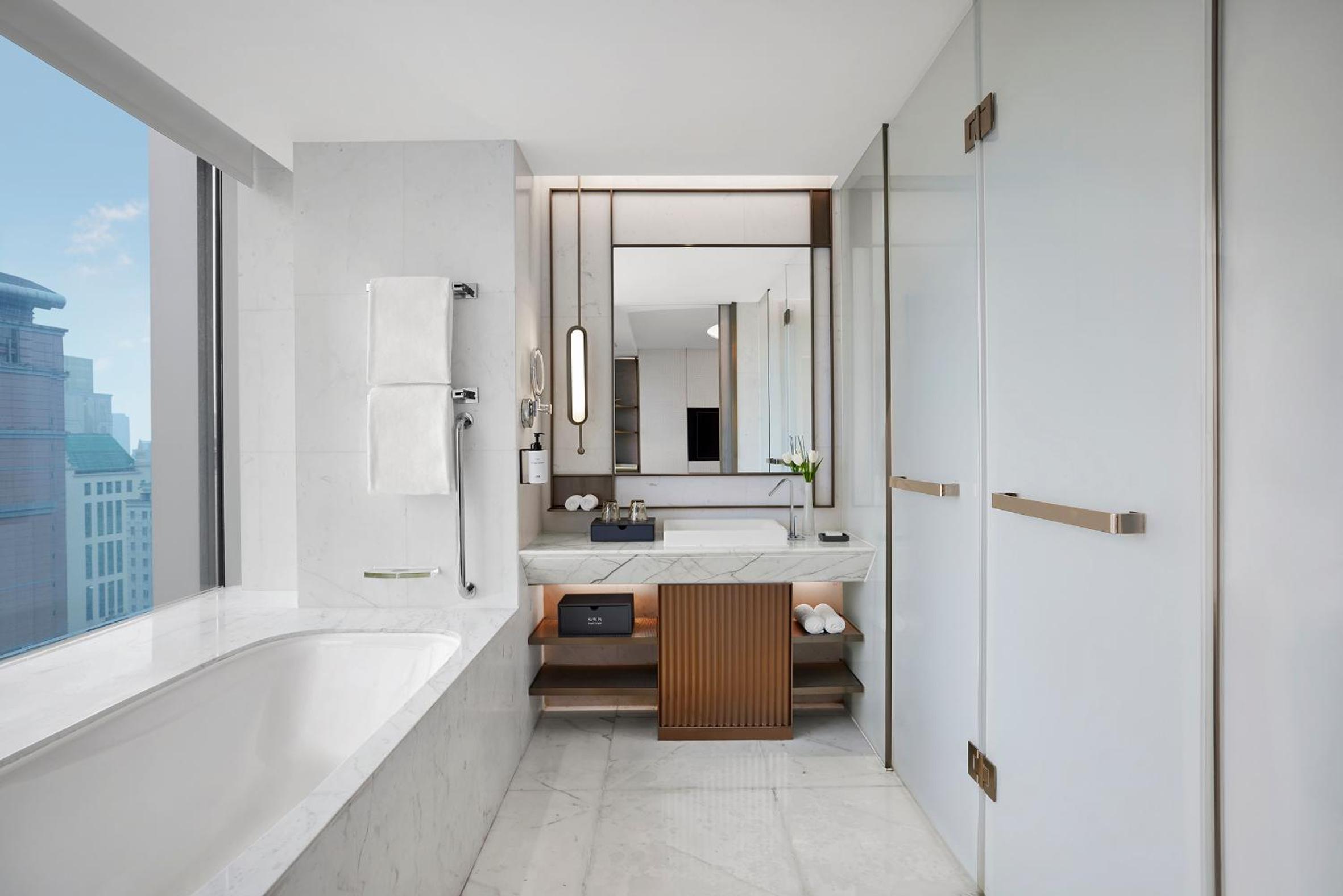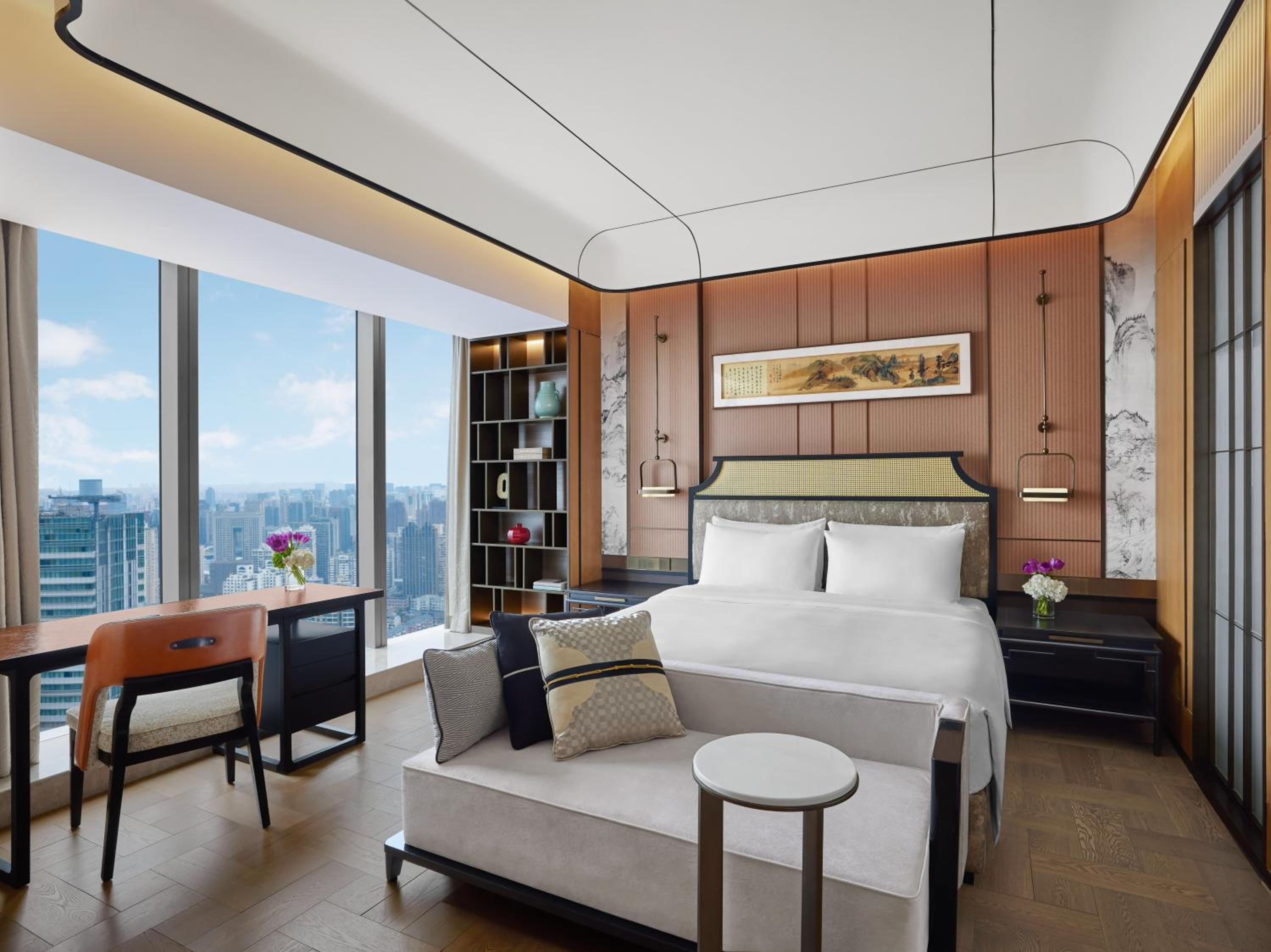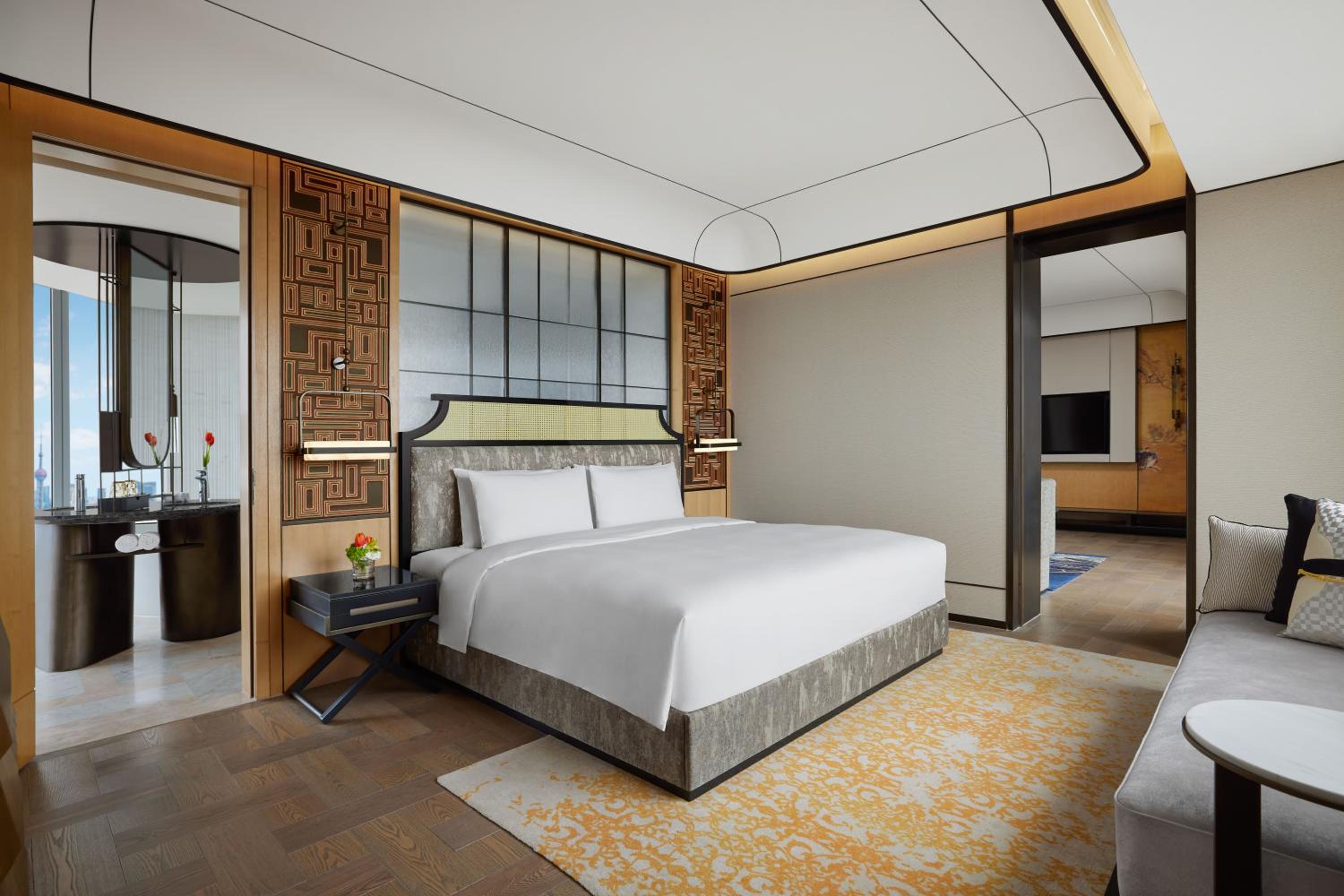 Situated in the heart of Shanghai, Conrad Shanghai offers stunning views of the city skyline from its elegantly decorated rooms with floor-to-ceiling windows. The royal ambiance is heightened by spacious marble bathrooms and cozy sitting areas, providing a truly luxurious stay.