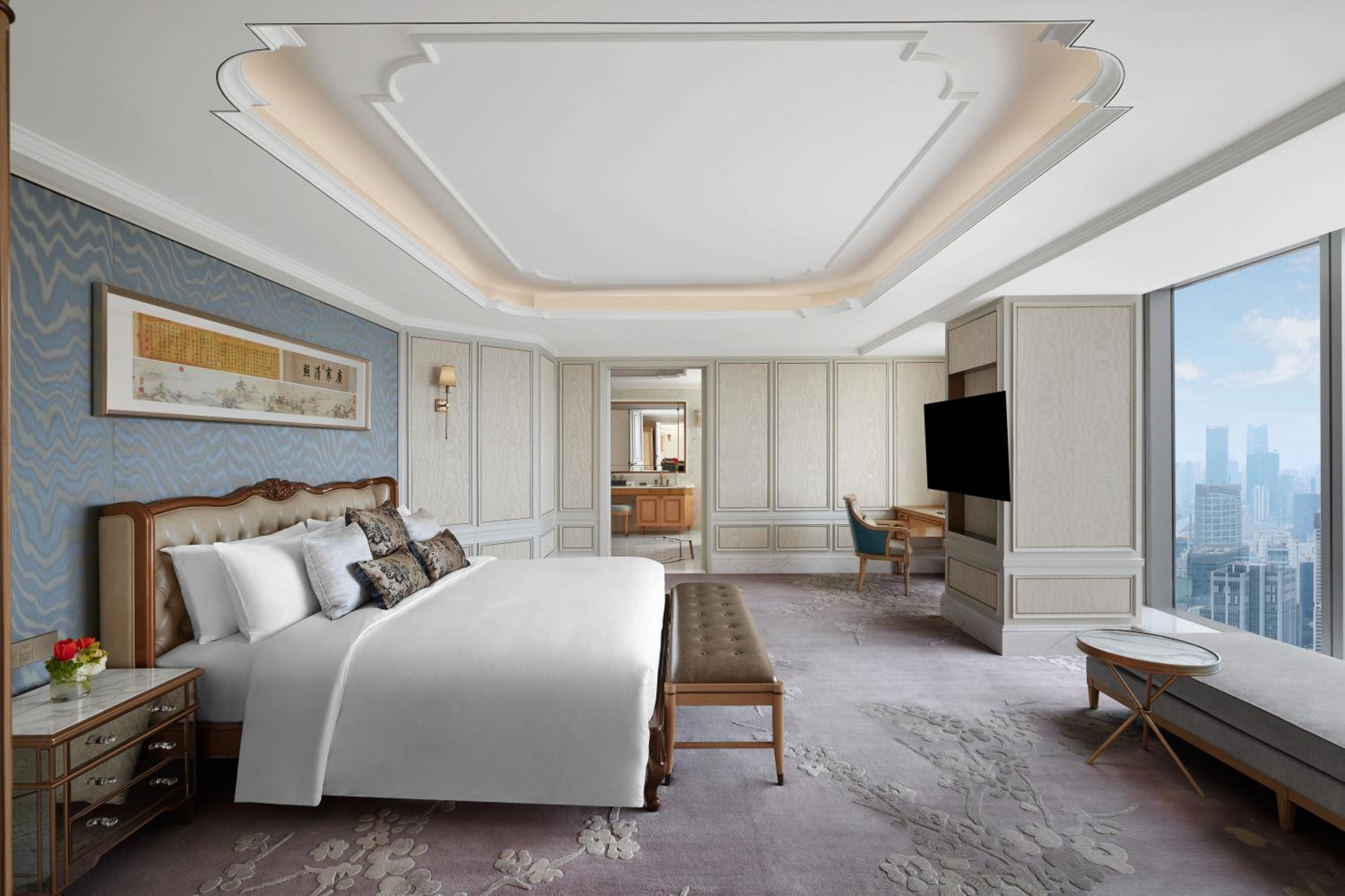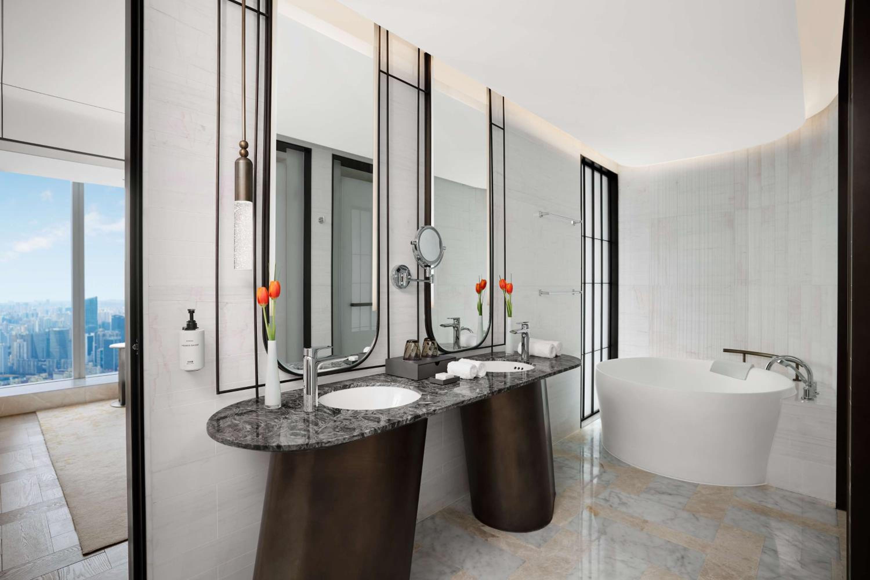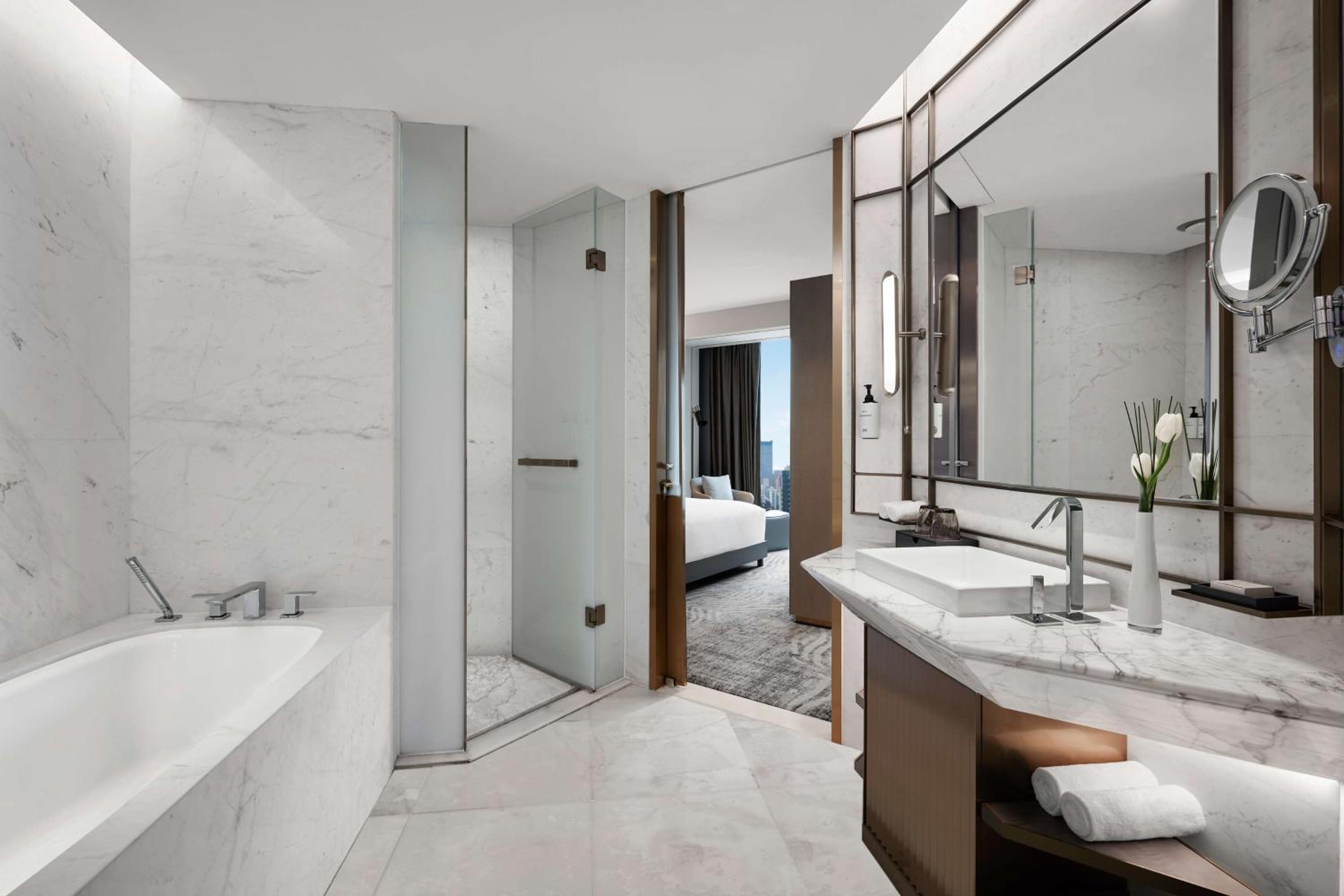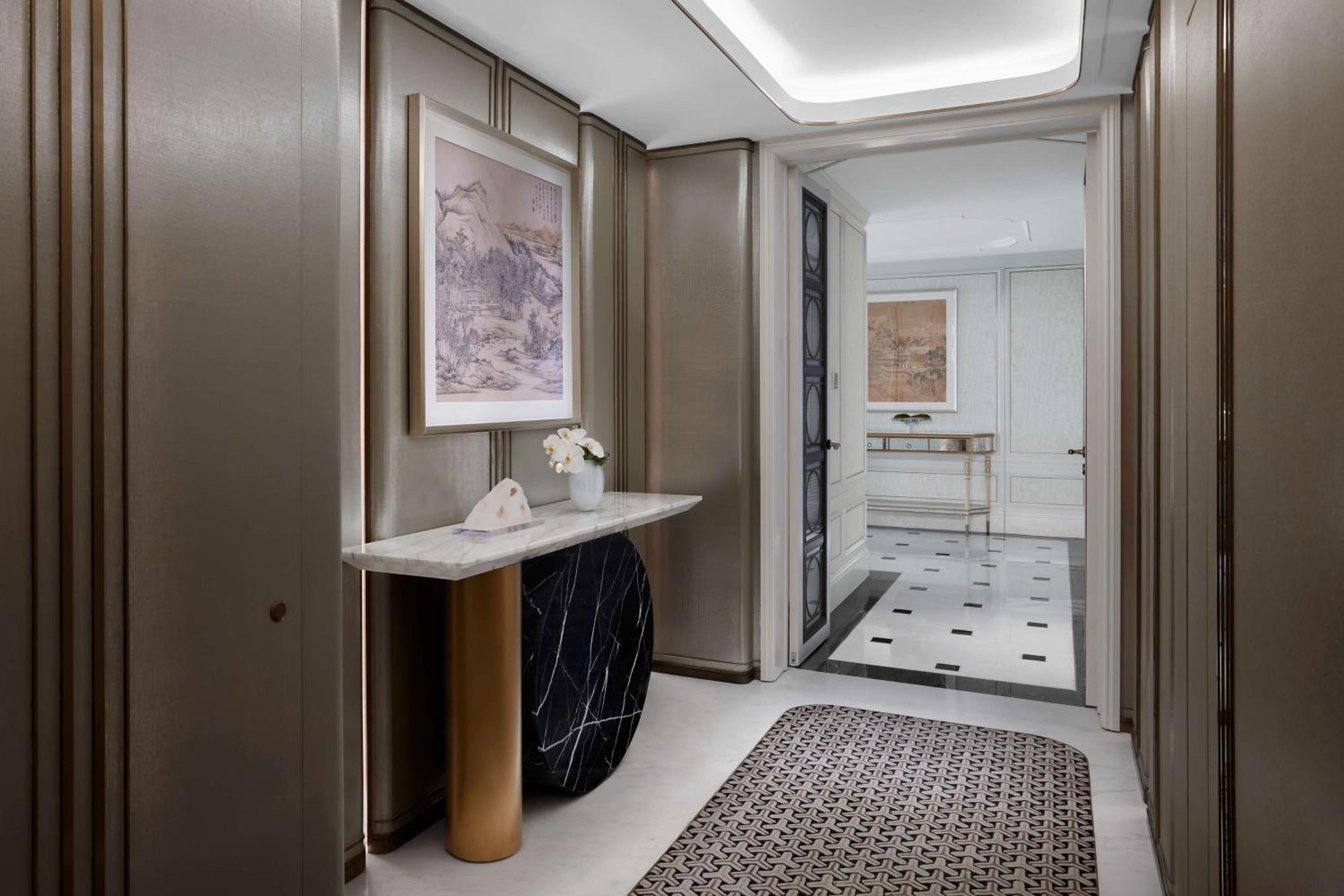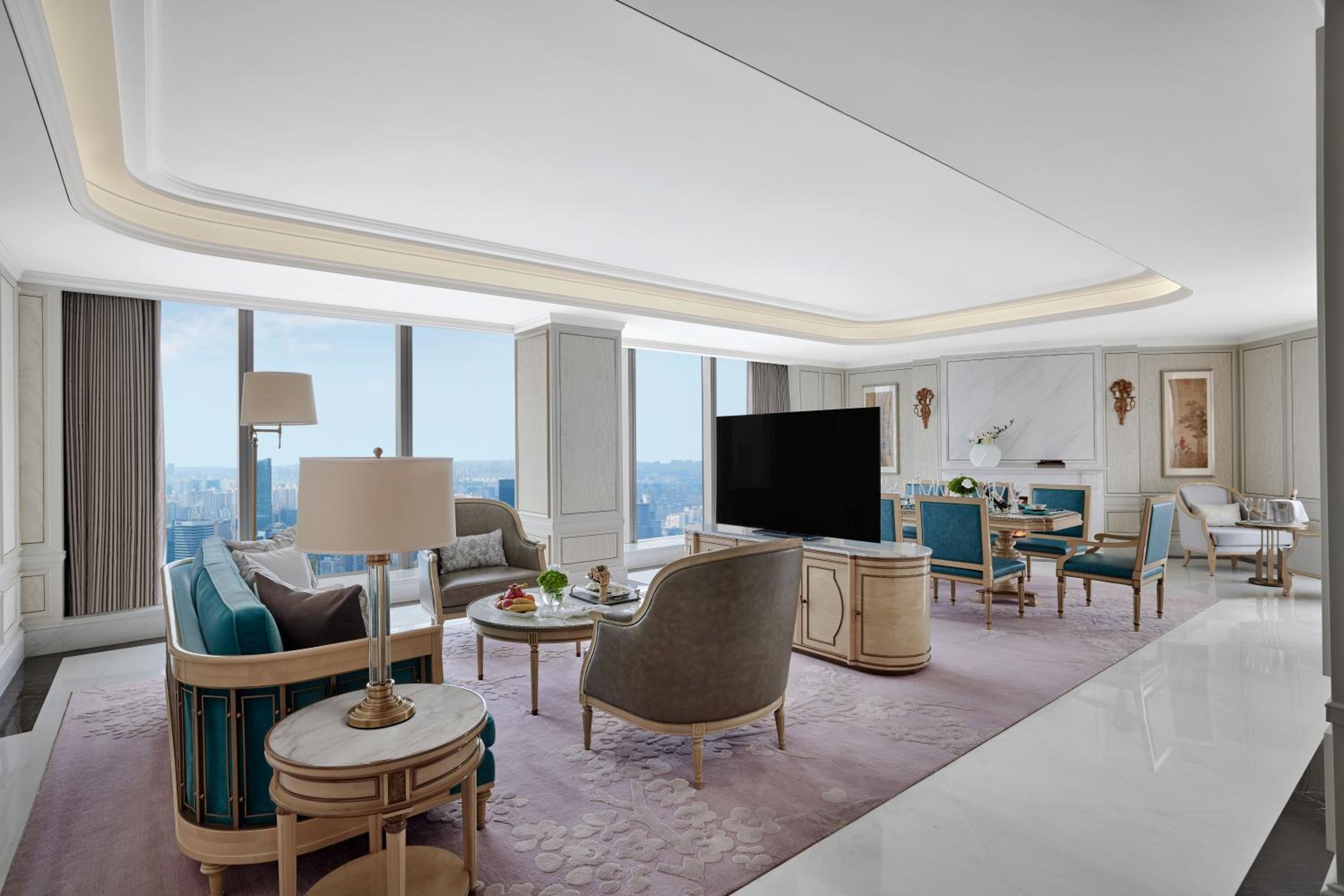 Situated in the heart of Shanghai, Conrad Shanghai offers stunning views of the city skyline from its elegantly decorated rooms with floor-to-ceiling windows. The royal ambiance is heightened by spacious marble bathrooms and cozy sitting areas, providing a truly luxurious stay.