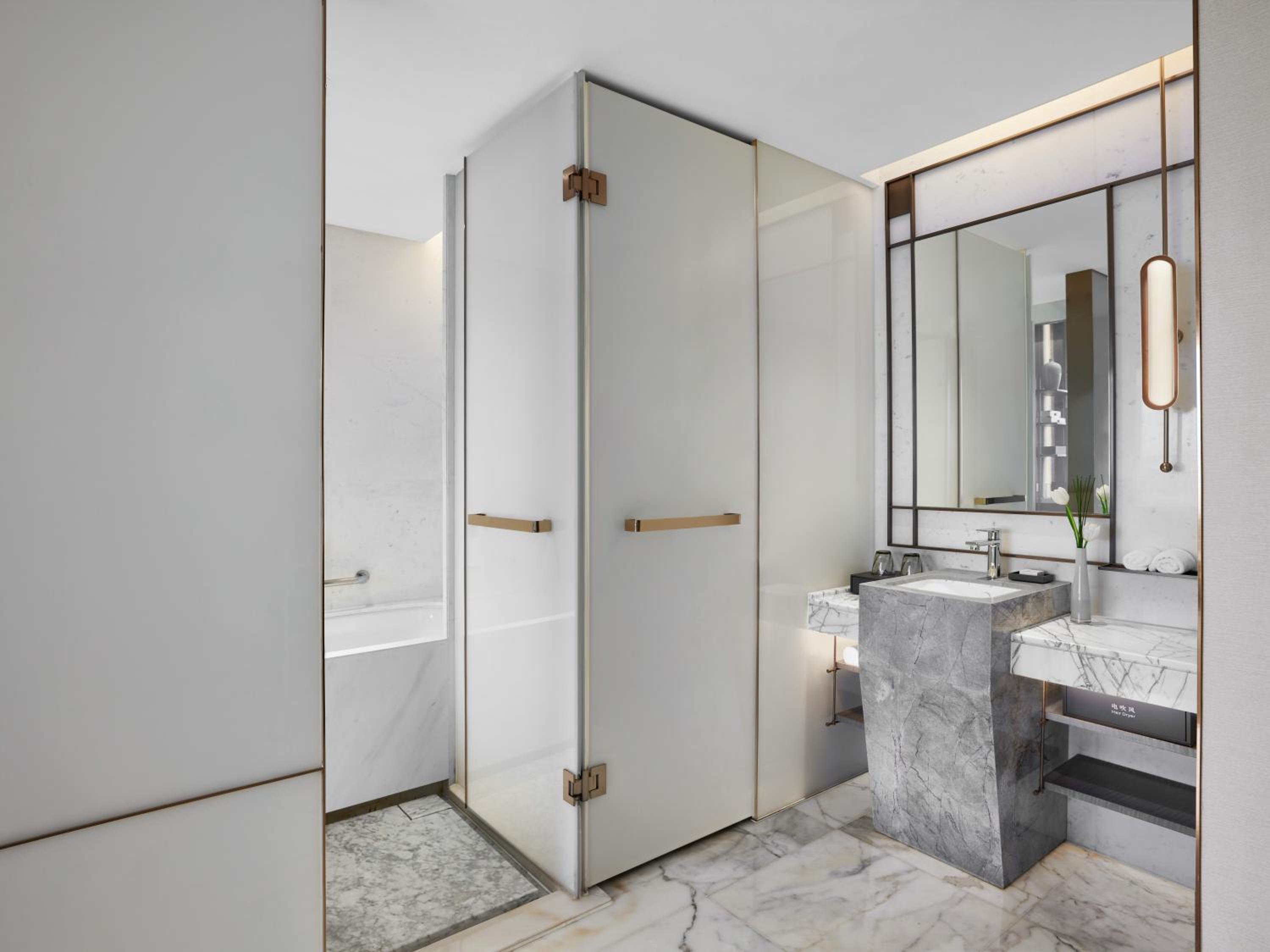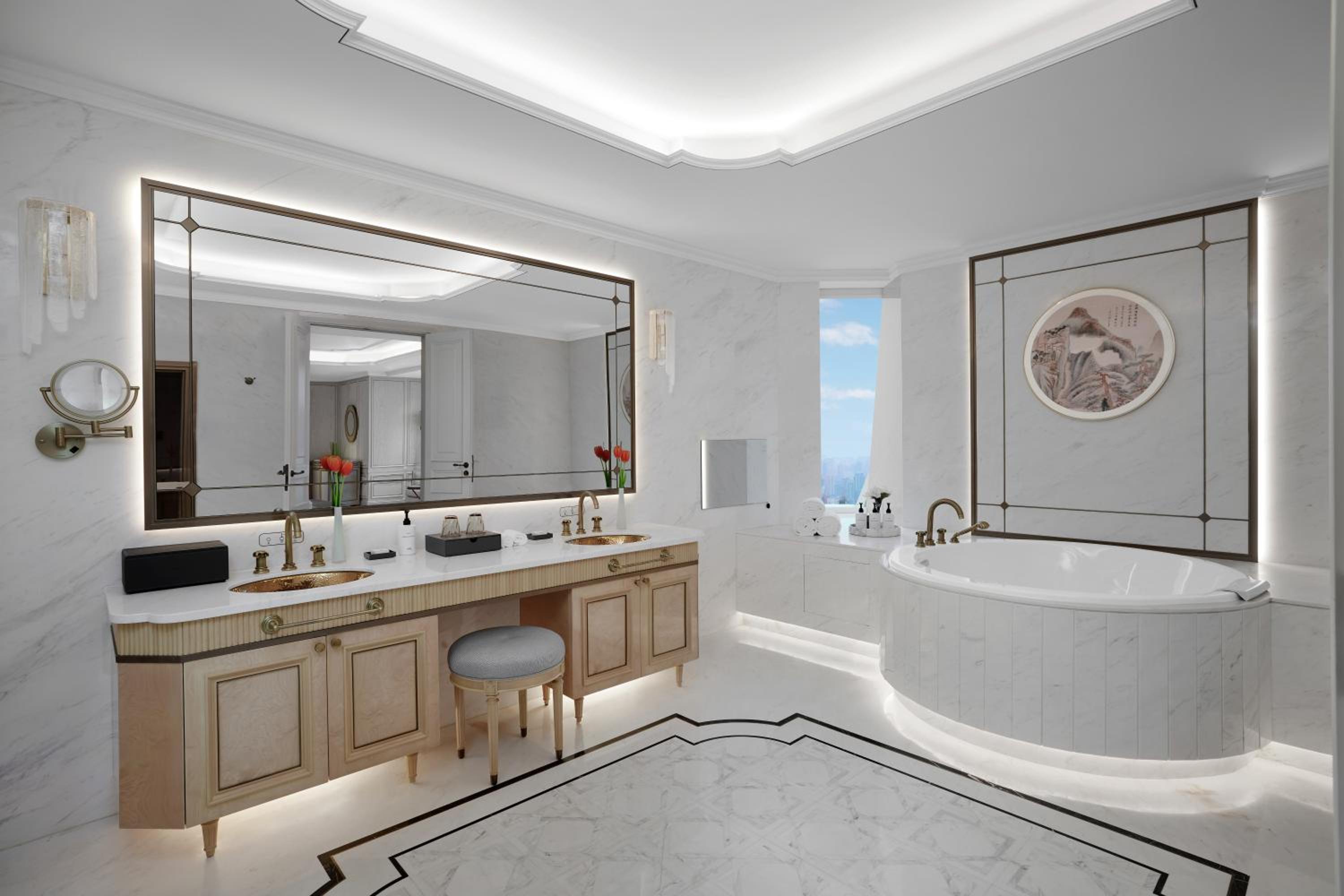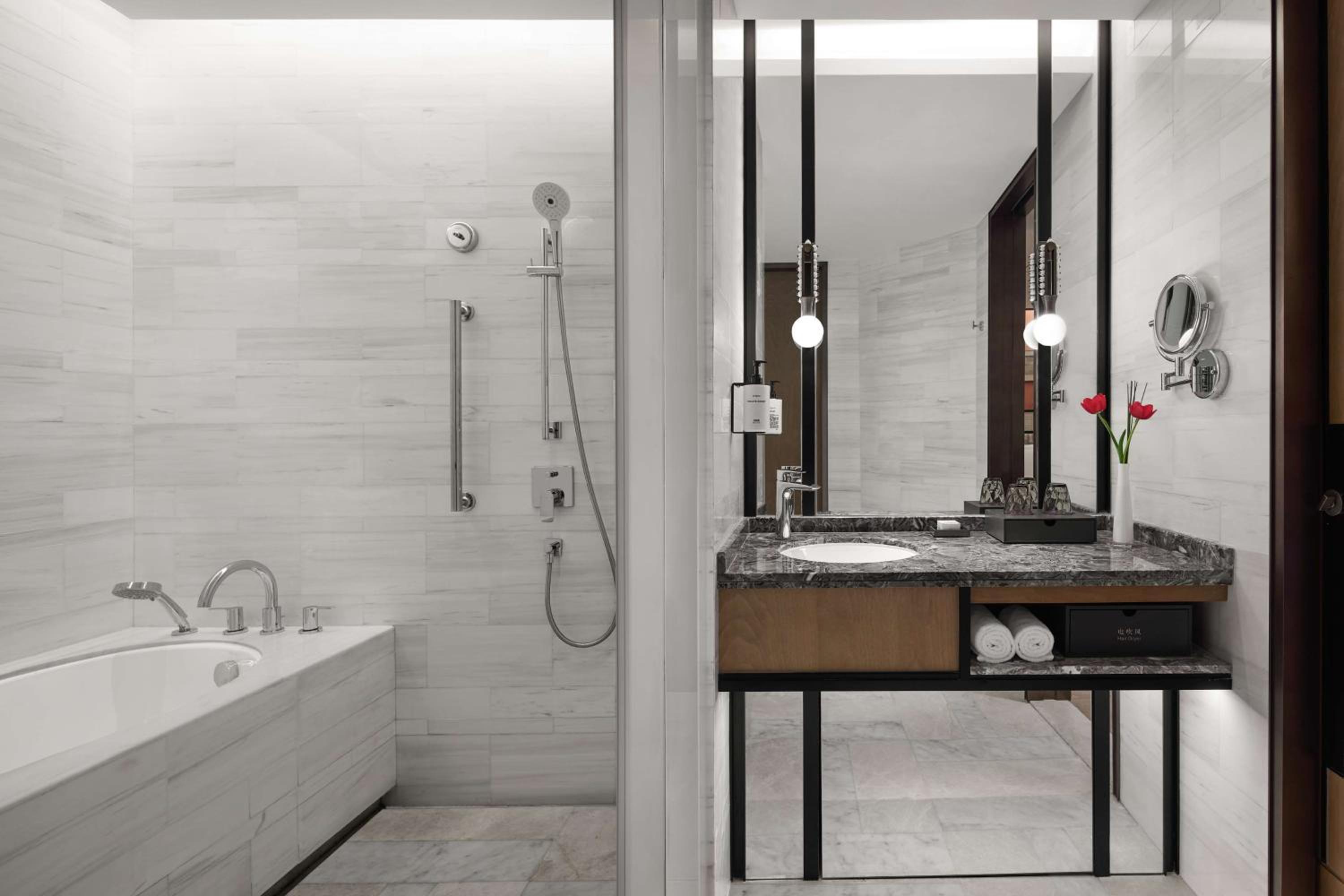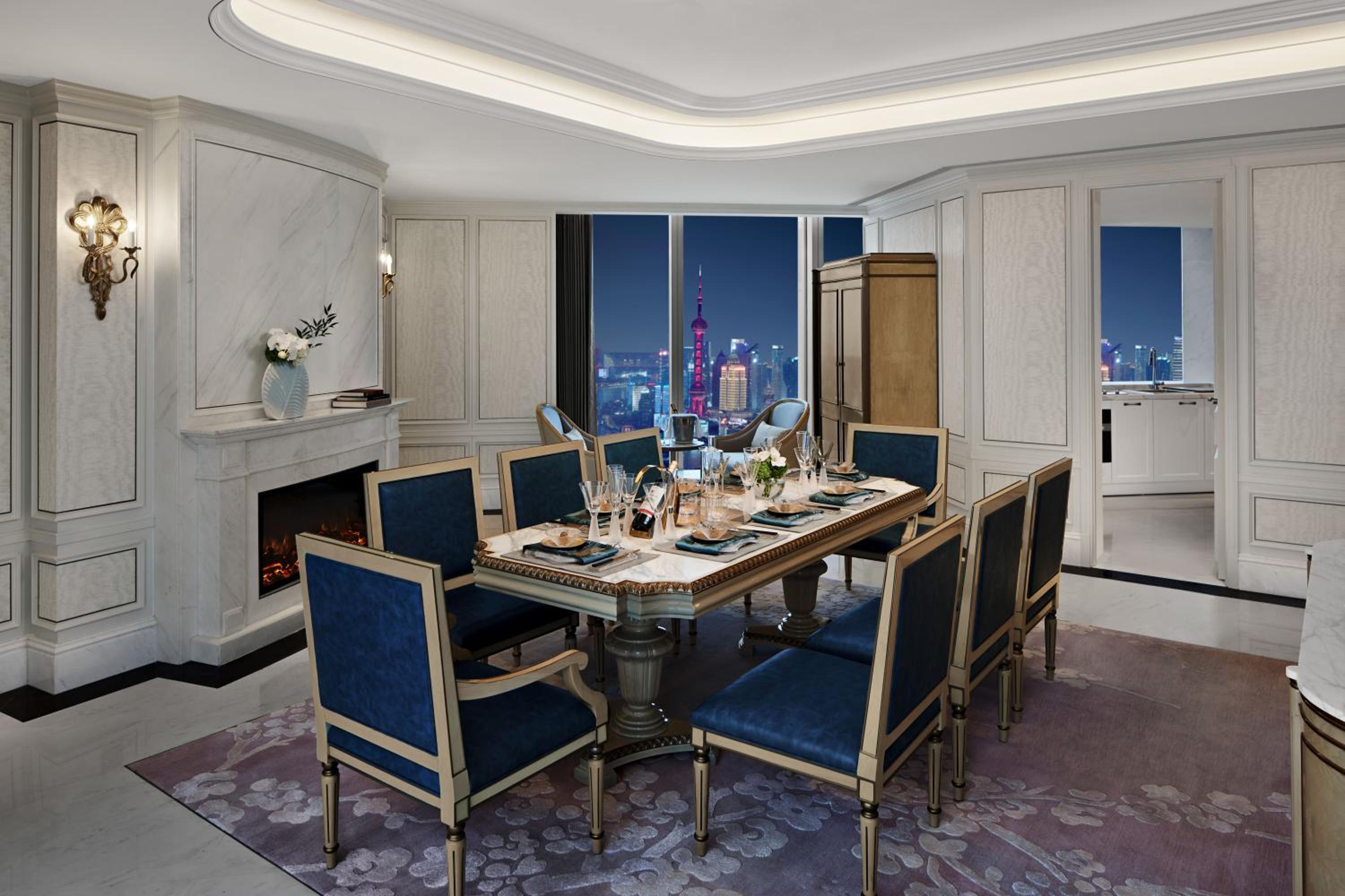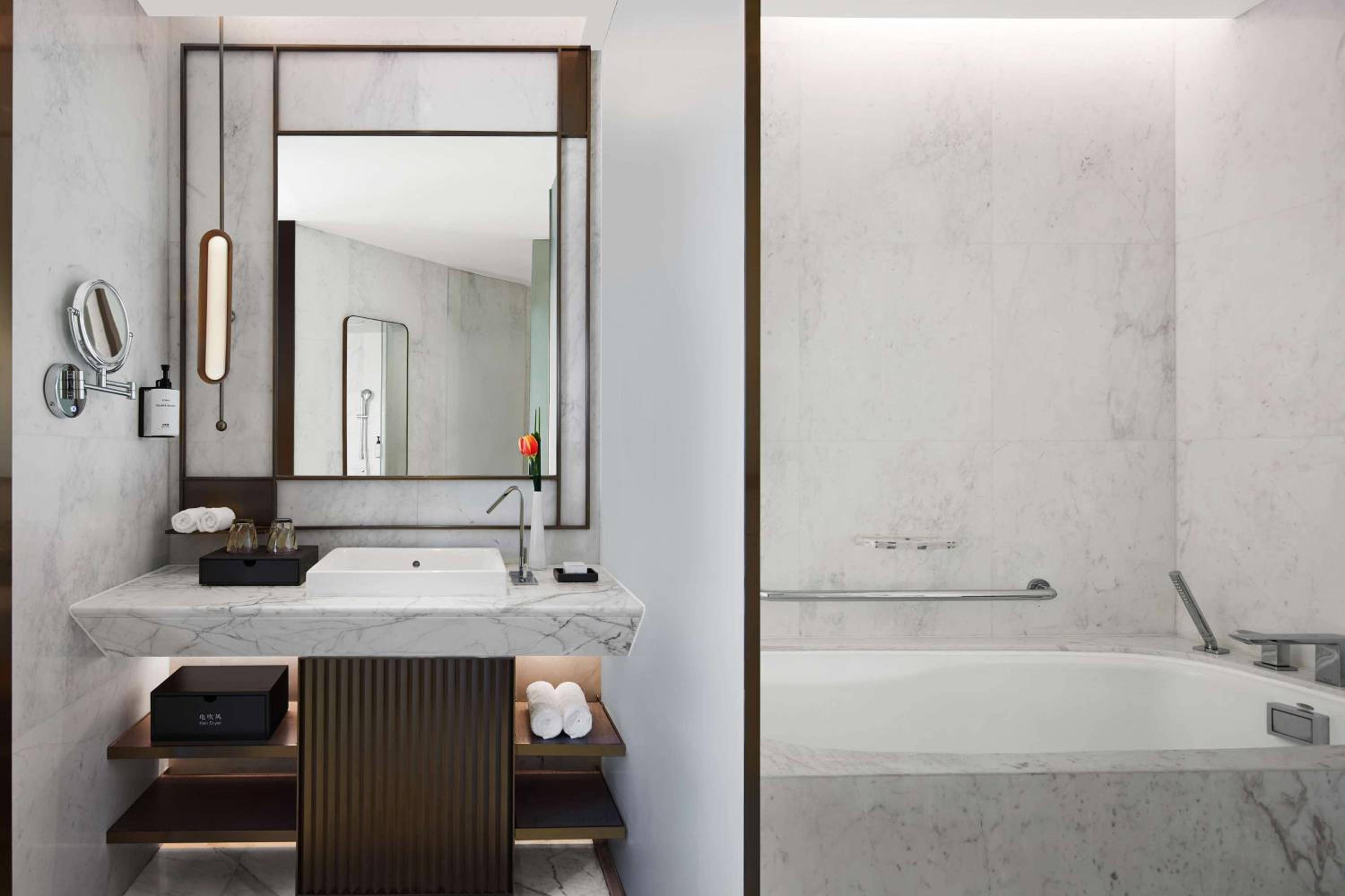 Situated in the heart of Shanghai, Conrad Shanghai offers stunning views of the city skyline from its elegantly decorated rooms with floor-to-ceiling windows. The royal ambiance is heightened by spacious marble bathrooms and cozy sitting areas, providing a truly luxurious stay.