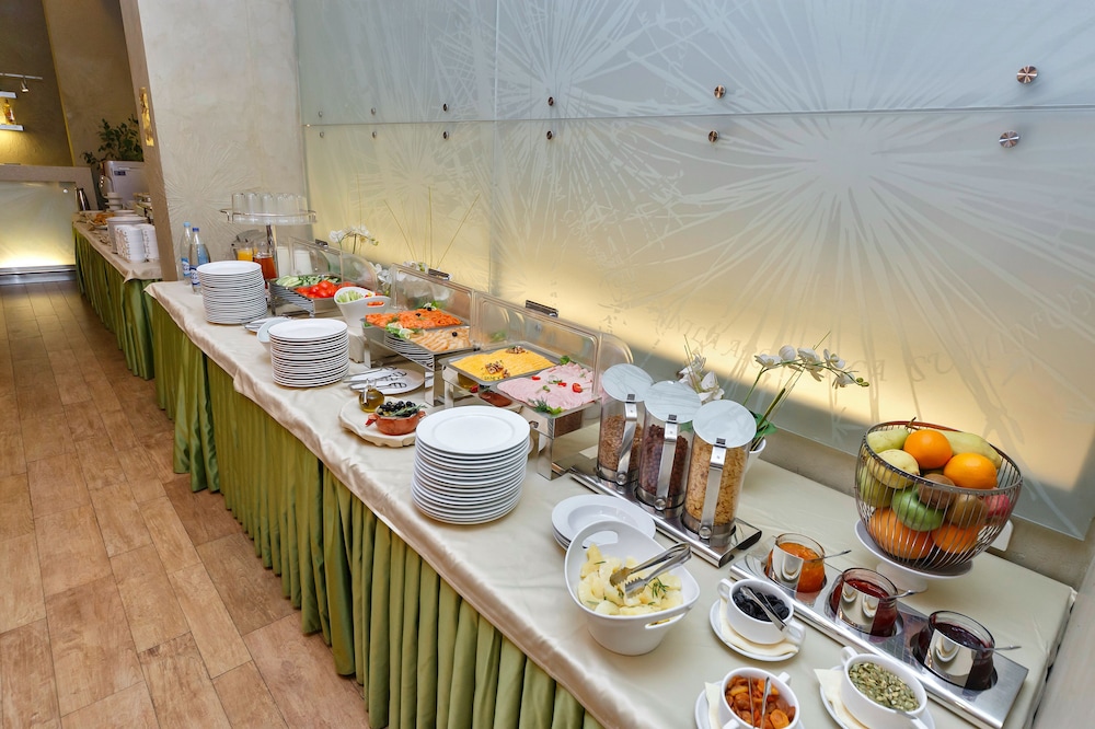 Breakfast amazing, servers super polite. Food wonderful, eggs, salad, lettuce, cucumbers, bacon, salmon, fruit, bread, buns, muffins, coffee machine, milk, porridge/oatmeal, little egg things, hard-boiled eggs, milk, etc. Super beautiful breakfast area. View on the terrace, lovely street with lovely buildings.