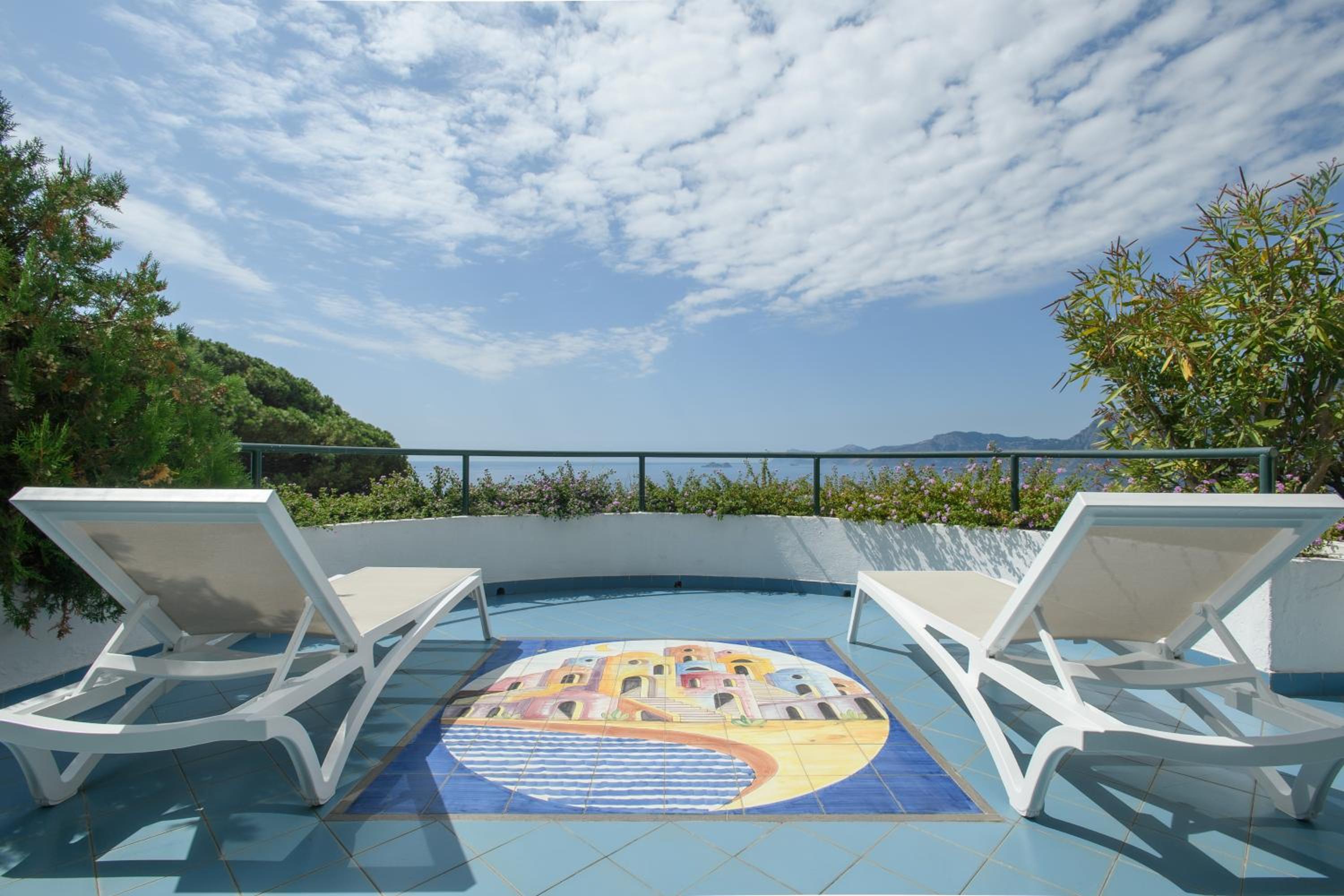 Relax in our air-conditioned rooms, each featuring a balcony with stunning sea views, including the enchanting sight of Capri in the distance.