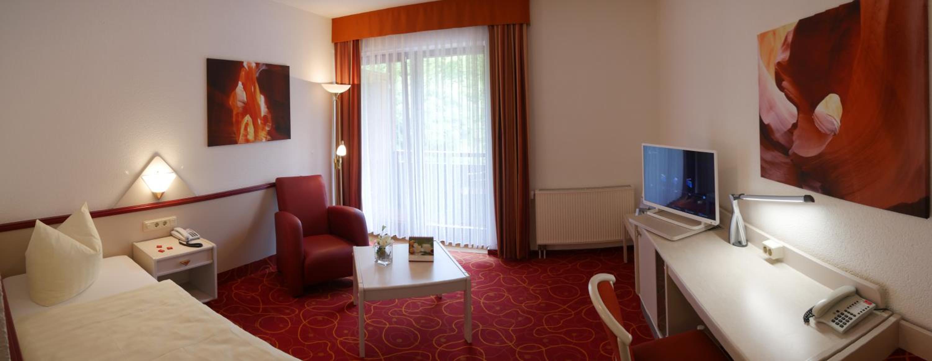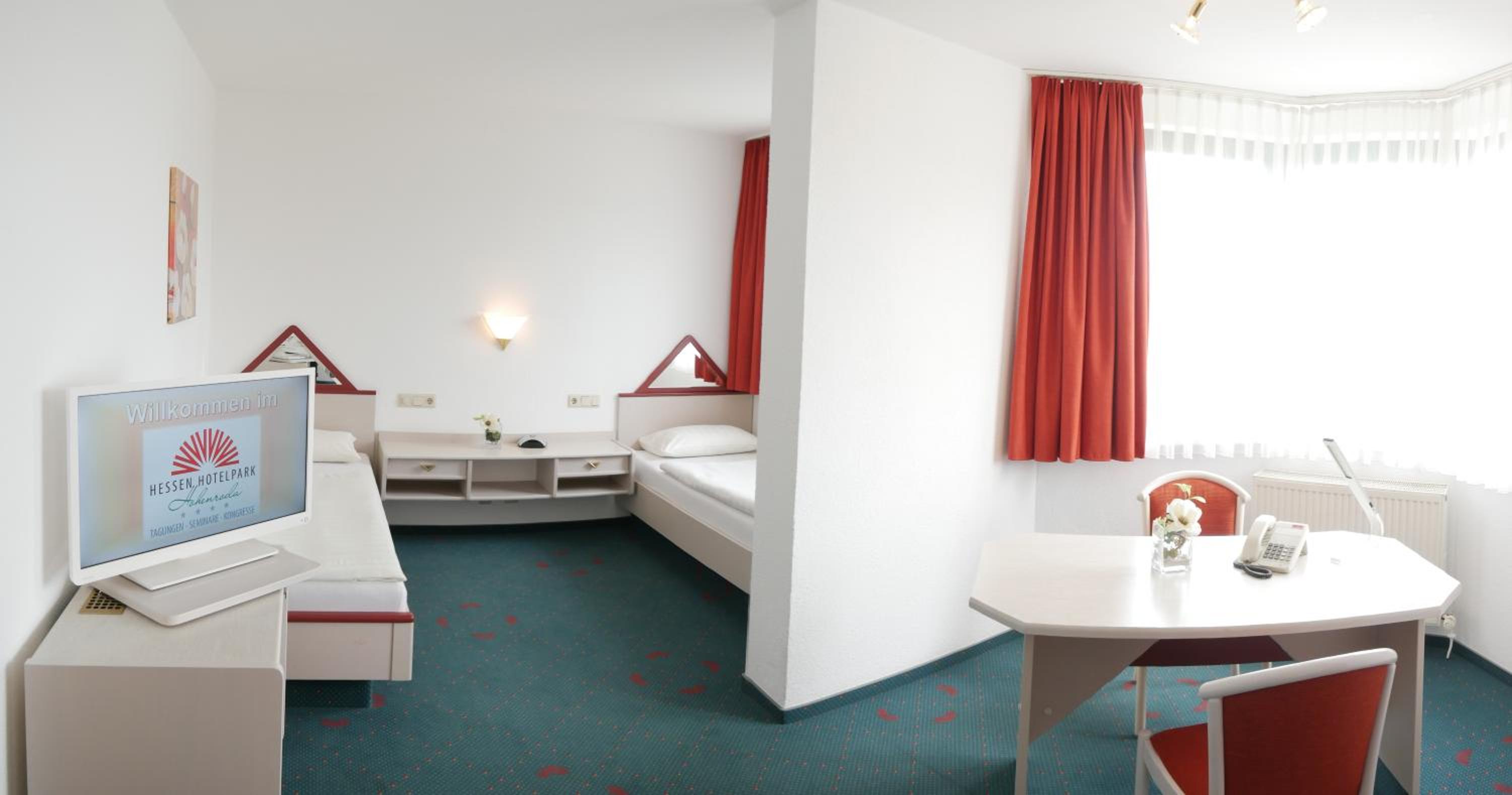Luxurious Accommodations: The Hessen Hotelpark Hohenroda offers non-smoking rooms with picturesque views of the forests or the lake, each equipped with modern amenities including free Wi-Fi, private bathrooms, and TVs.