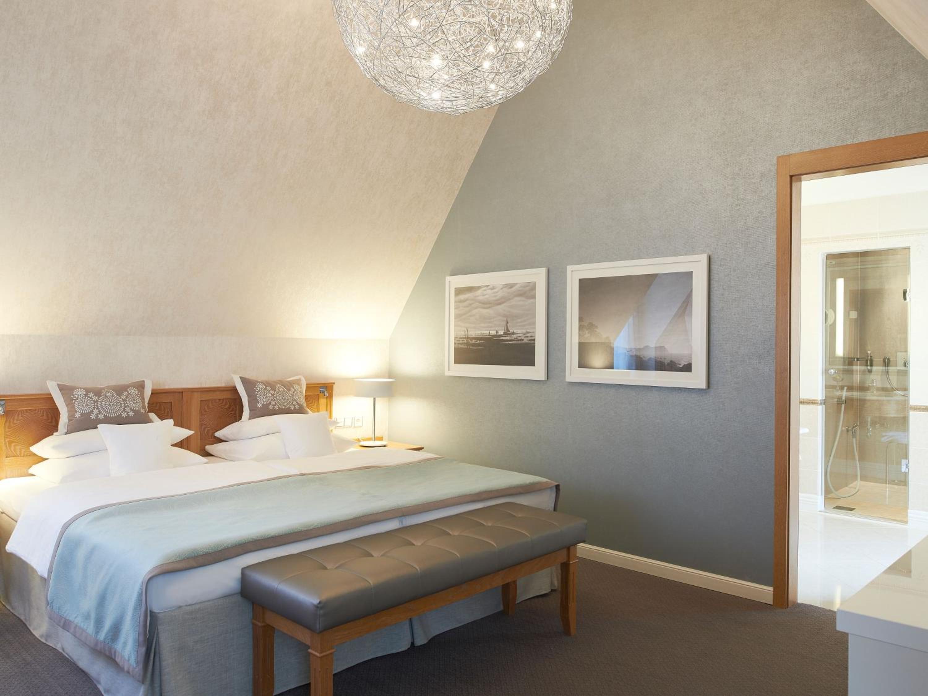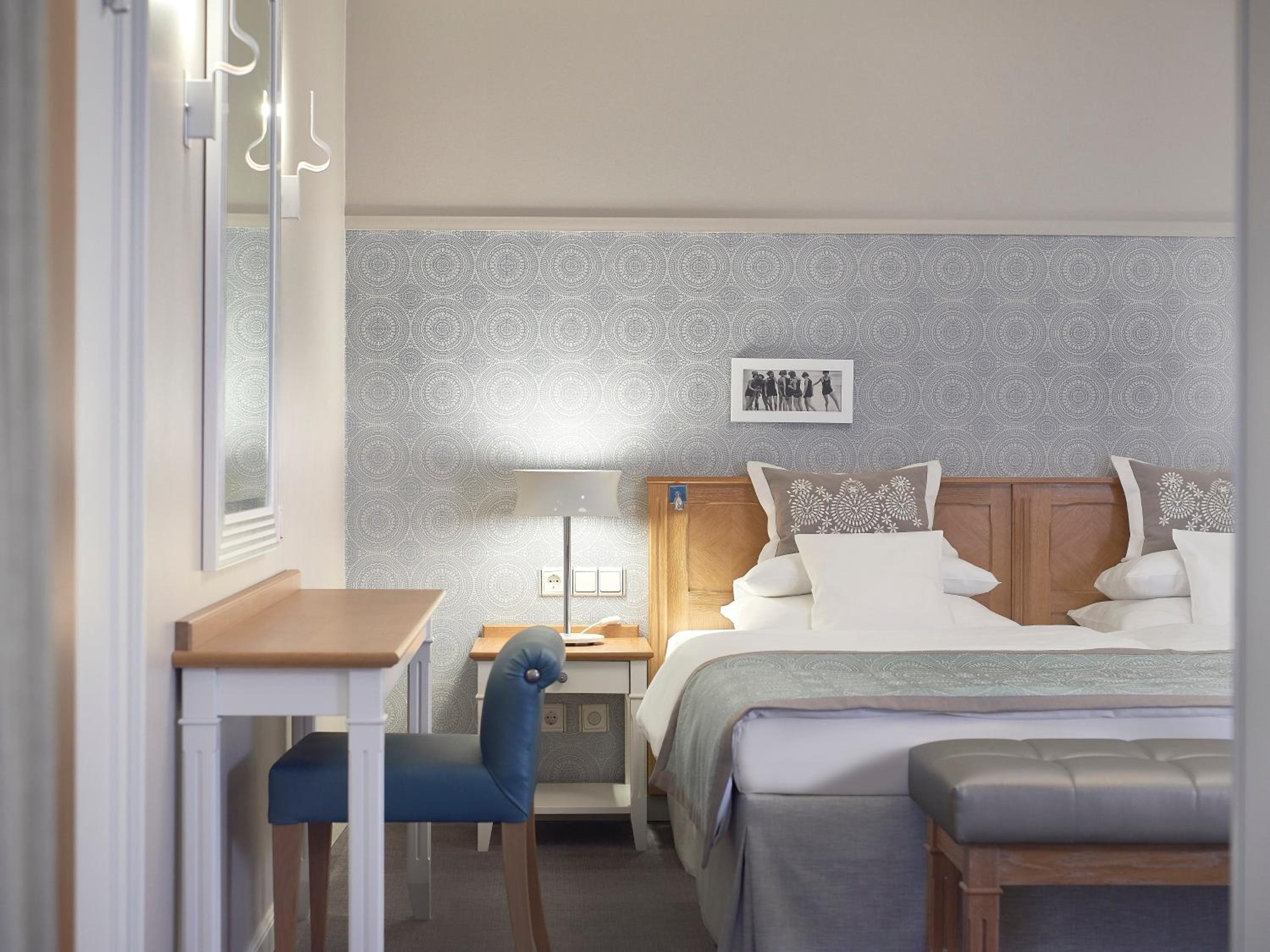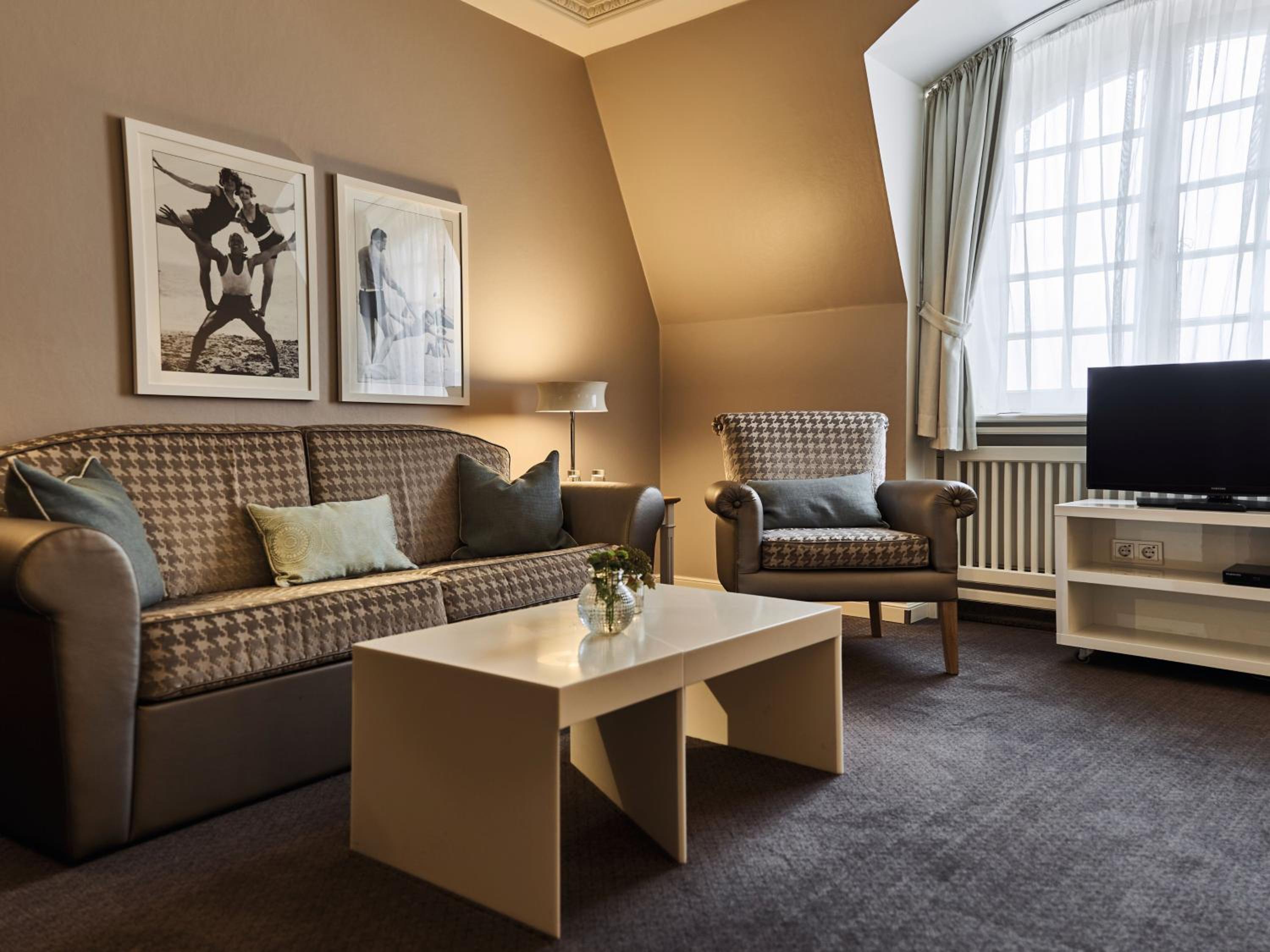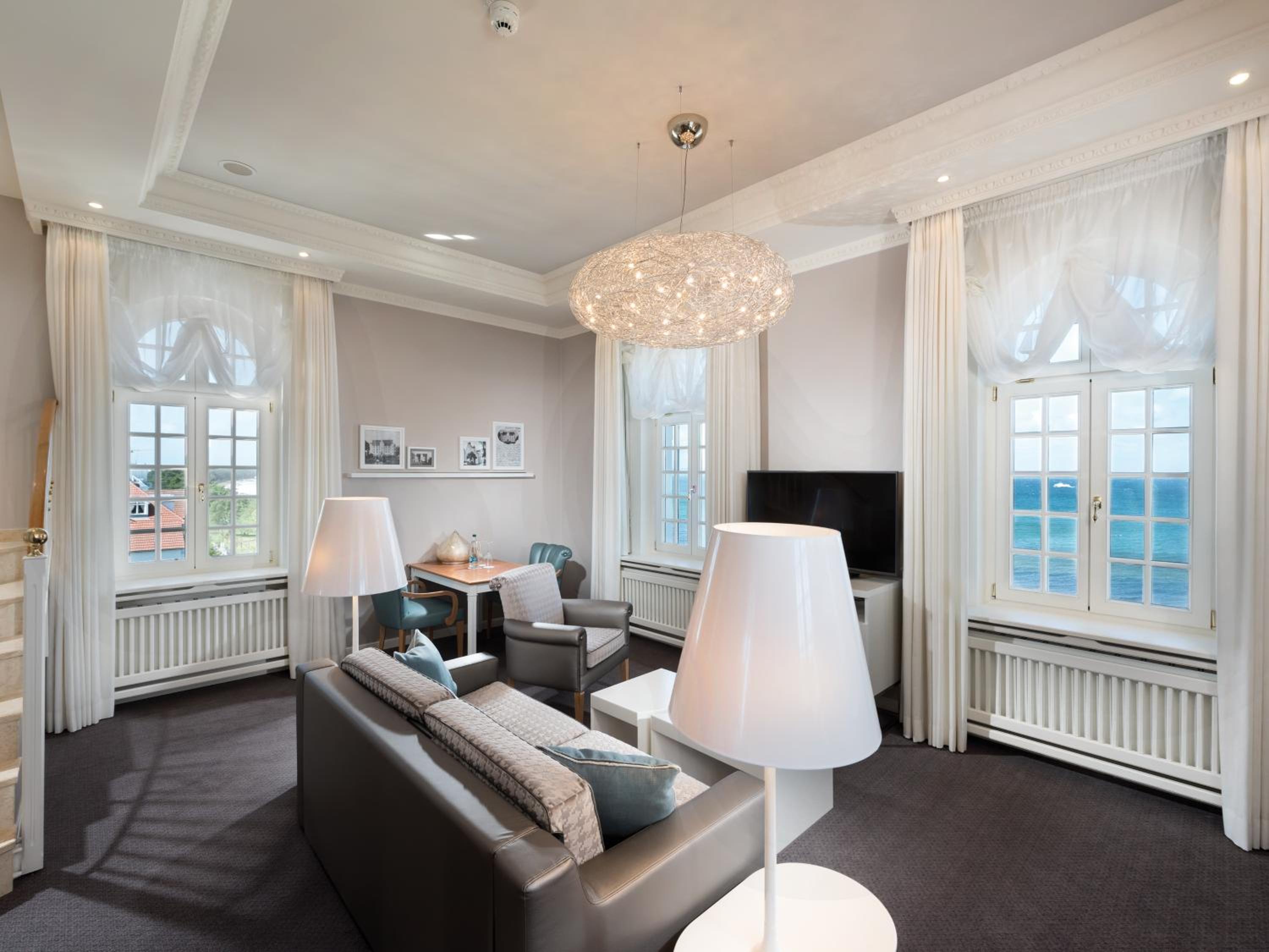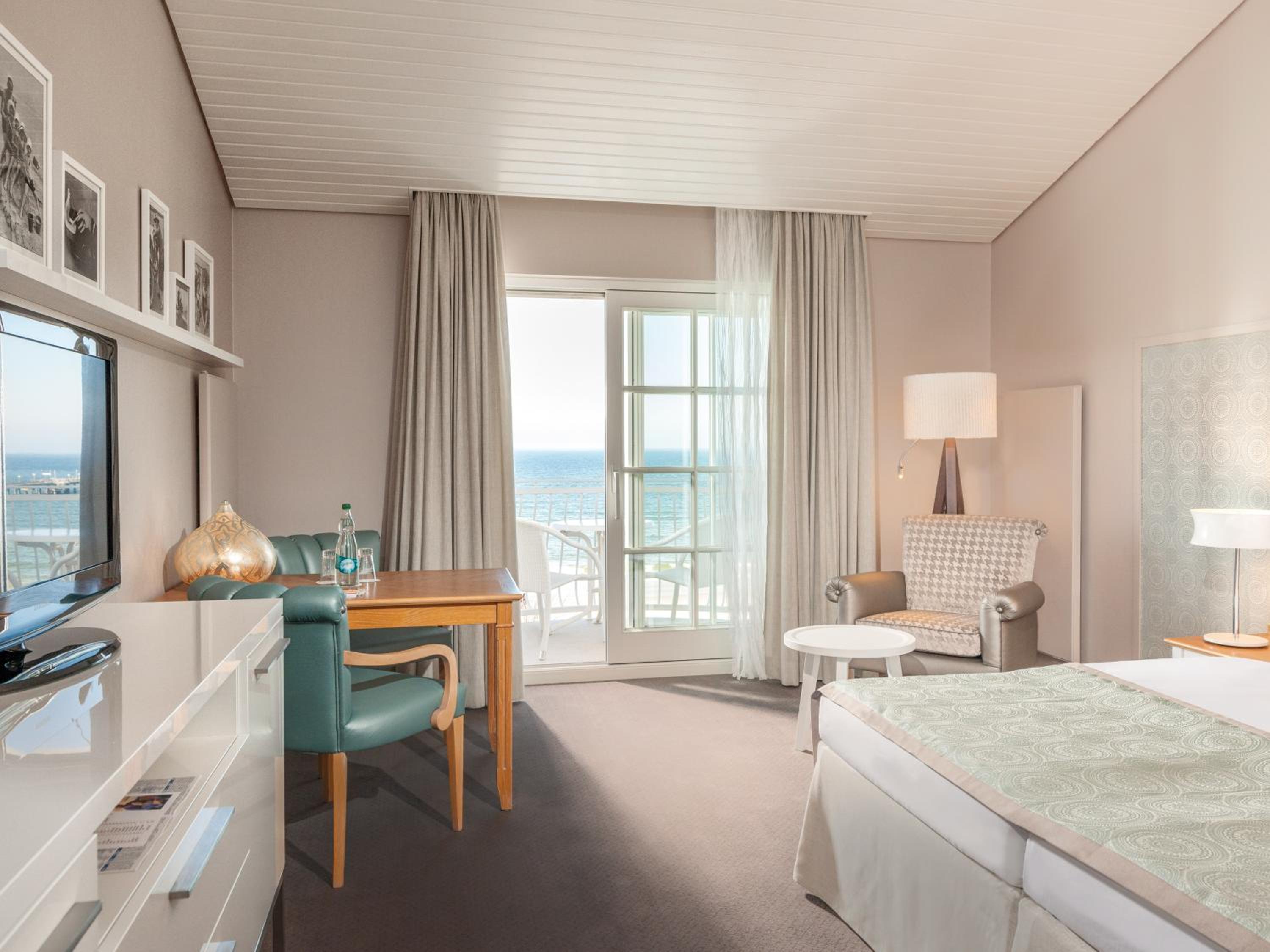 Experience elegance at its finest at Travel Charme Kurhaus Binz. Our rooms feature balconies, free wired internet, and overlook the picturesque Binz Beach and Pier. The classic beach-style architecture adds a touch of charm to our spacious non-smoking rooms and suites, all equipped with air conditioning and cable TV. Indulge in comfort with complimentary bathrobes and slippers provided.