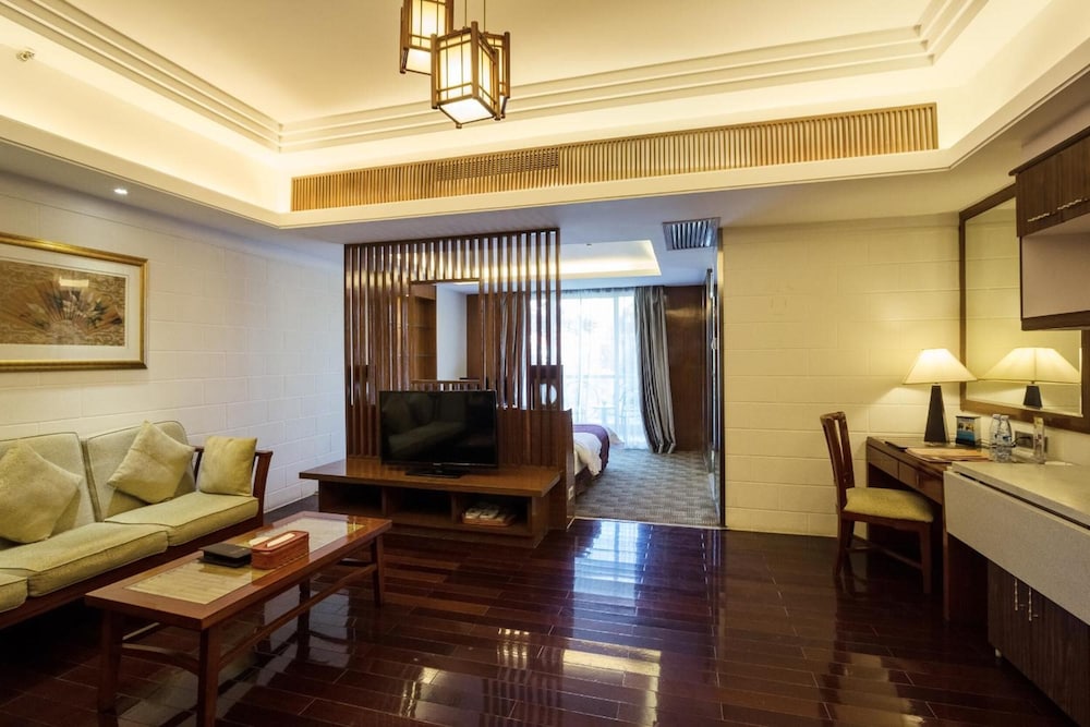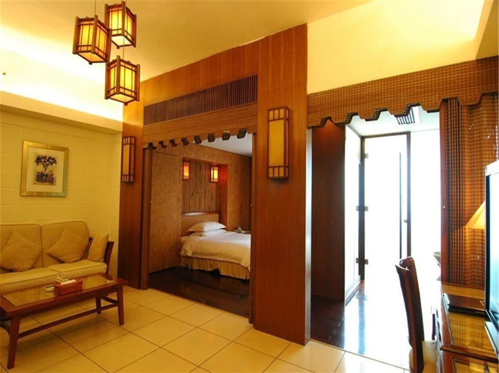 The hotel consists of two parts, the west wing and the main building. the main building rooms are FAR superior to the others so insist to stay in a rennovated room in the main building.If you are lucky enough to get a deluxe room overlooking the HUGE swimming pool, these are actually really nice rooms. ( sorry... 45 Chinese TV channels and not one in English ) Most of the staff speak very little English so be prepared. the beds are ROCK HARD in all the rooms. The hotel claims a western restaurant. Please dont be fooled. Its not. You have to pay and get a voucher for breakfast before dining . Secret ! they have a proper espresso machine behind the counter. you have to insist that you want it and that you are willing to pay ( 38 rmb) if you really want a reasonable coffe in the morning. Be aware that you are far from everything. taxi ride to city centre approx 40 rmb and depending on the traffic 30-35 mins.