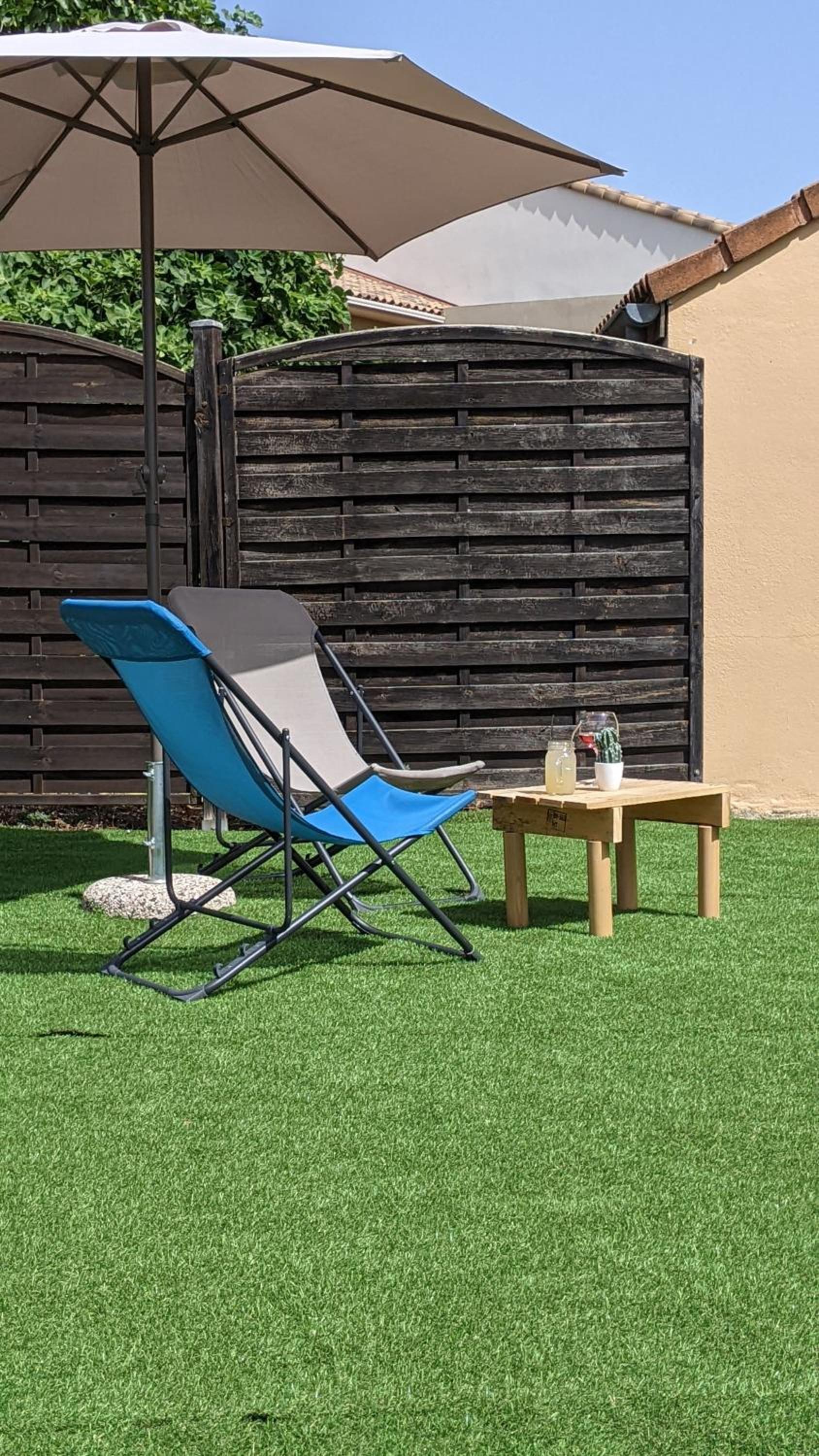 Mal tenu " jardin " herbes folles balustrades décrépies tapis complètement élimés on ne voit même plus leur couleur