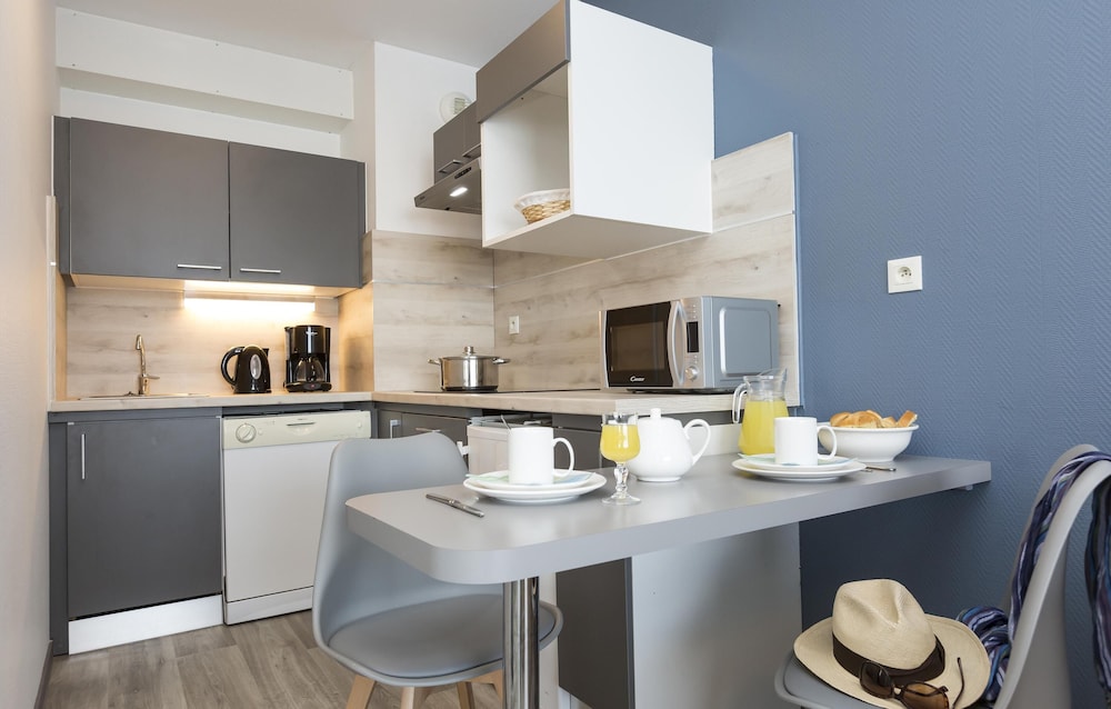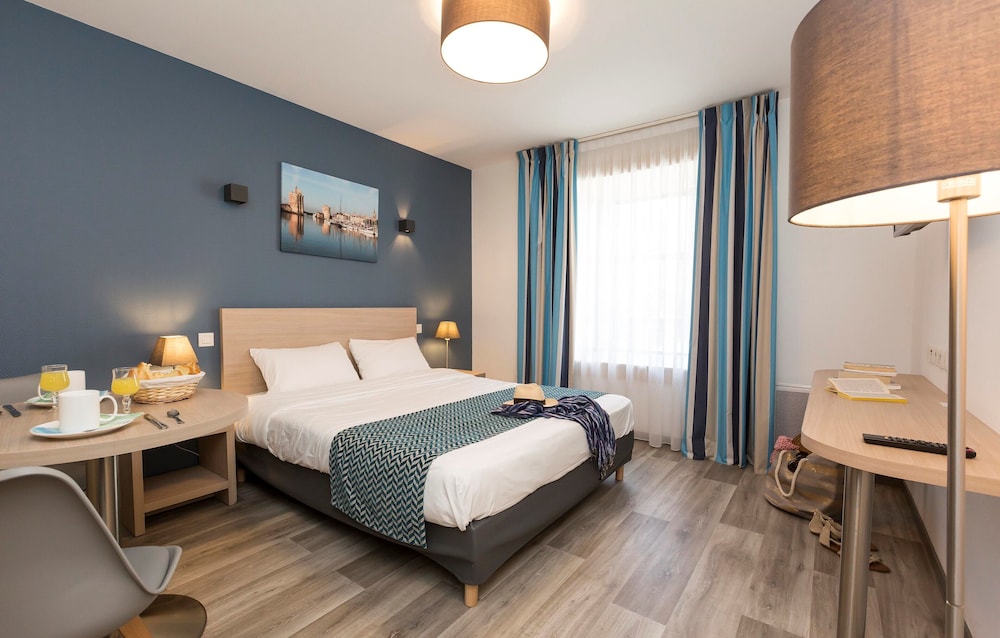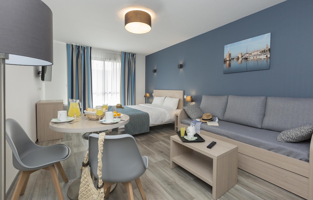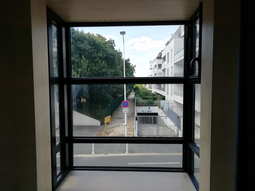 The hotel is situated in a quiet area, close to the old port, about 10 mins walk to terasses and restaurants, 20mins walk to the train station. There is a Carrefour 5 mins walk from the hotel which was handy. The apartment was very clean, AC was great as we went to La Rochelle right in the middle of the heatwave.We did have to buy consumables (shower gel, toilet paper, dishwasher tablets) but we knew that already before arrival. The kitchen is well equipped for a holiday, most days we had breakfast in the room. Pool is not too big but we always found empty chairs and could cool down a bit in the afternoon. Would book again next time.