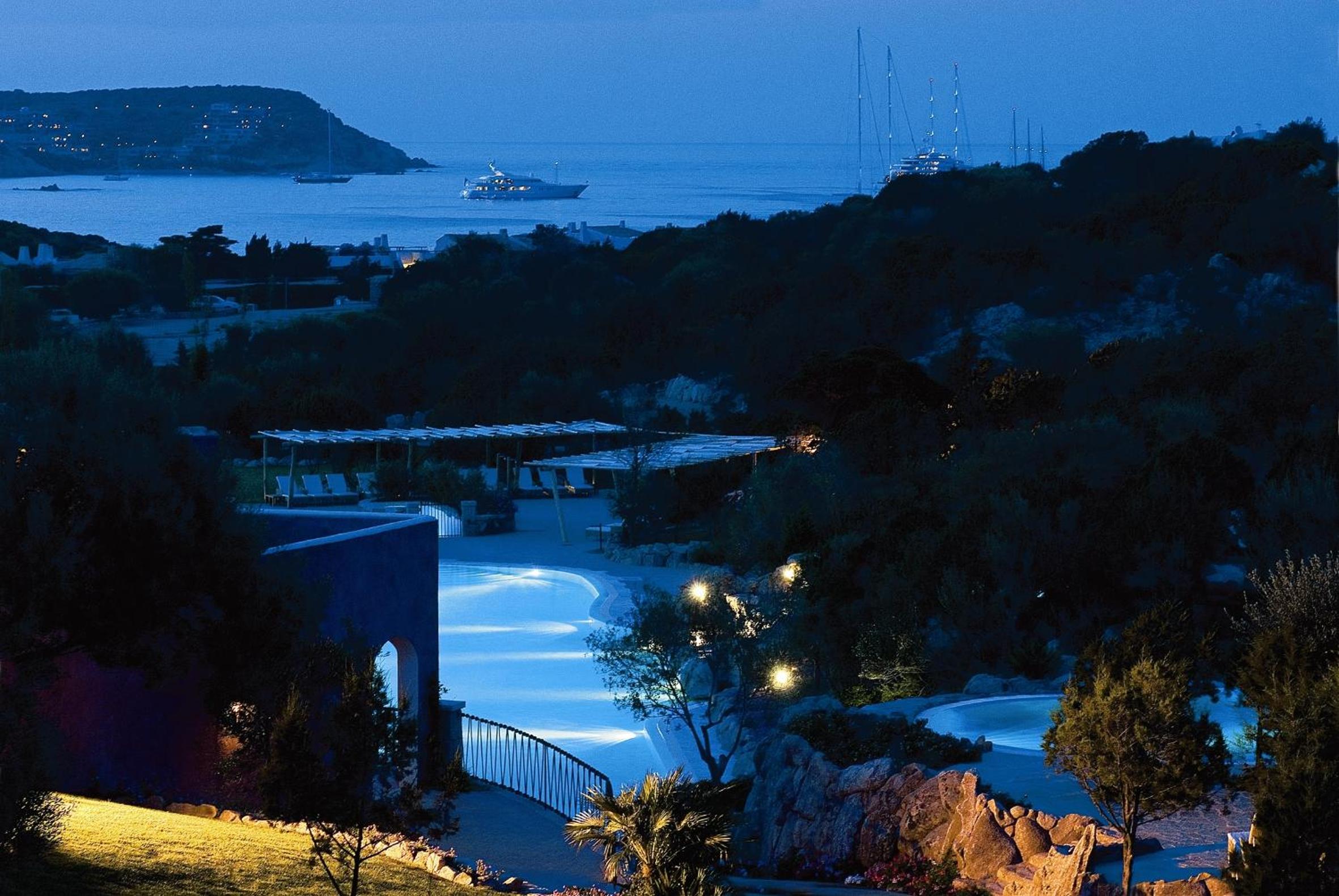 The hotel is on the hill above Porto Cervo marina .. it’s 5 or 6 mins in the hotel shuttle down to the bars and shops down there .