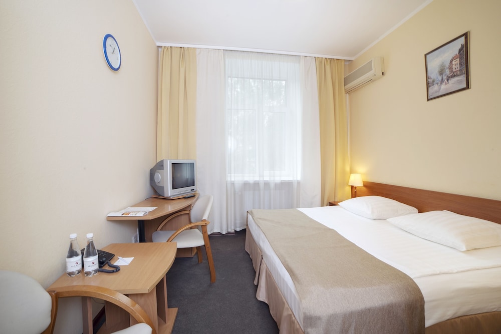 The staff were very friendly, helpful and spoke English. They can provide a map and suggestions of what to see in Moscow. The room was clean and a good size with air conditioning, a fridge and a desk. There was a hairdryer in the bathroom but no toiletries. The TV had a few international channels.