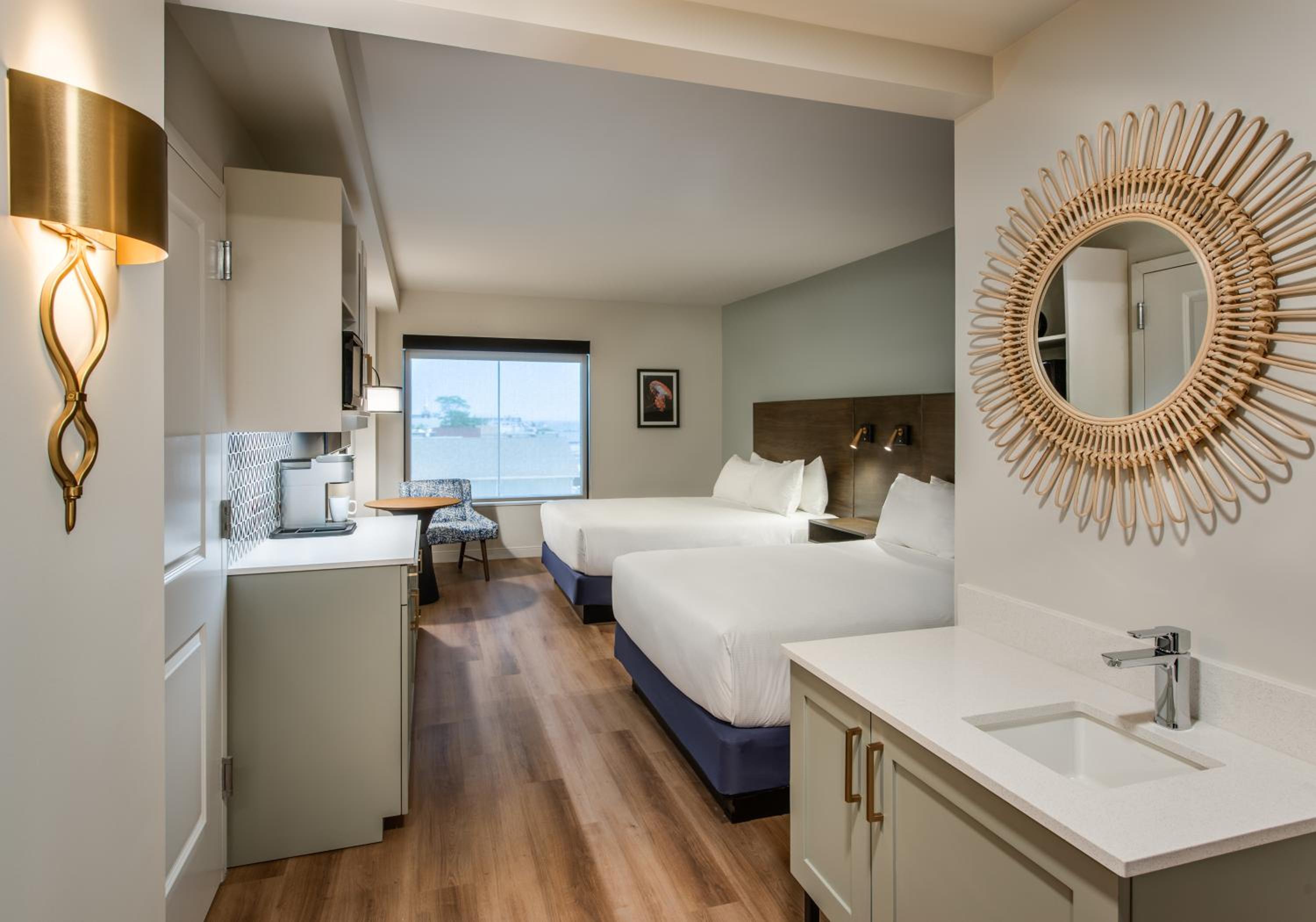 Indulge in our coastal modern accommodations featuring luxurious bathrobes, a wet bar, and premium bathroom amenities. Enjoy complimentary bottled water and local coffee from Rise Up with our Keurig Coffee Maker.