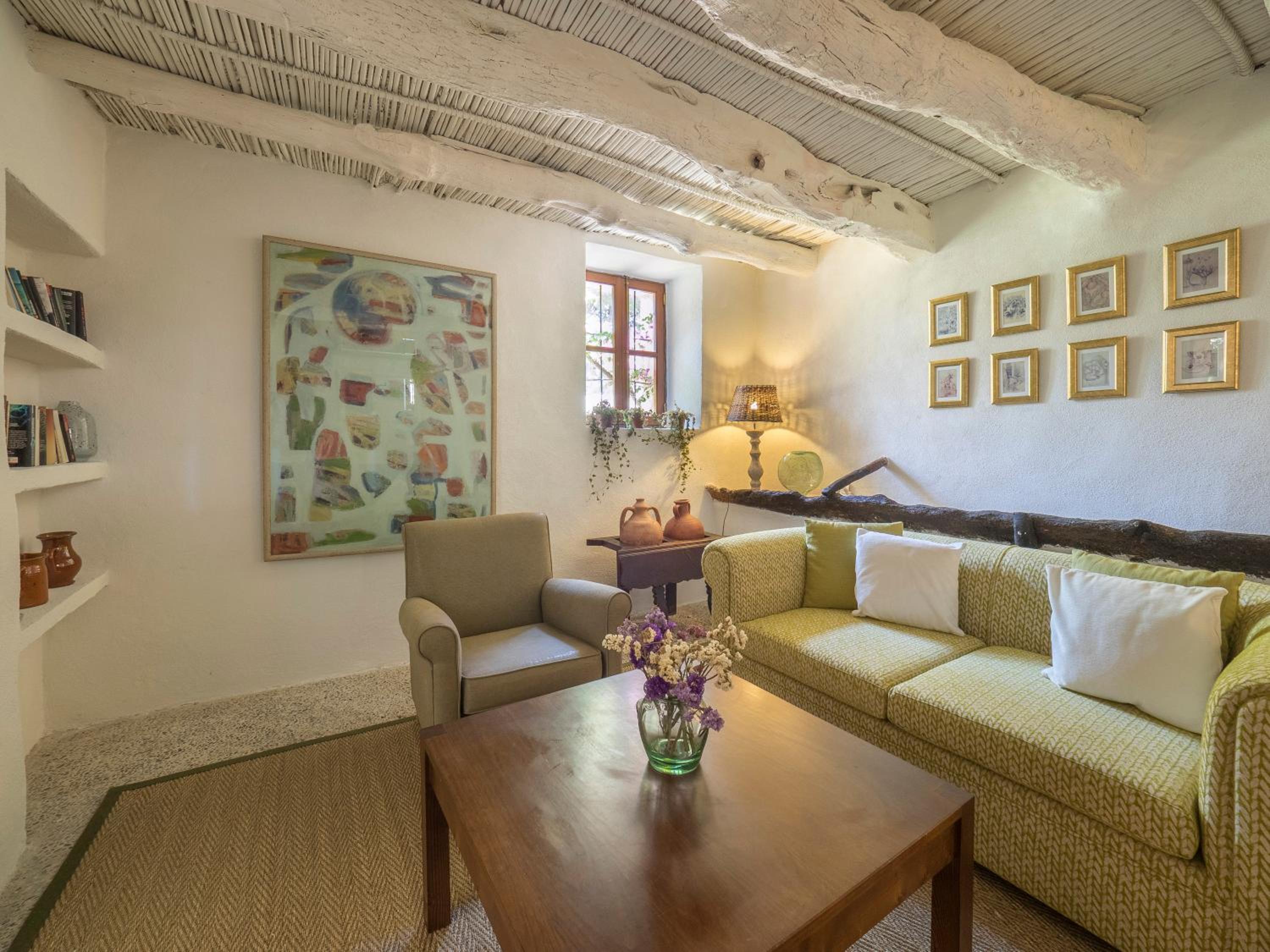 Artistic Interiors and Mediterranean Feel: Admire the fine art pieces against the rustic stone walls and relax in a room that exudes Mediterranean vibes with terracotta tiles and antique furnishings.