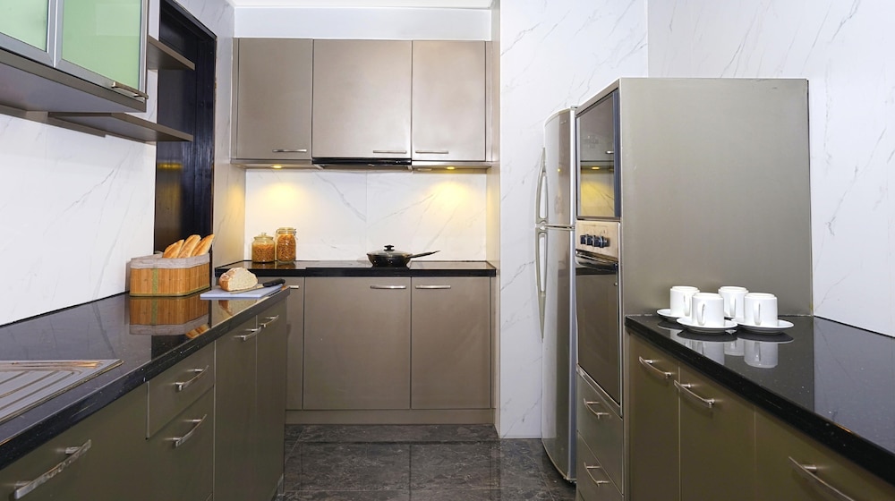 Had a kitchen, washing machine with the nice service of providing washing up liquid, sponge, and detergent enough for 2 cycles. Plus, there’s a mini store in the basement that stocks basic supplies, so great for extended stays