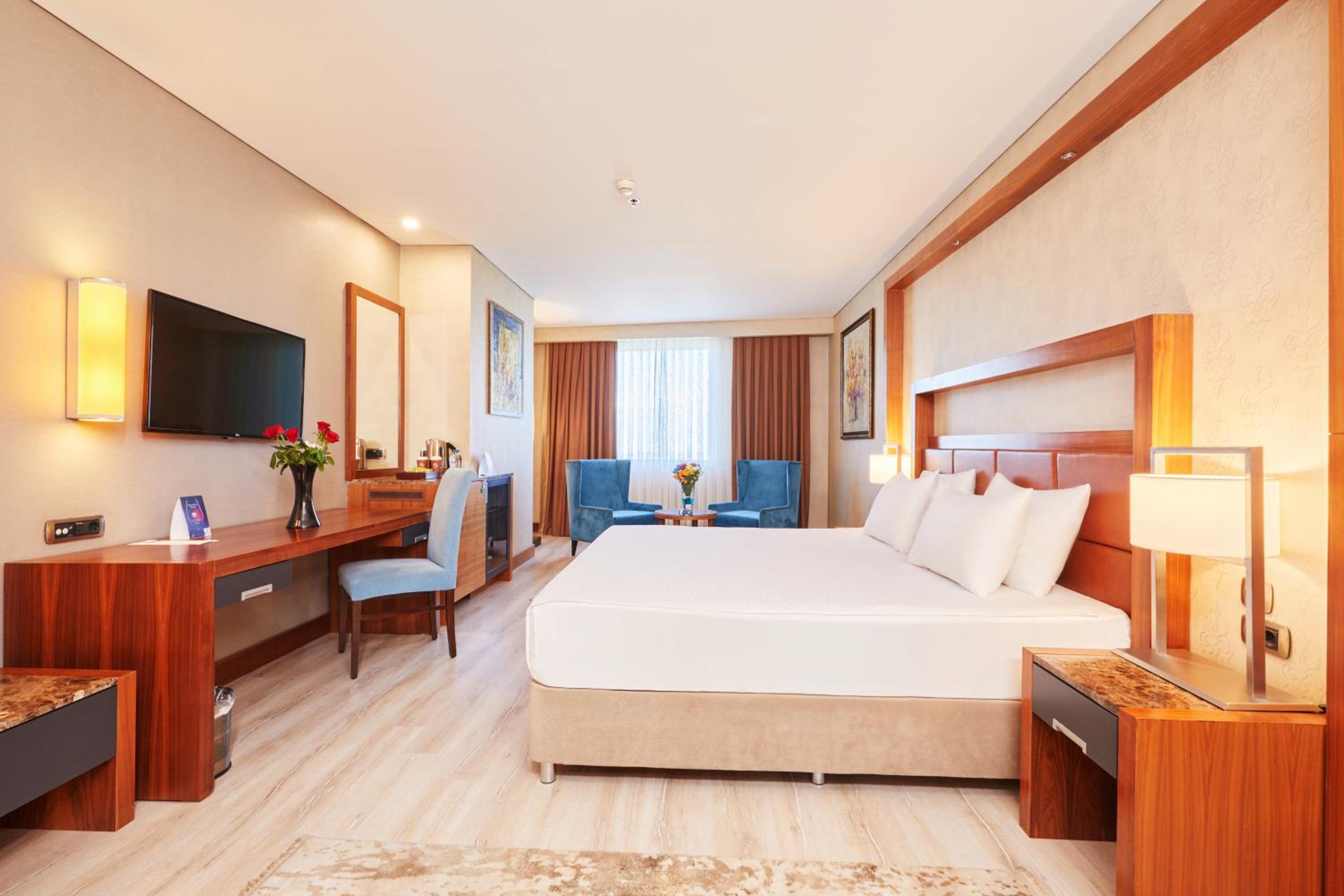 Culinary Delights: Indulge in Turkish and International cuisine at the elegant Safran Restaurant or savor panoramic city views at the Roof Restaurant and Bar. 24-hour room service ensures you can satisfy your cravings anytime.
