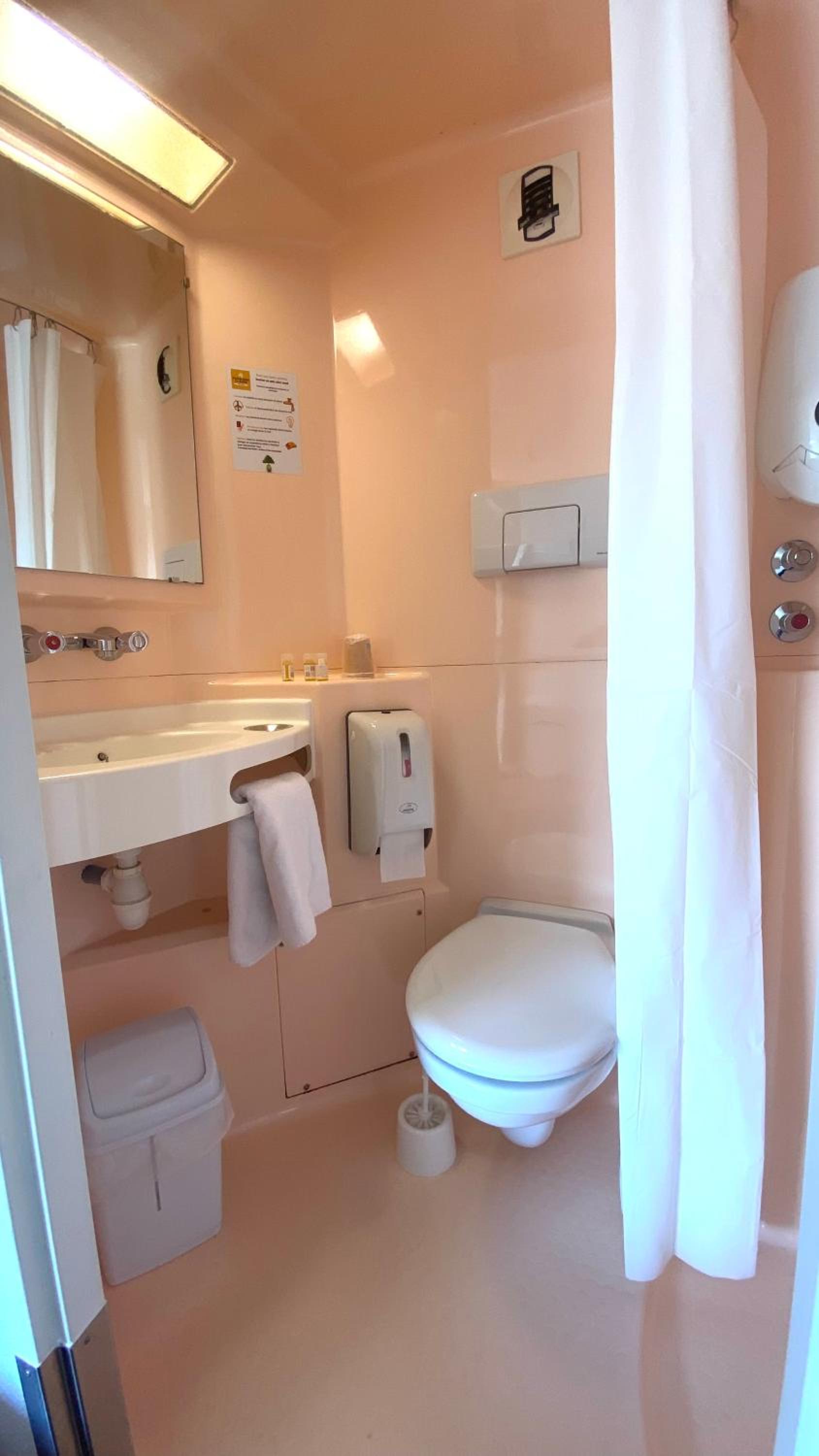 Chambre propre dans l'ensemble, salle de bain il y avait la trappe de ventilation qui était défaite et trainait sous l'évier et une autre partie près des toilettes. A 23h30, il y avait des personnes qui se croyait seuls au monde.