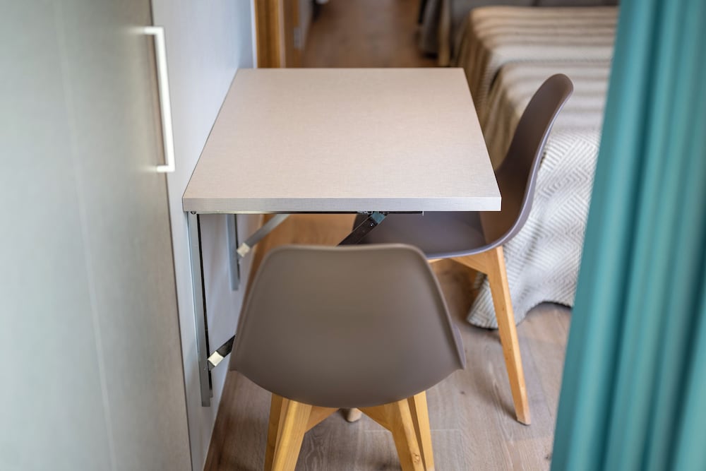 The room was tiny and if the wall table was up for use you couldn't get access to the kitchen area unless you crawled under the table.
