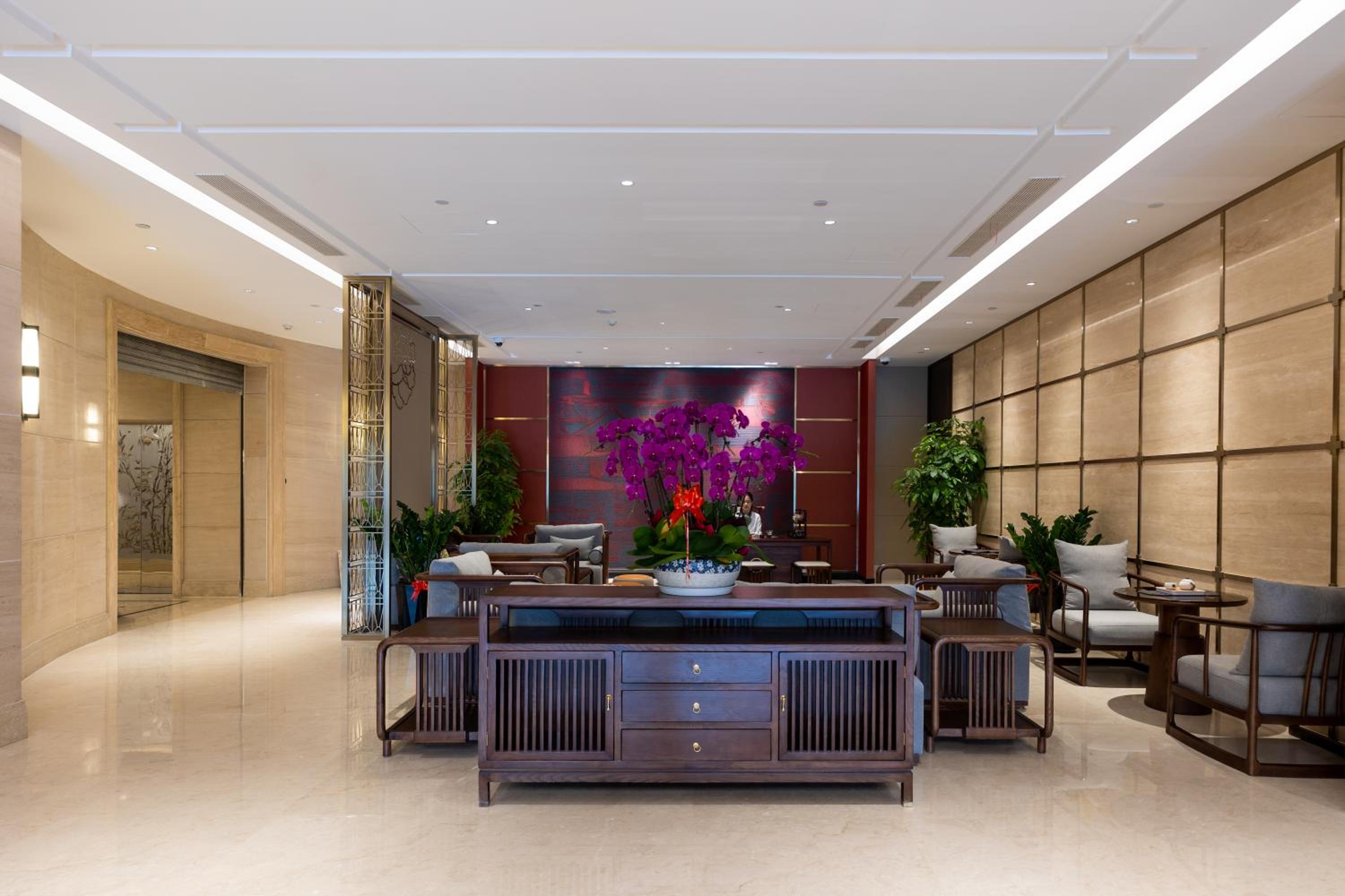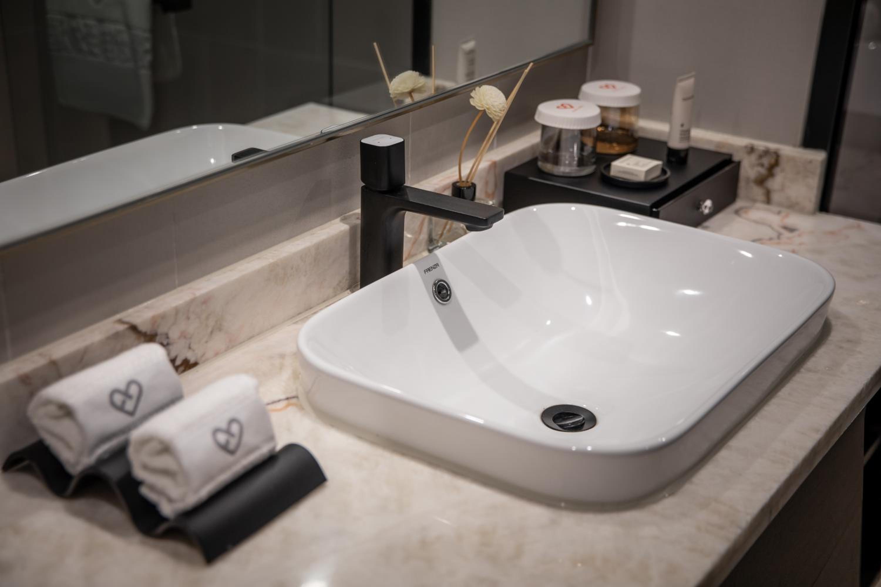 The hotel offers spacious rooms with modern décor and individually designed suites featuring Oriental accents and premium toiletries, ensuring a comfortable and upscale stay for guests.