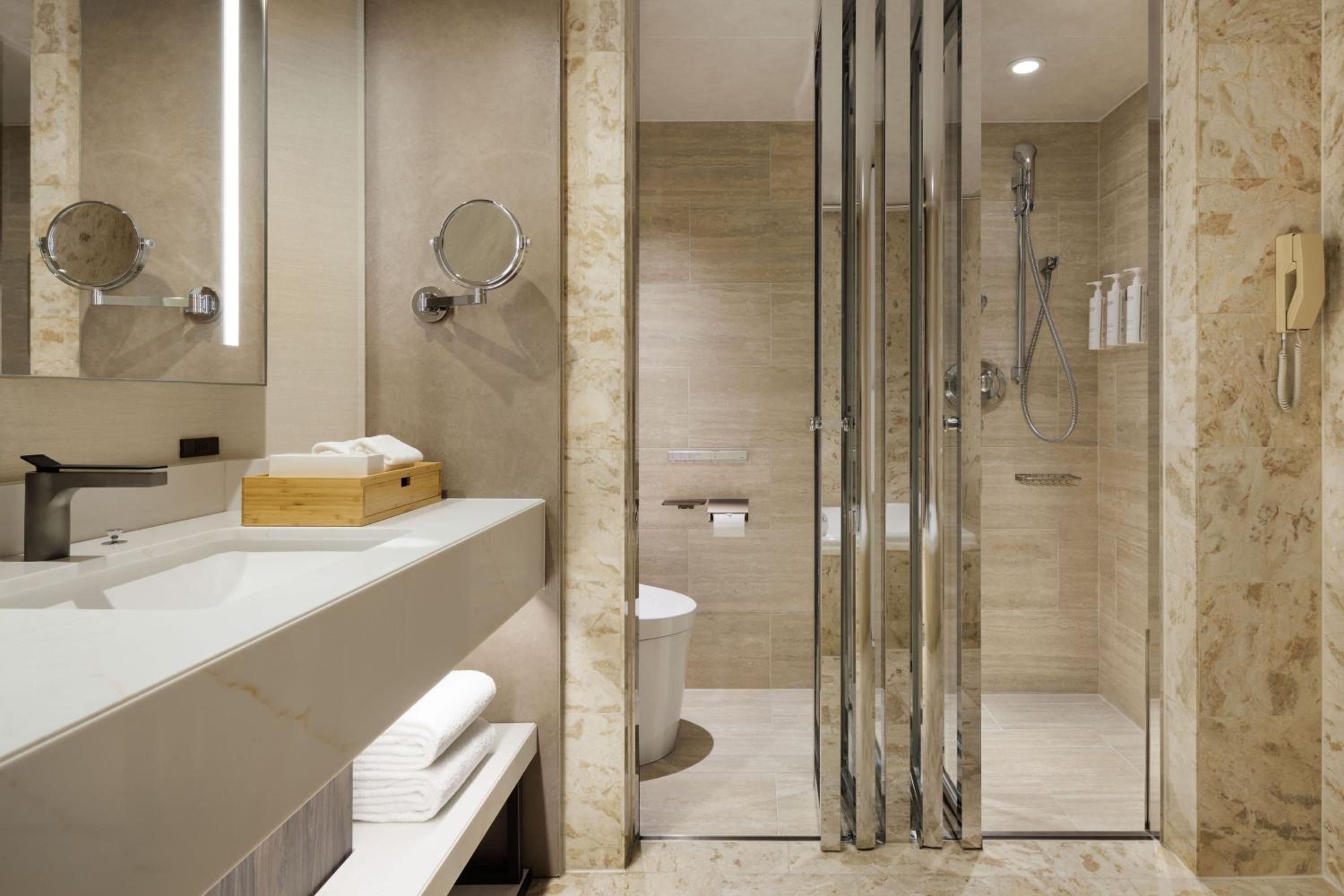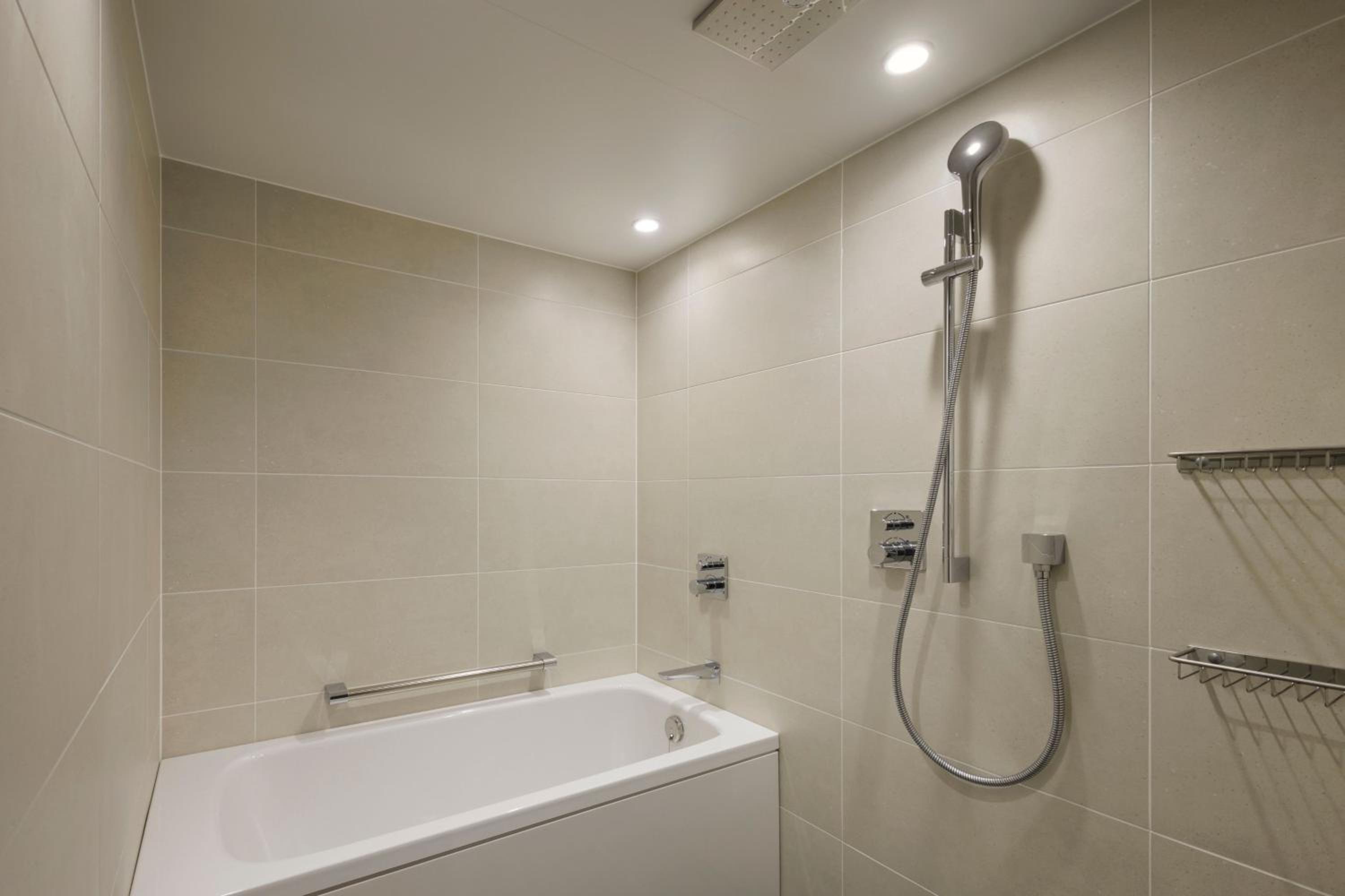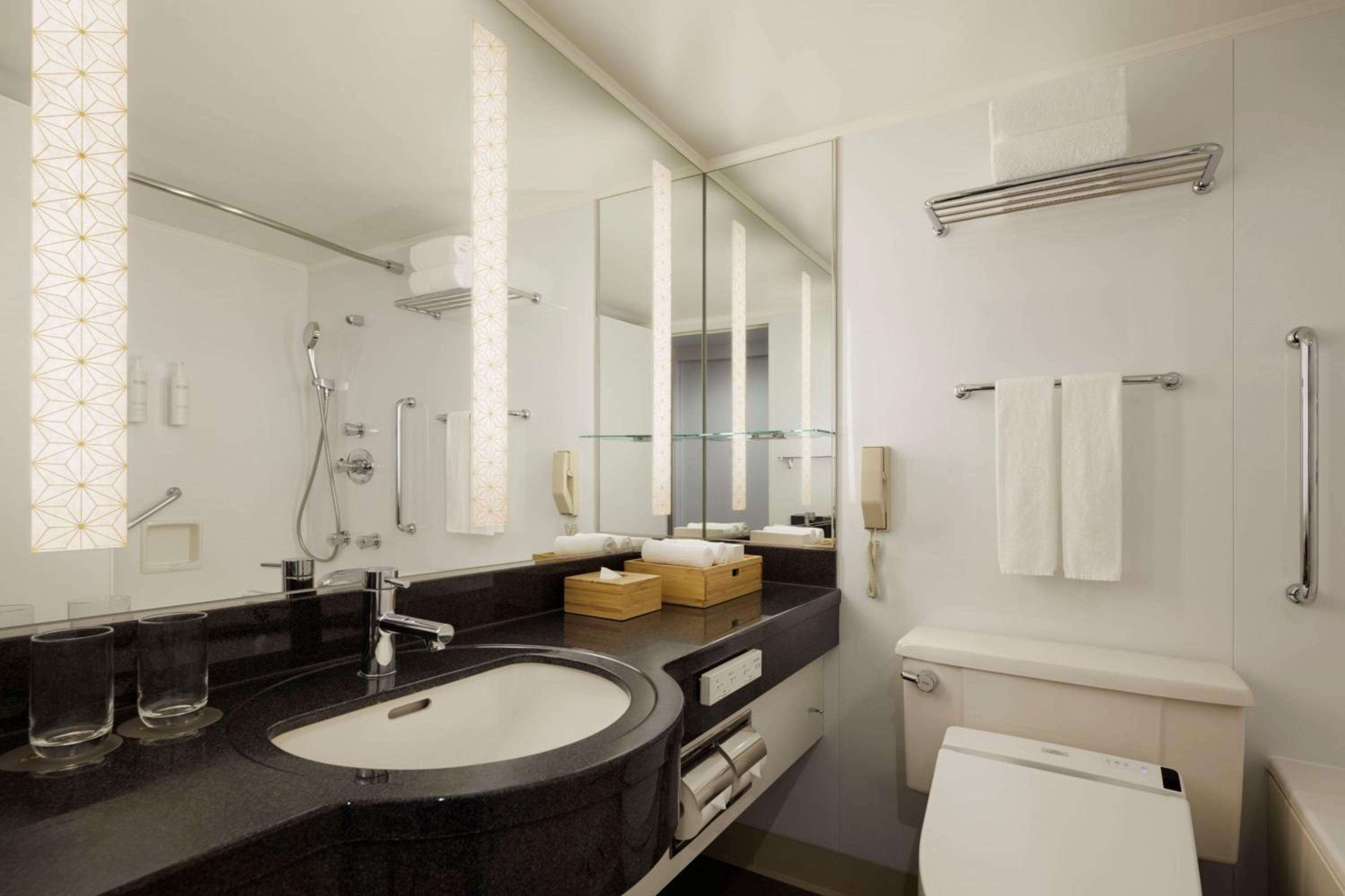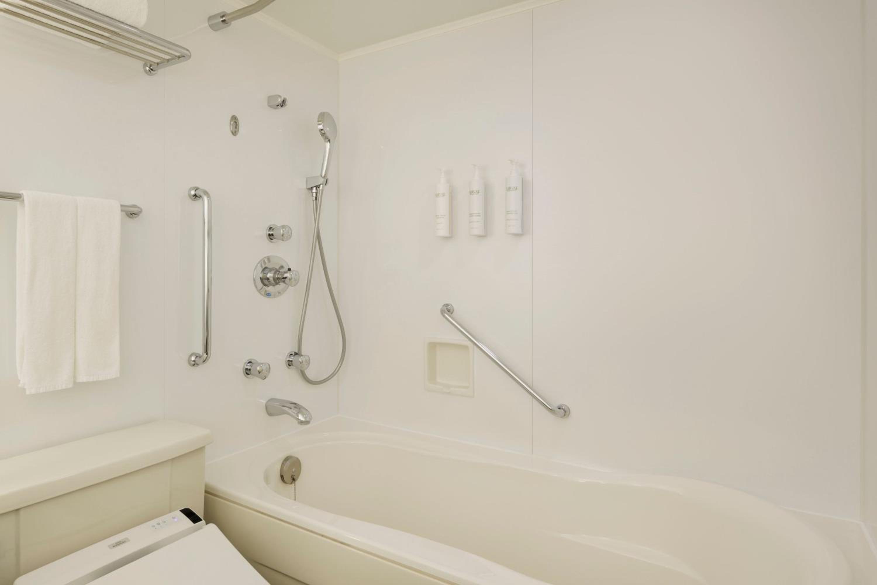 The air-conditioned rooms at Courtyard by Marriott Tokyo Ginza Hotel are designed with relaxation in mind, featuring soothing colors, wood-veneer walls, and essential amenities such as a tea maker, flat-screen TV, and minibar. Guests can unwind in plush slippers and a cozy bathrobe, while the attached bathroom includes a bathtub for added comfort.