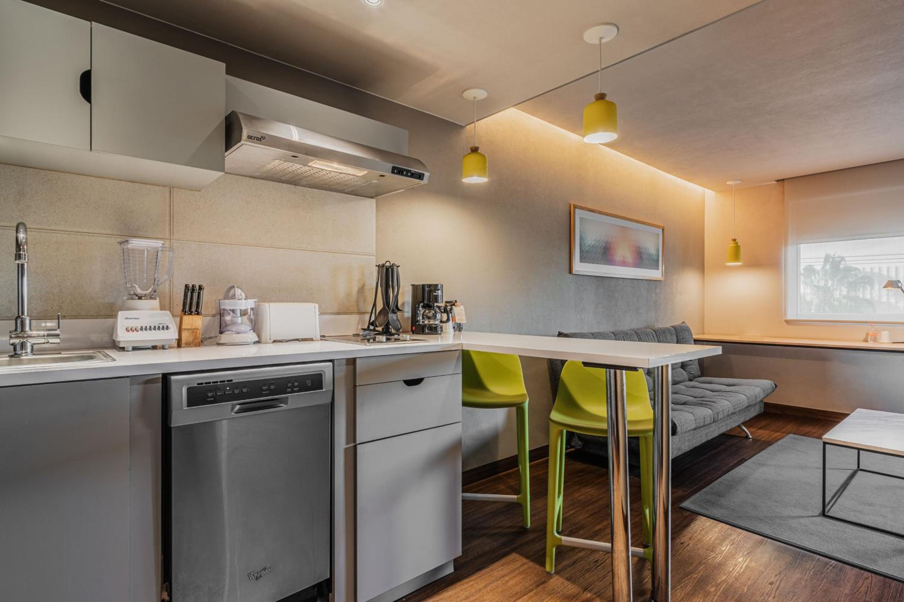 El desayuno bueno aunque faltó más variedad. La ubicación buena, junto a una de las avenidas principales. La habitación cuenta con cocineta lo que es una ventaja.