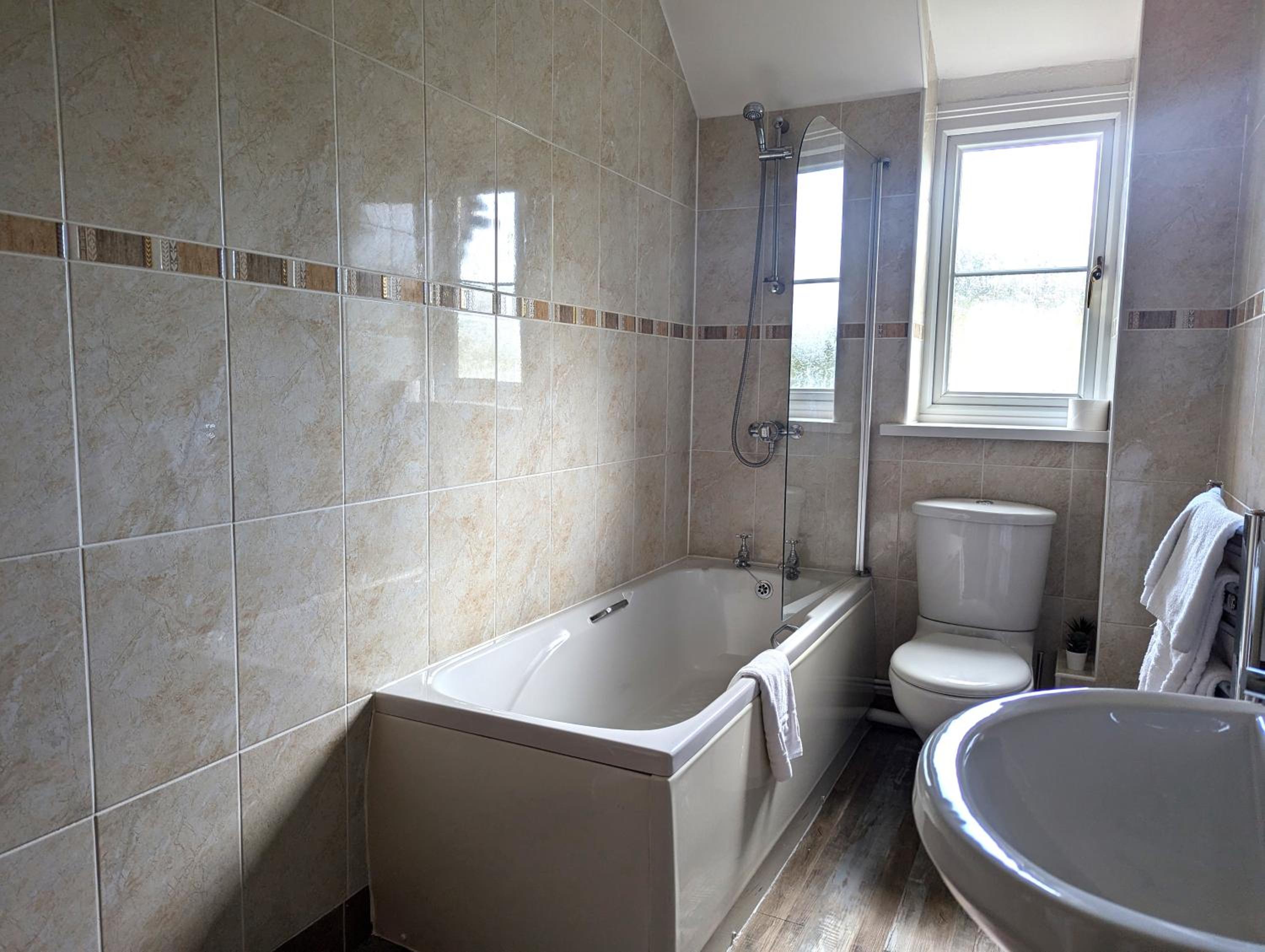 Very large comfortable room and large bathroom with bath. Plenty of towels.