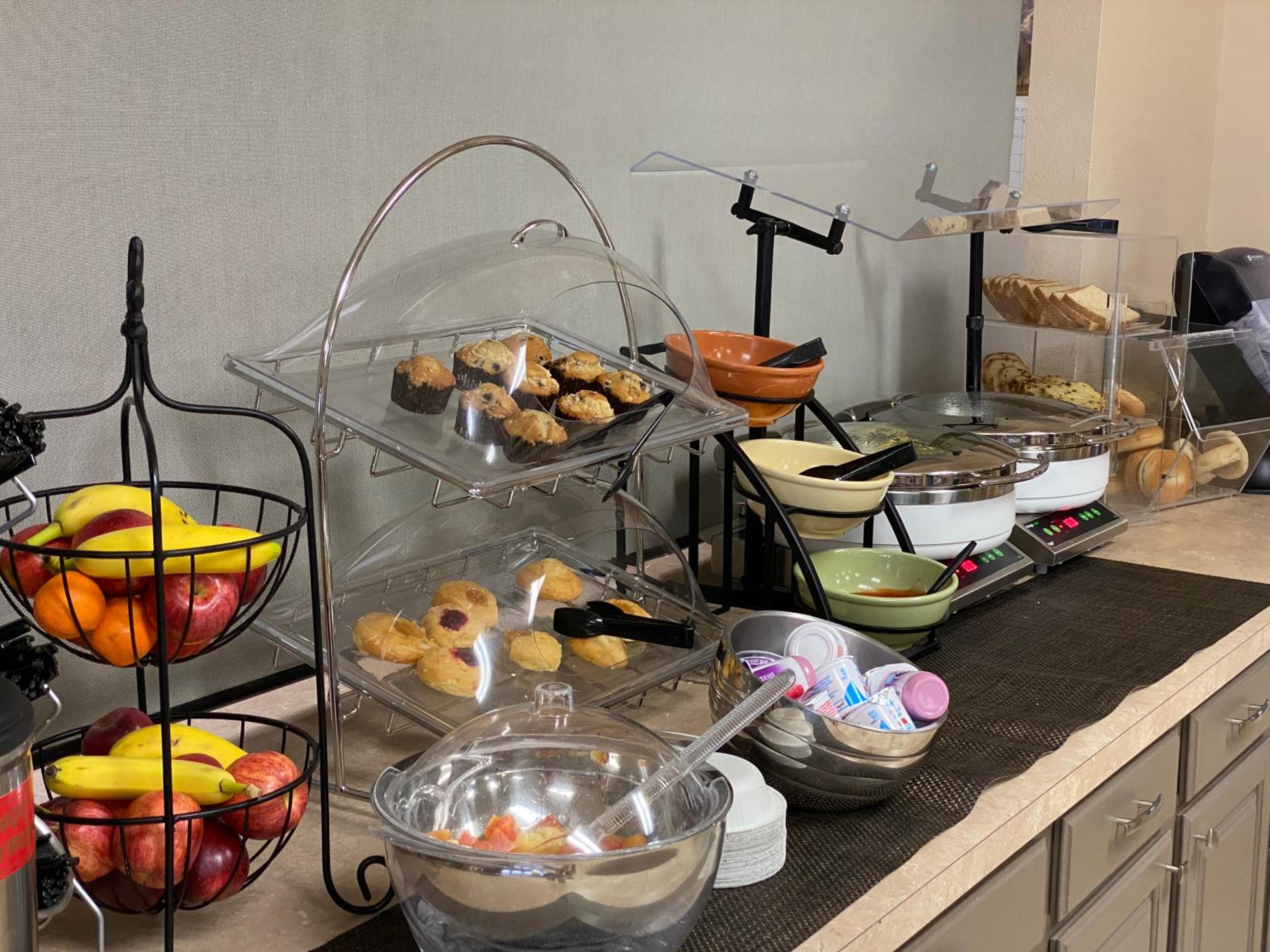Great hotel during travels from the airport. Had a late night check in and the staff was very kind and helpful. Morning front desk staff set up a shuttle to the airport that was there and ready before our scheduled time. Continental breakfast was great! Scrambled eggs, sausages, toppings for the eggs, breads and bagels to toast, waffles, cereal, juice, coffee, some fresh fruits.