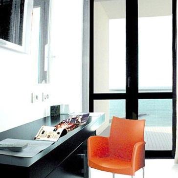 La vista stupenda dalla camera, il balcone molto grande dotato di lettini, tavolino con sedie e stendino