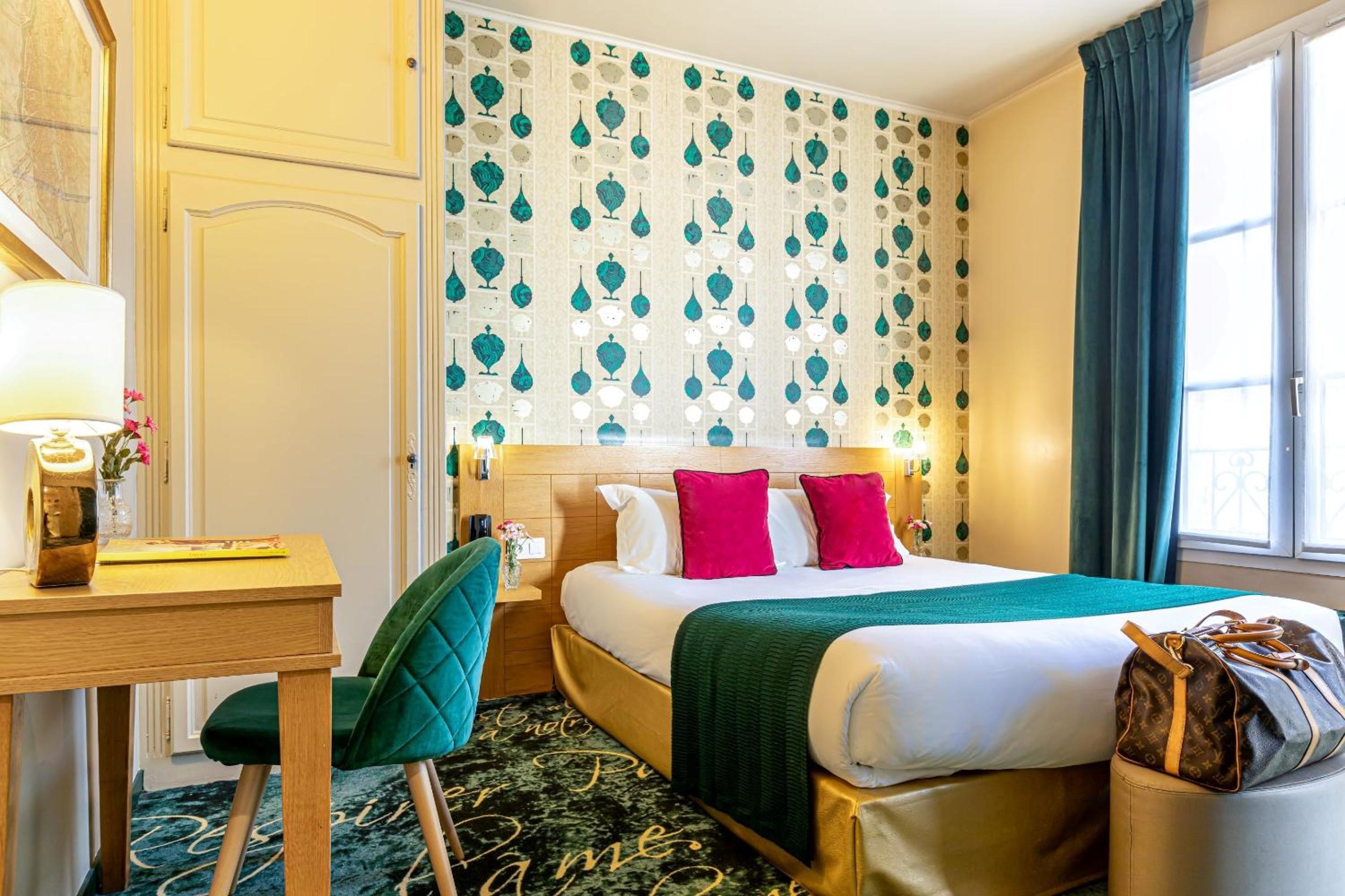 Hotel Romance Malsherbes, housed in a 19th-century building, offers a unique blend of historic charm and modern comforts. Each floor's distinct pastel color scheme adds a touch of elegance to the ambiance.
