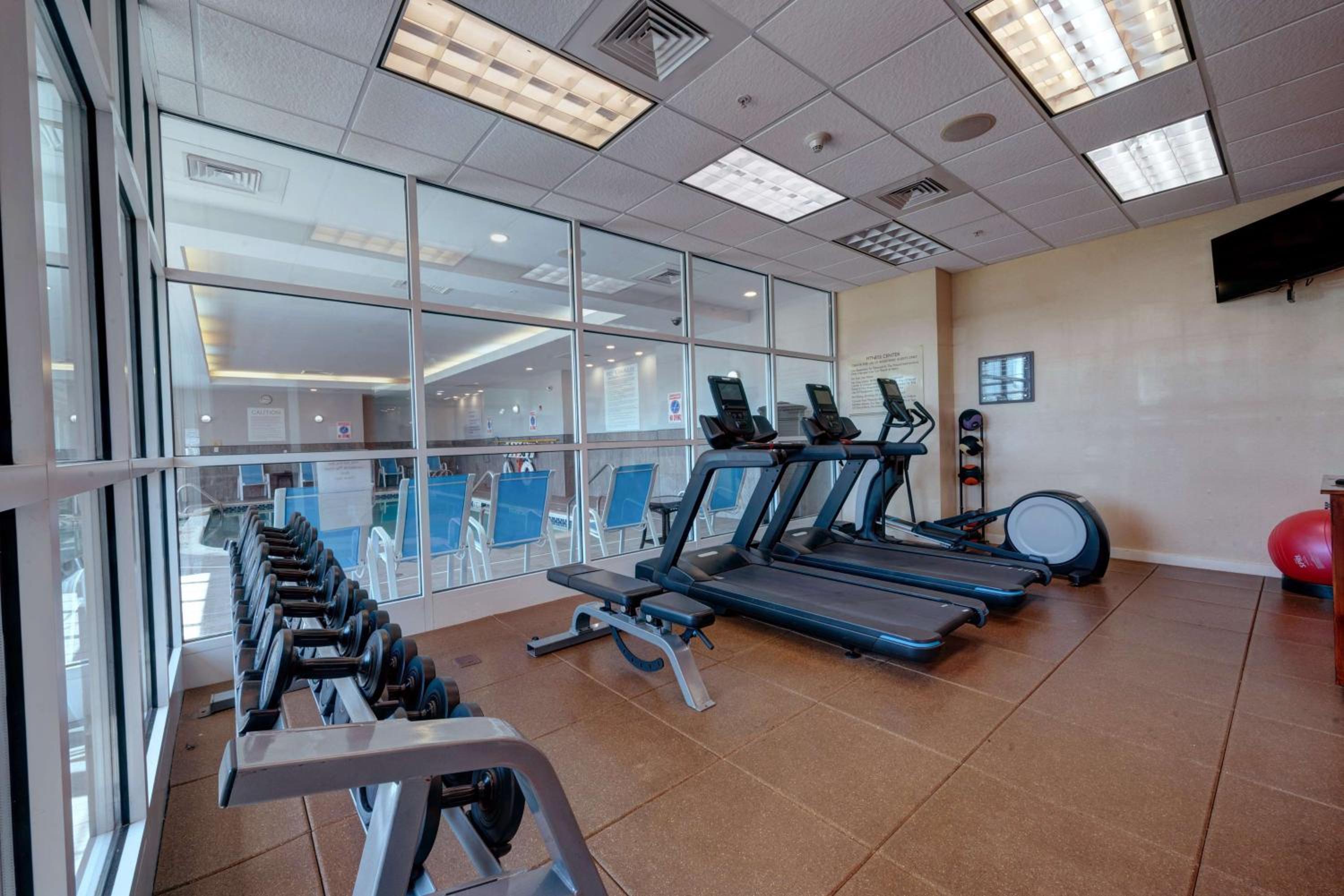 Each spacious room features modern amenities such as a 32-inch flat-screen TV, free Wi-Fi, and a microwave. Guests can also enjoy access to the indoor pool, gym, and hot tub.