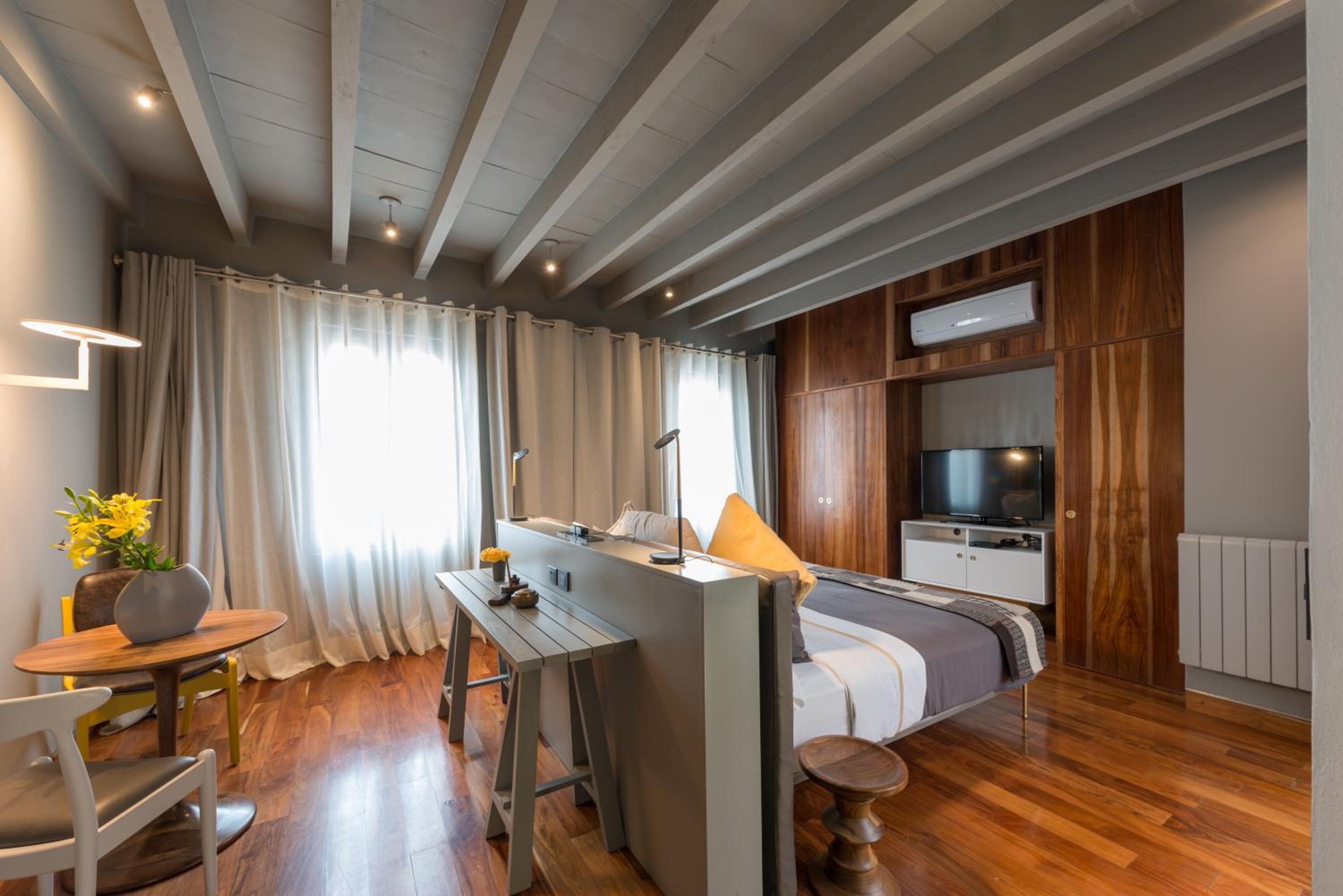 Historical building, wood floors, rooftop terrace with loungers and table. Comfortable bed and bedding, large bathroom and free parking garage. Breakfast options were limited but the egg dishes and coffee were good.