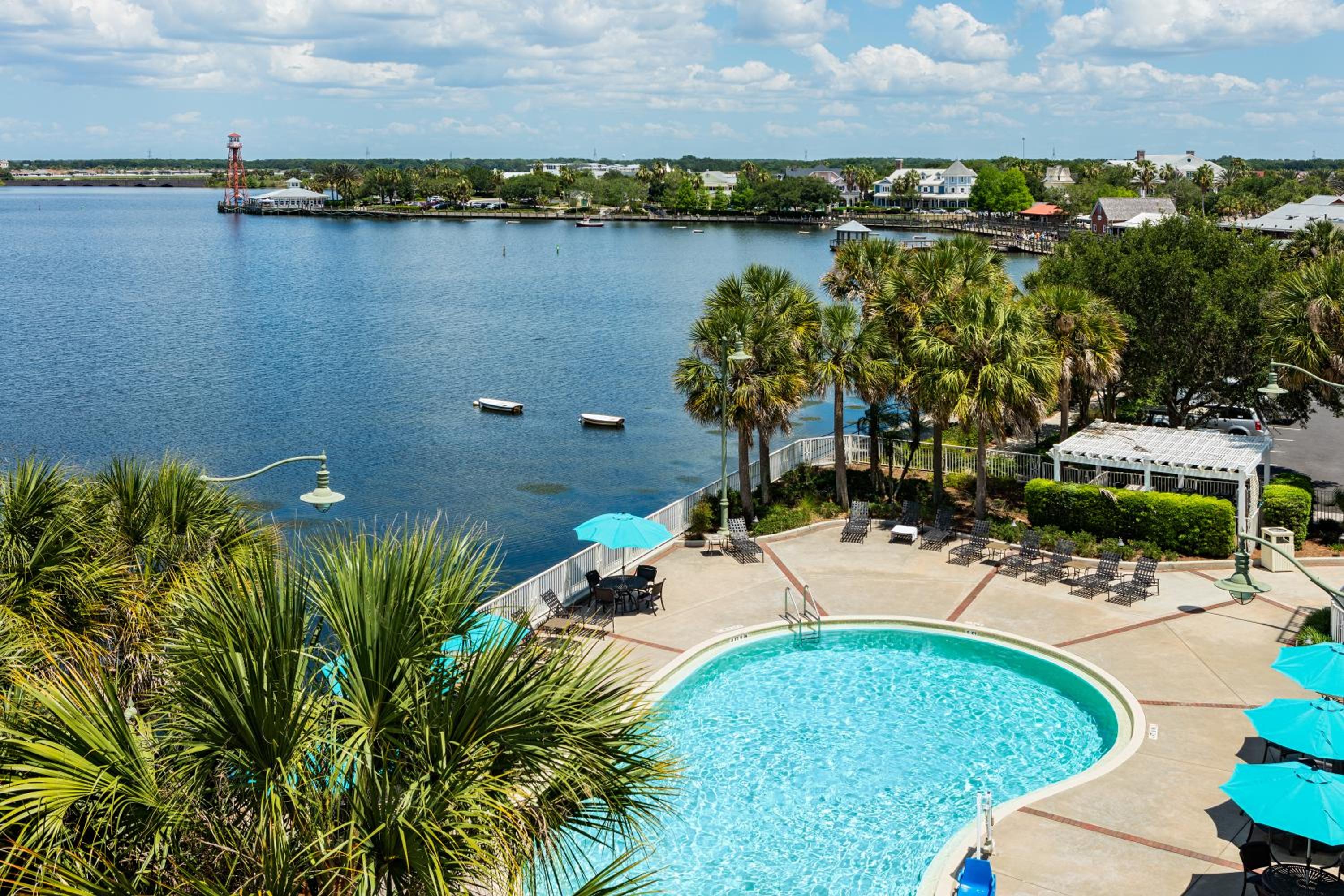 We chose this hotel so that we could be close to the Sumpter Landing Town Center. Location is great for that and we were able to walk wherever we wanted. Nice restaurant at rear of lobby called Calypso that will give you 50% off your second entree before 5:00 p.m. We weren't thrilled with our room. No carpet which is GOOD, very good black out shades and blinds on the windows. But there was no comfy chair to sit in, the lighting was DIM, and there was a plastic cover on the mattress that made sleeping very hot. There is a heated pool outside and many rooms have a nice water view. I would stay here again for the one advantage of being able to walk to Sumpter Landing.