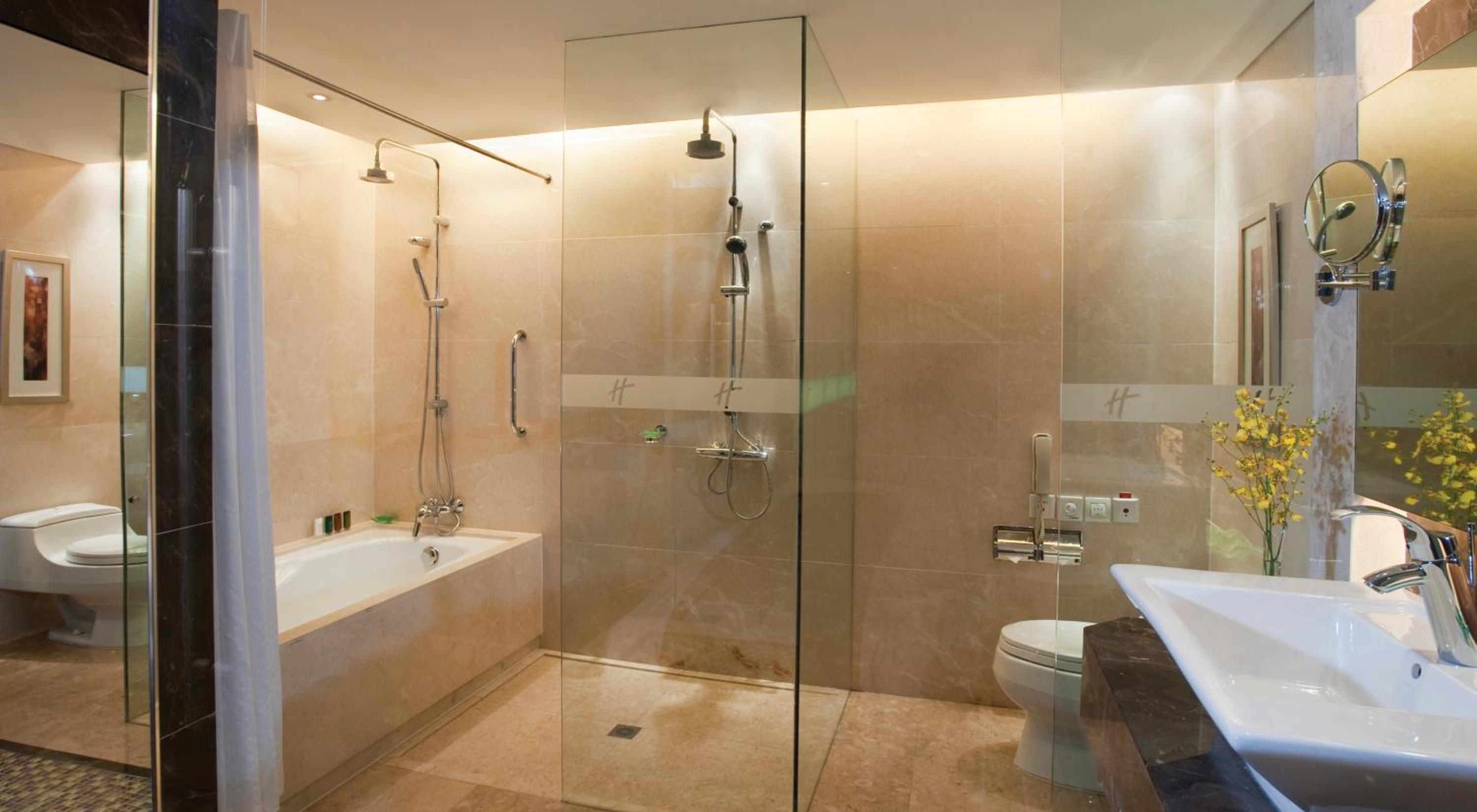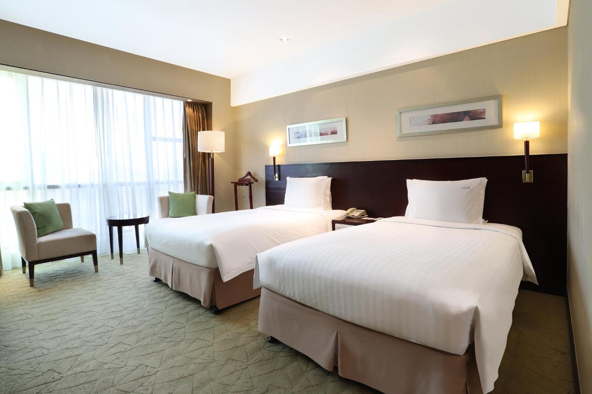 The hotel boasts spacious rooms with floor-to-ceiling windows, providing ample natural light. Each room is equipped with modern amenities such as a cable TV, safety deposit box, and private bathrooms with a bathtub and hot shower, ensuring a comfortable stay for guests.