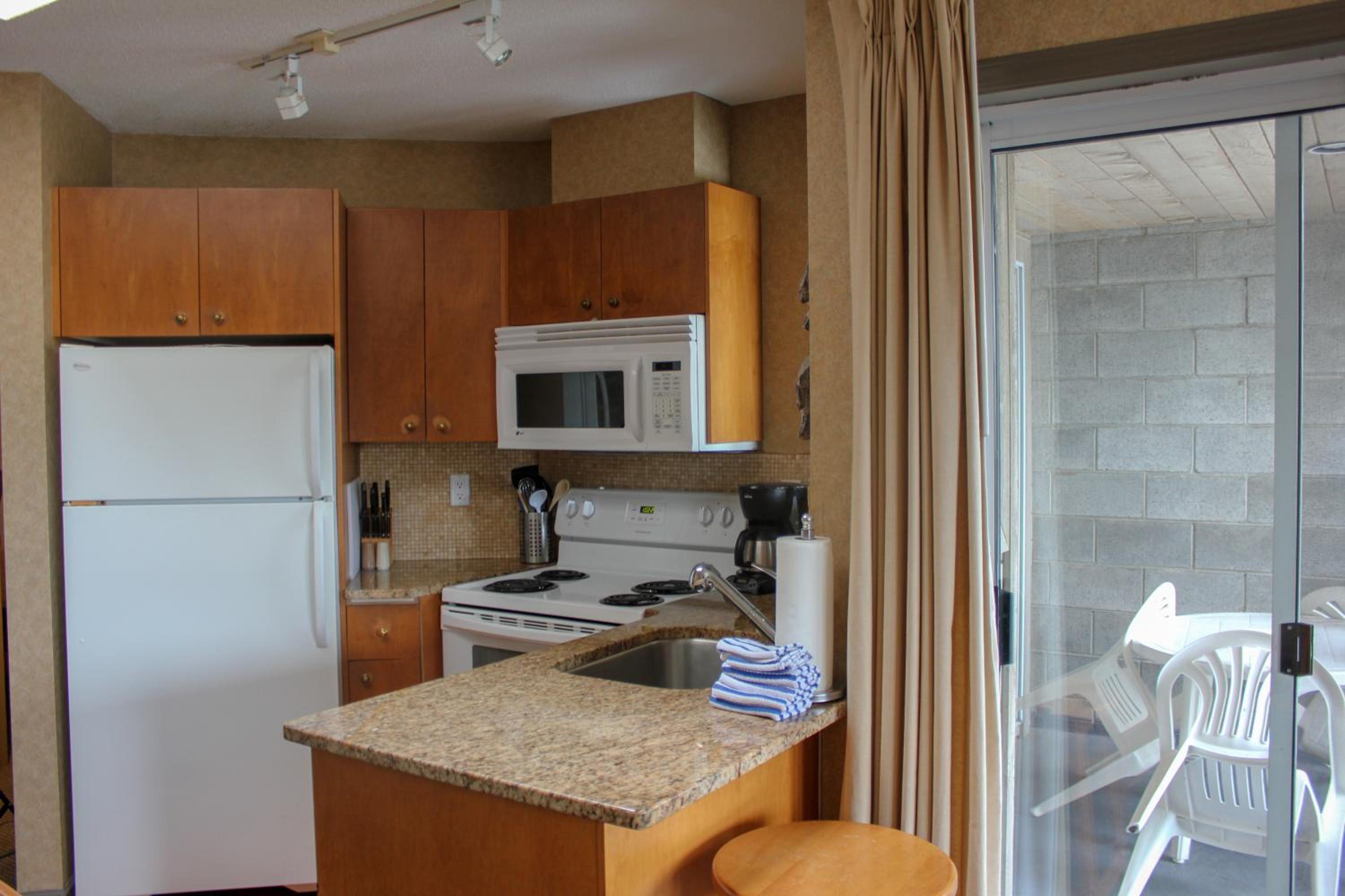 Each unit at the resort boasts a modern flat-screen TV for entertainment, and select units even come with fully equipped kitchens featuring convenient appliances like microwaves, providing a home-away-from-home experience.