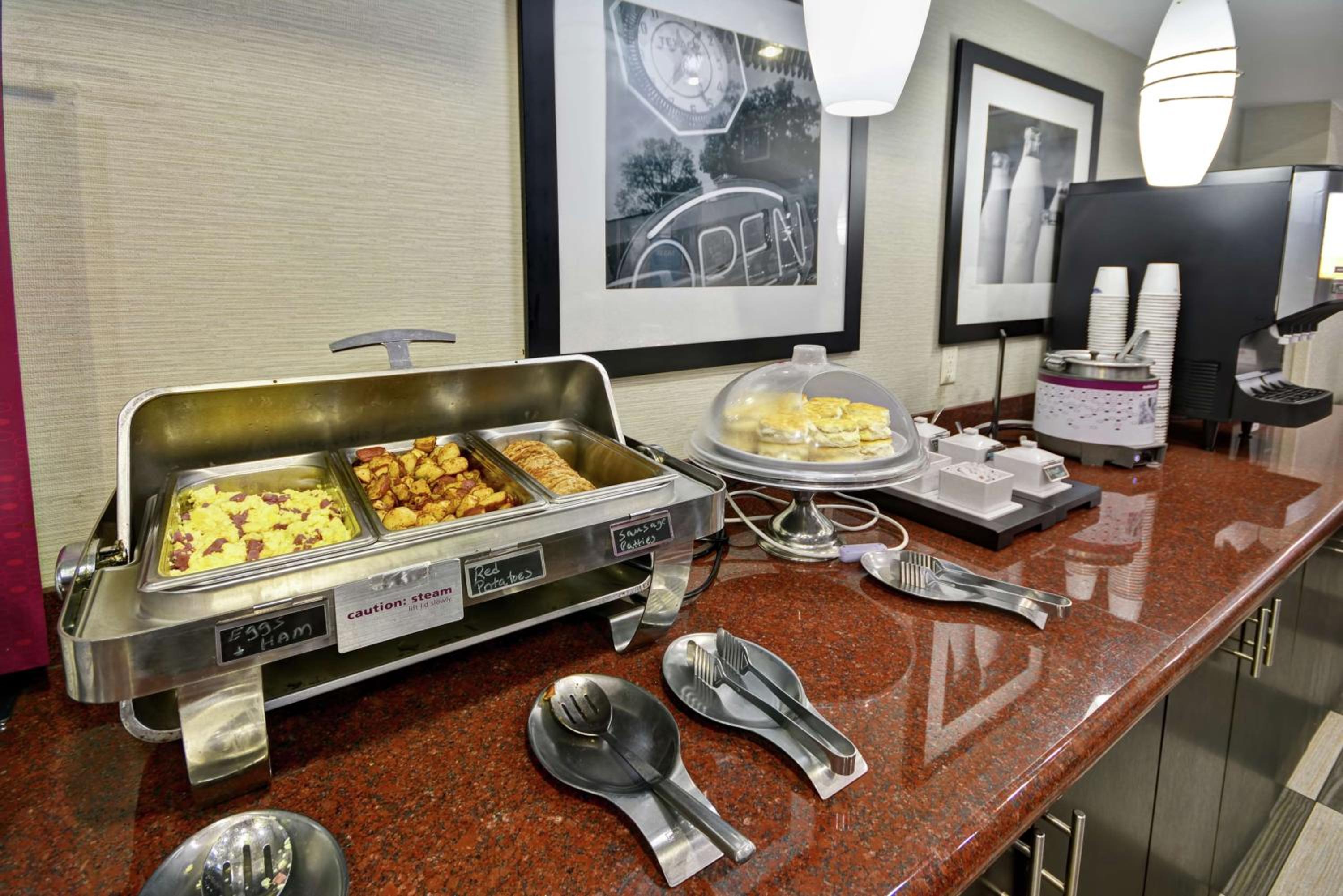I checked in and evening staff was not very friendly the bathroom door did not close correctly without having to slam it shut causing a really loud noise scaring everyone in the room and the breakfast in the morning really lacked the food was cold and the selection was very limited compared to some other Hamptons that I have at at