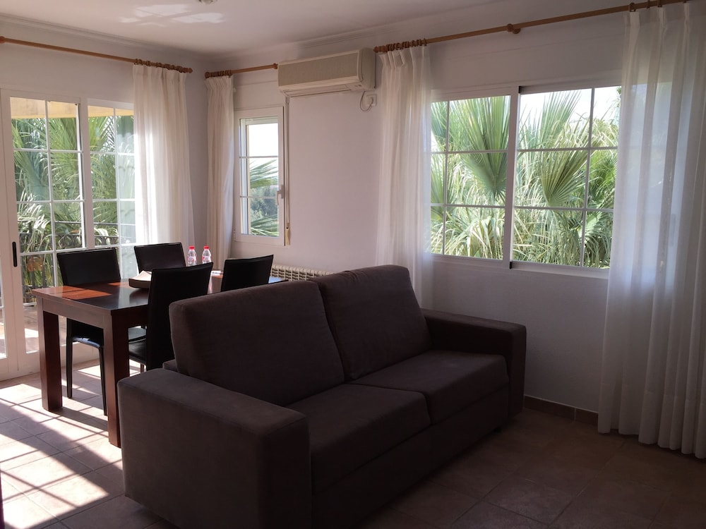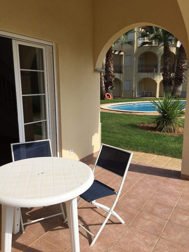 Relax in the air-conditioned apartment with a fully equipped kitchen, private patio, and entertainment amenities like a flat-screen TV.