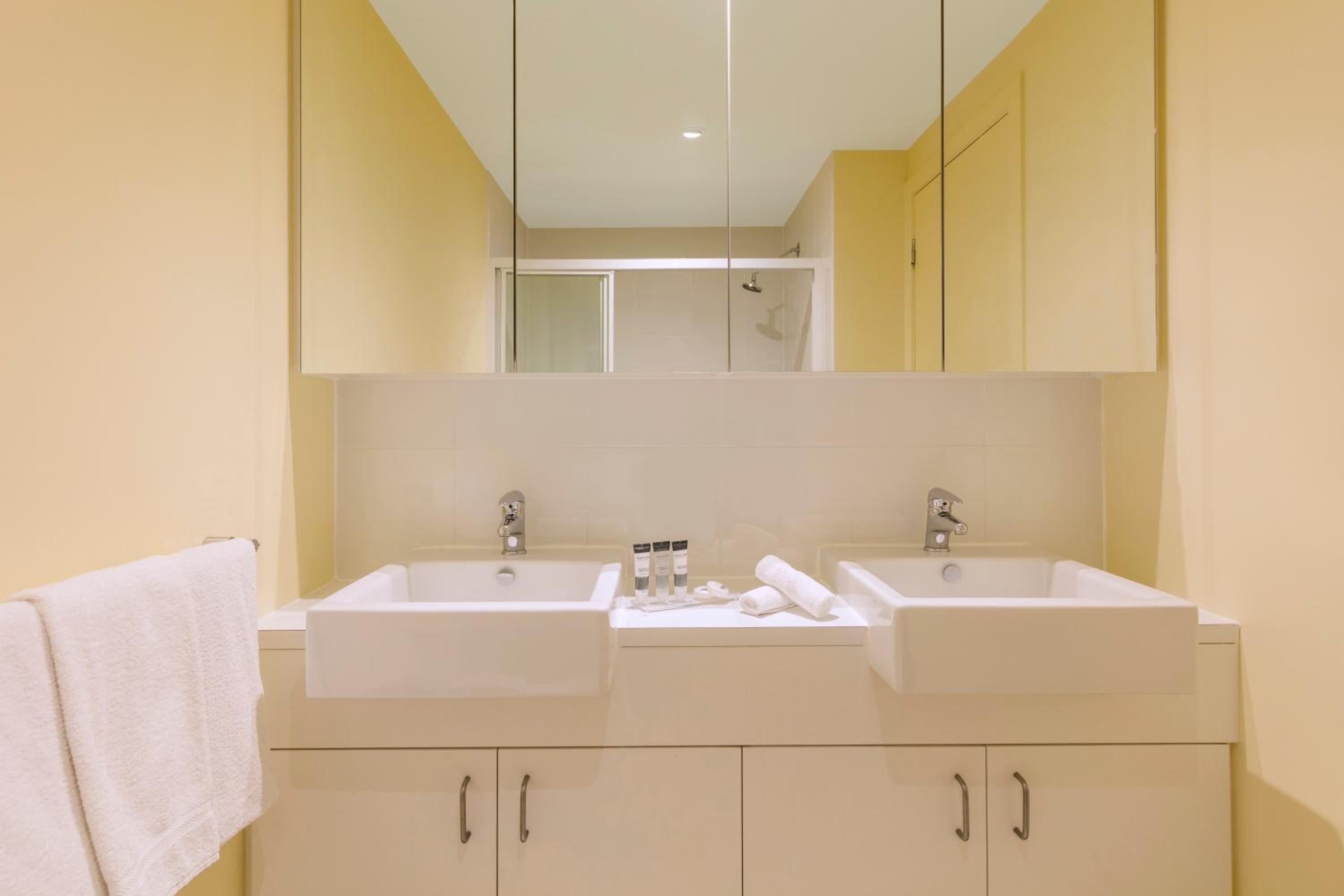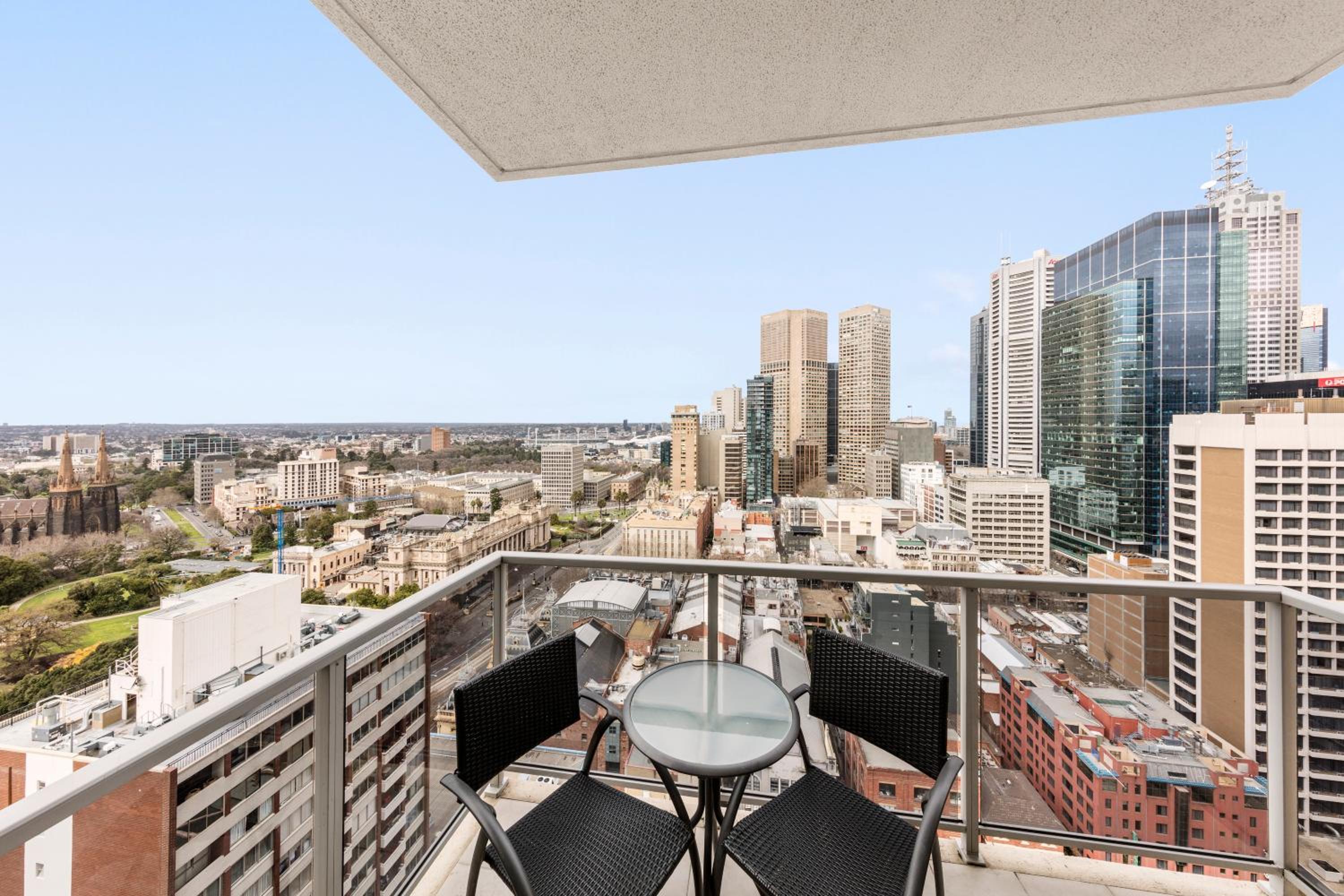 Slightly older building with very spacious areas. We had 2 bed 2 bath and both bedrooms and living area had brilliant views over Melbourne (on 20th floor) Didn't expect it to be so large. Everything worked well and all staff really helpful and friendly. Great IGA next door for supplies. Was right at the top of town which suited us for this trip, might be a bit of a walk for some, but tram stop very close.