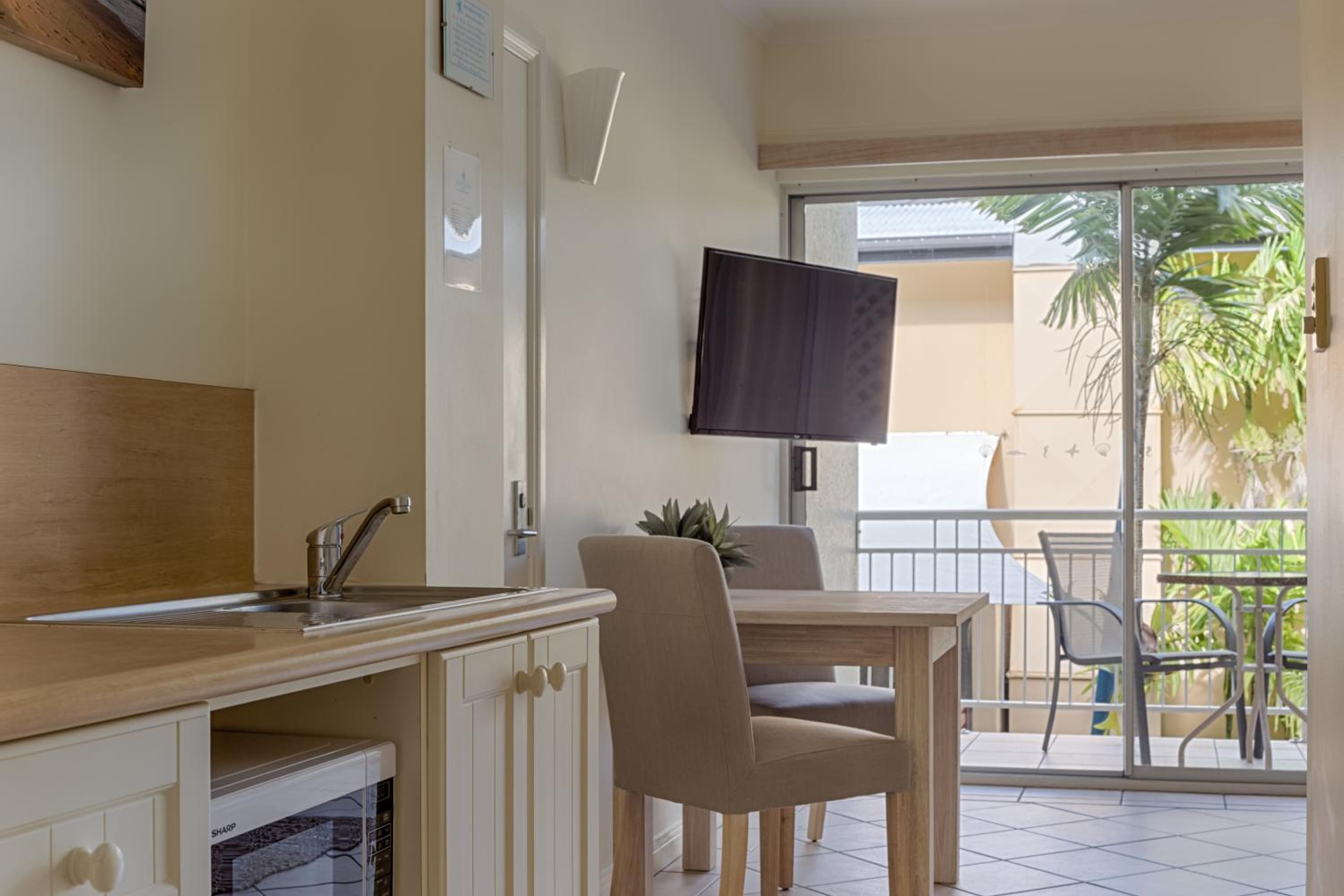 Close to everything im the main street. Kitchenette was fully stocked with everything you needed. Clean rooms and comfortable beds. Room overlooked the pool and was very private 😌 Pool was excellent.