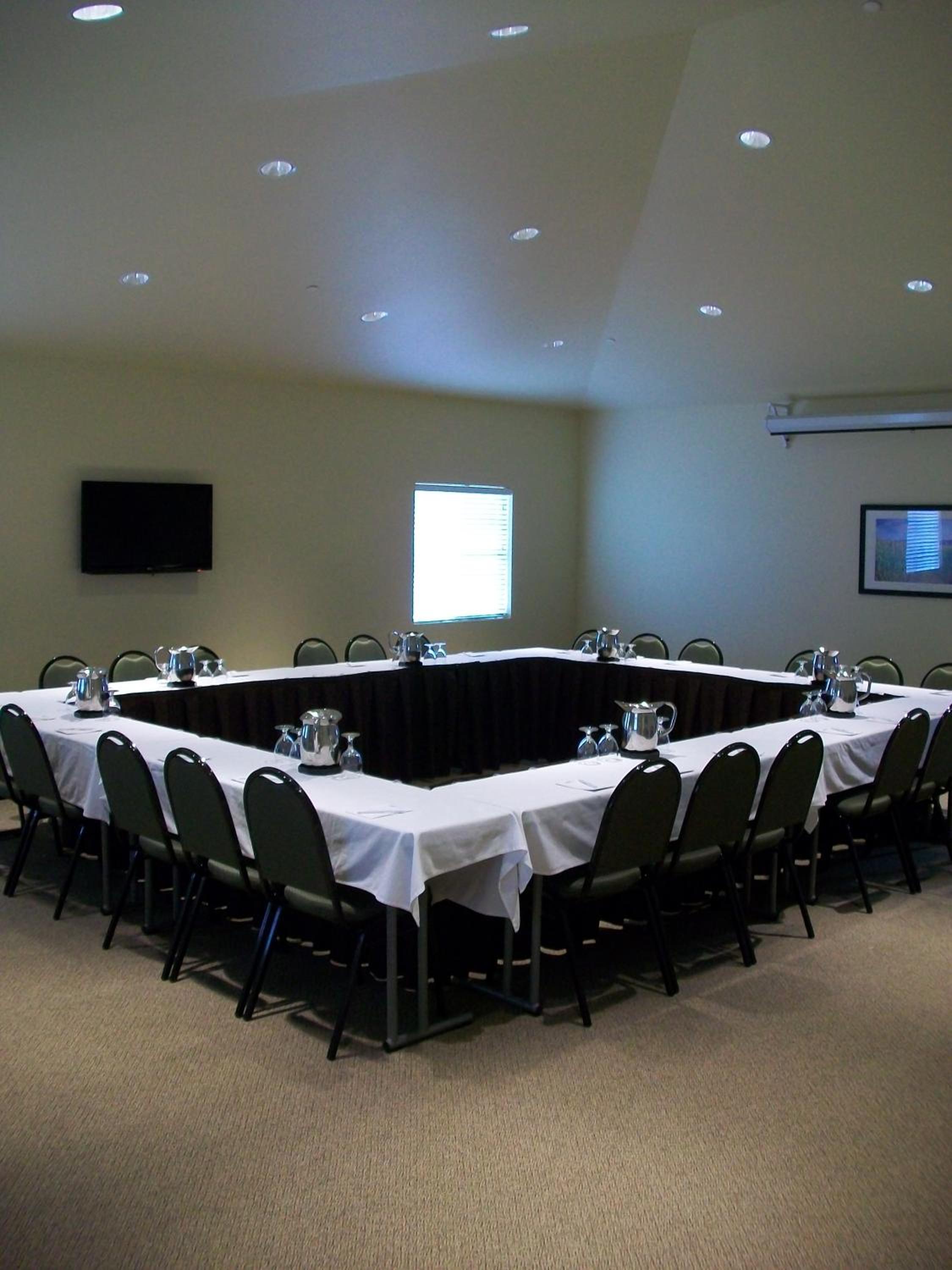 The rooms at Ledgestone Hotel are elegantly designed with separate living areas, two flat-screen TVs, and modern dining spaces. The decor in cream hues and crisp white linens exudes comfort and luxury.