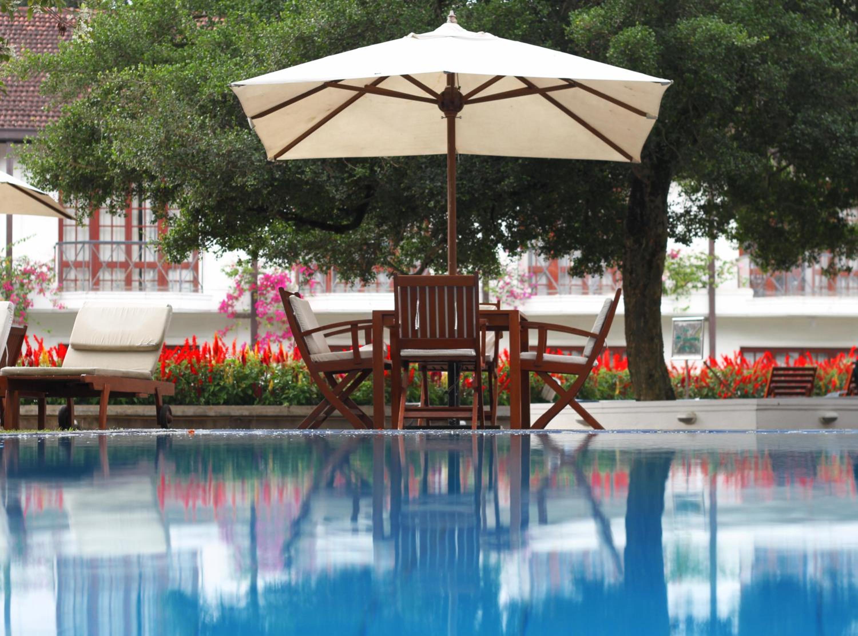 The hotel offers rooms with private balconies showcasing tropical greenery. Guests can unwind with Ayurvedic massages and enjoy the picturesque backdrop of rolling mountains.