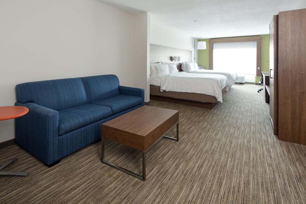 Wow was this a rough one night stay. We came up for a memorial service the next day, so we only needed a place to lay our heads, but I wish we had chosen somewhere else. I booked two king beds according to hotels.com, but came to find out that the listing was incorrect and that there are no kings at all anywhere in this hotel. That was a bummer, but I wish that had been our only issue. The room smelled musty, the blinds were operated by a remote that did not work so we couldn't get them to open, the TV had an error screen and would not connect, the air conditioning unit was so loud and was on and off all night, which meant we intermittently woke up in a sweat. We wanted to use the pullout couch for my daughter, but the mattress was covered in large stains and the hotel's only solution was to provide an extra mattress cover. And finally, the hallway absolutely reeked of weed. I was duped by the idea that I could count on a Holiday Inn Express to meet a certain standard, especially at the price we paid for our room (which was comparable to a much newer hotel that's close by), but this missed the mark big time and made for a really rough night on top of an already sad weekend.