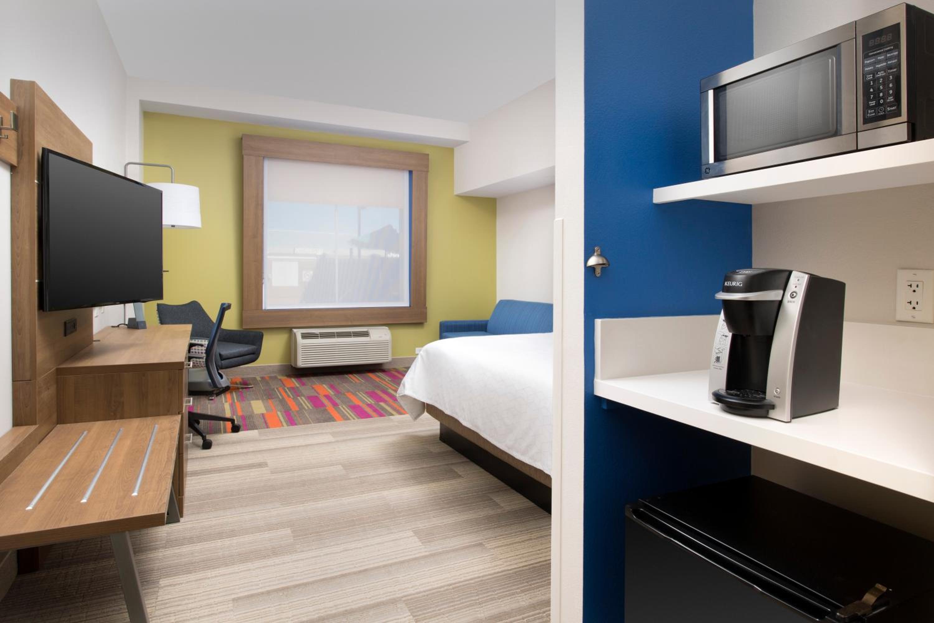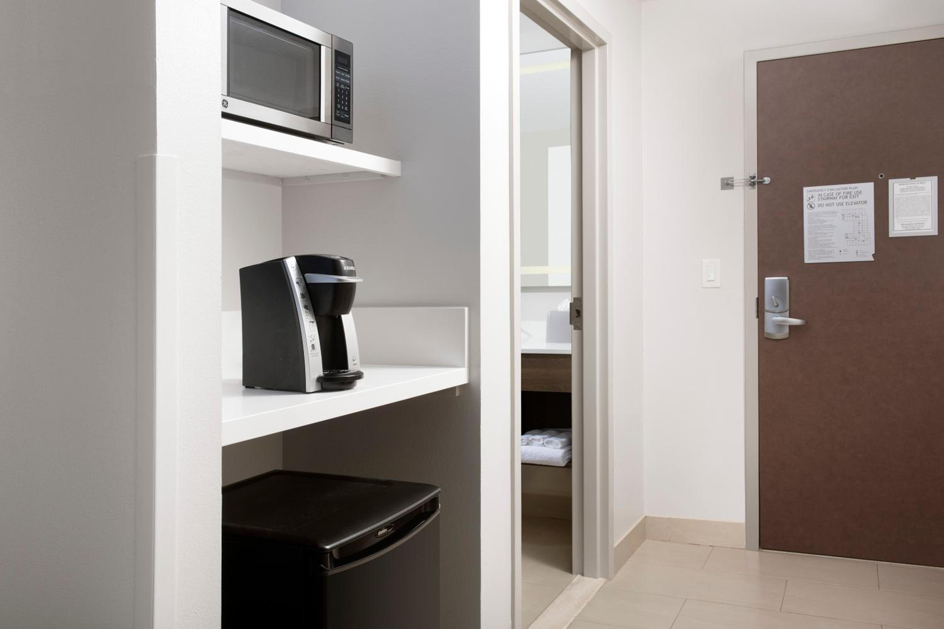Enjoy spacious rooms equipped with free Wi-Fi, flat-screen cable TV, work desk, microwave, refrigerator, and a coffee maker for your convenience.