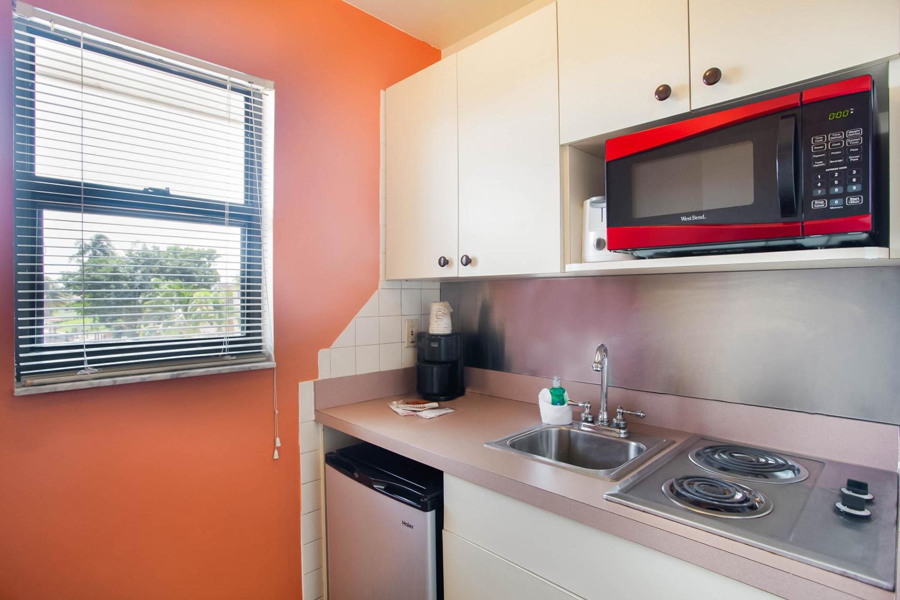 Escape to our Cape Coral retreat located along a tranquil lake, boasting an inviting outdoor pool and a fun-filled game room. Indulge in the convenience of each room featuring a kitchenette for a home-away-from-home experience.