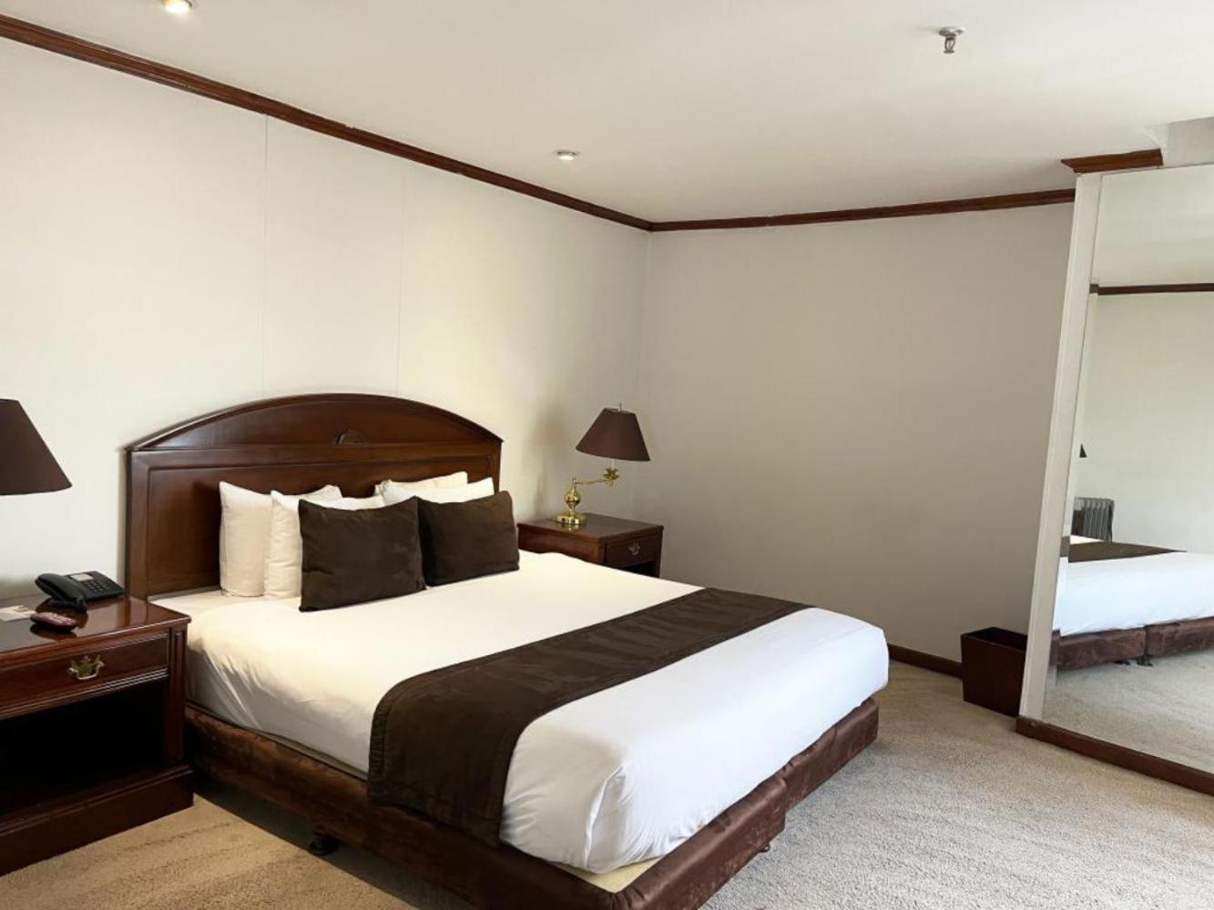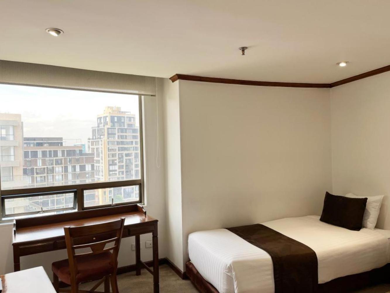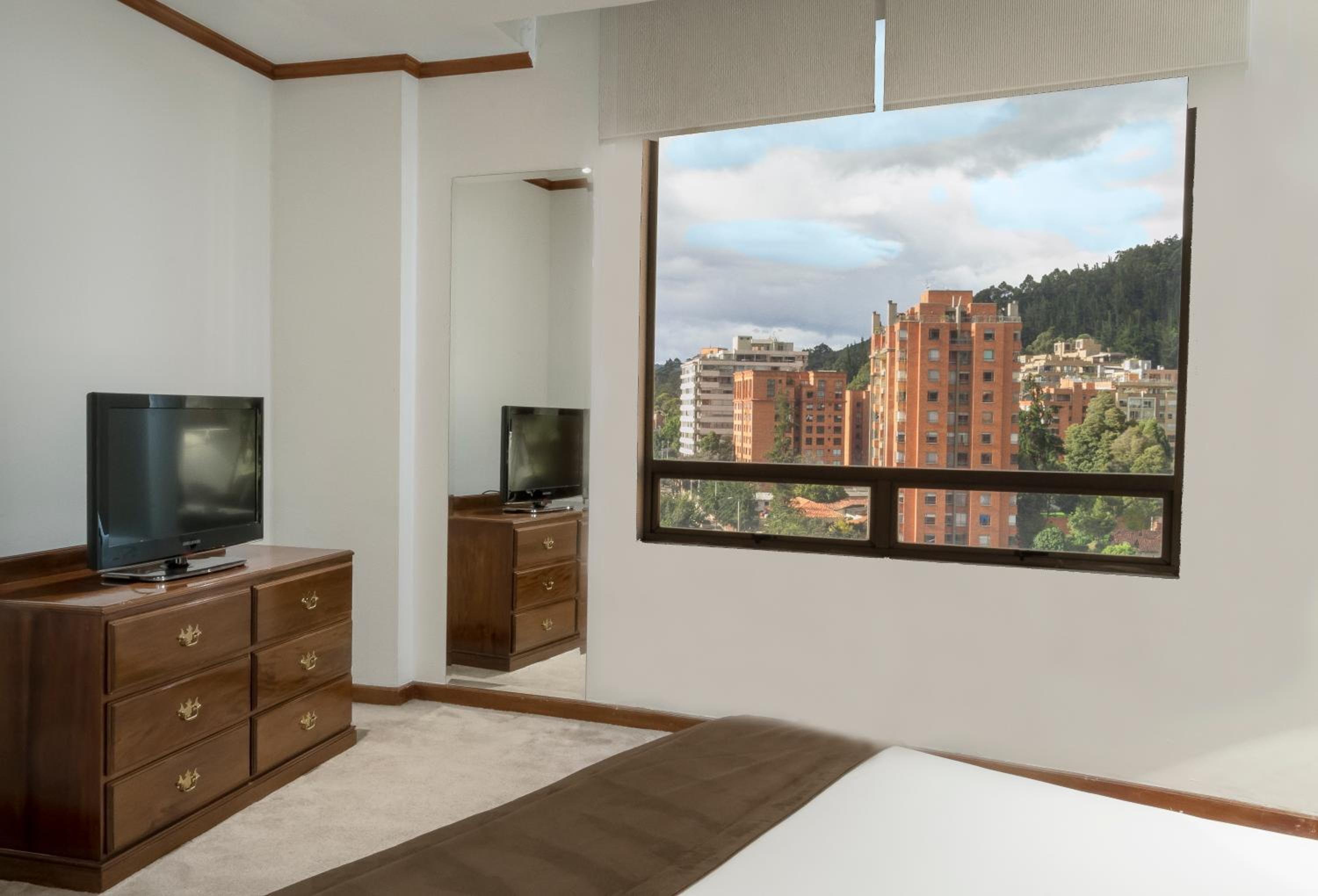 Luxurious Accommodations - Bogotá Regency offers elegantly decorated rooms with dark wood furniture and modern amenities, providing a comfortable and stylish stay for guests.
