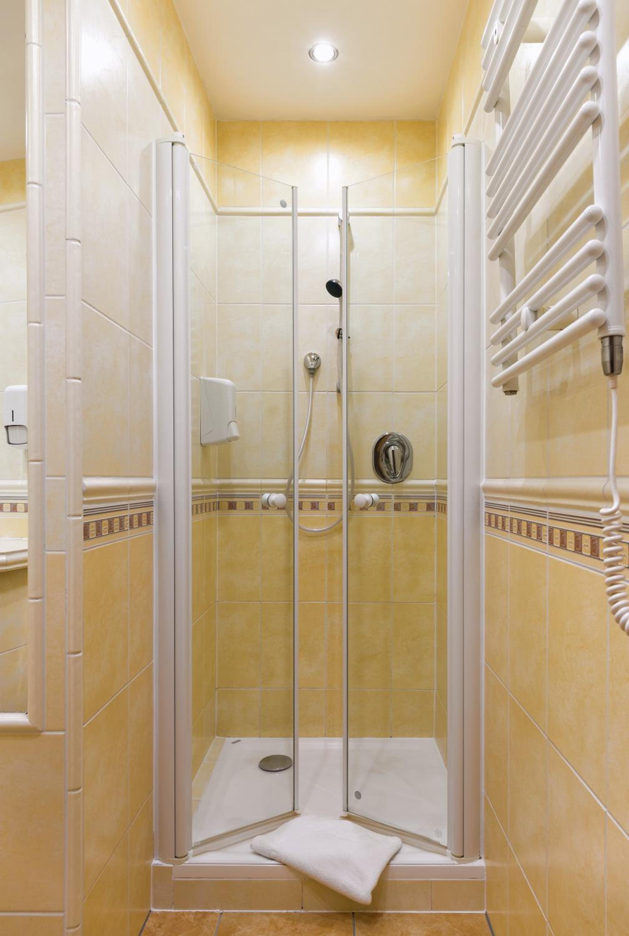 Kleines aber sehr feines Zimmer. Sehr schön renoviertes modernes Bad mit einer großen offenen Dusche und ein gemütliches modernes Zimmer. Super sauber. Die Matratze war sehr bequem, da eher hart als zu weich. (Es gibt nichts schlimmeres, als durchgelegene und zu weiche Matratzen im Hotel.)