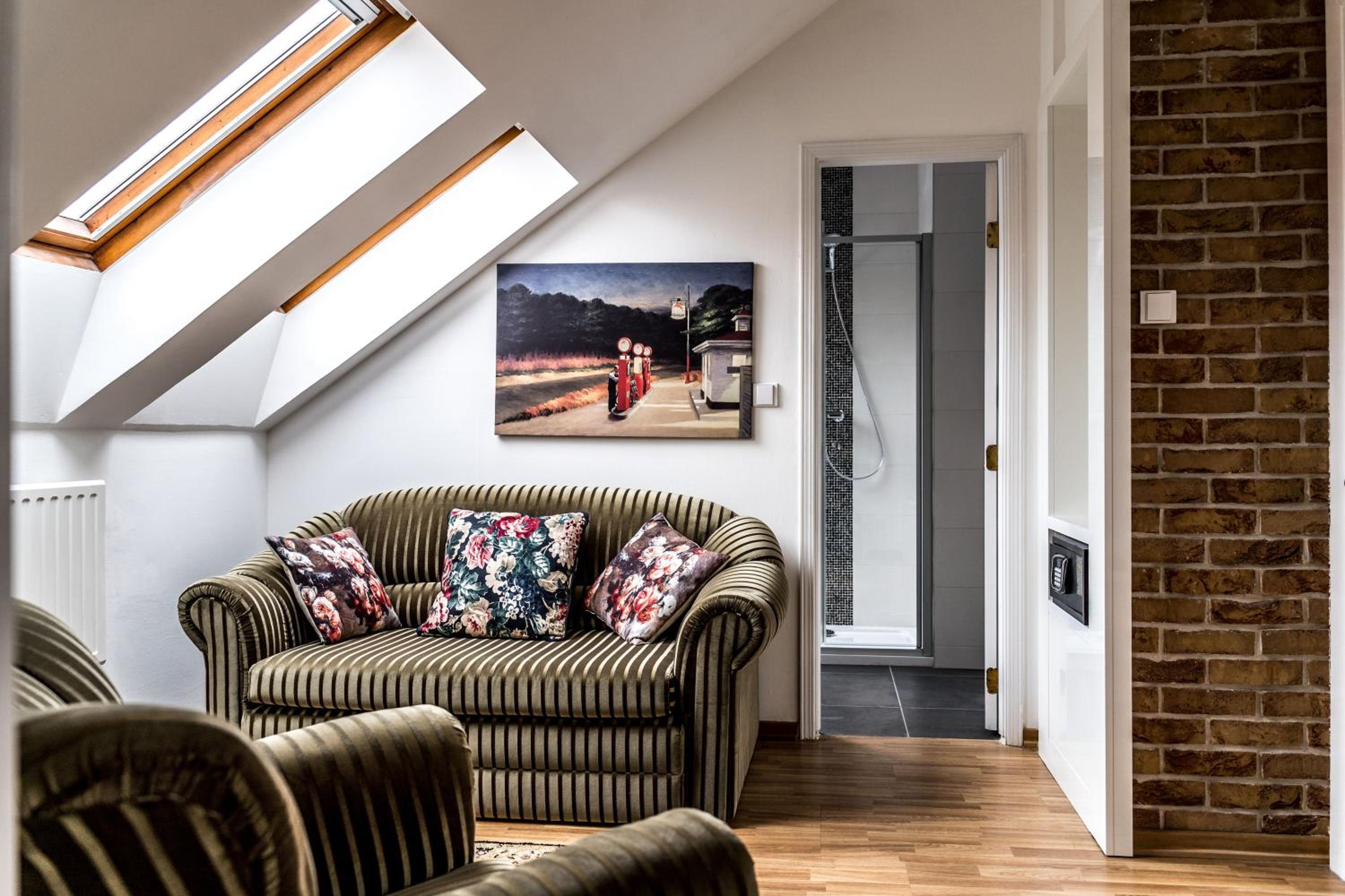 Wir hatten die Dachgeschosssuite gebucht für unsere Reise als Familie. Diese ist nur über eine Treppe ab dem 4.Stock zu erreichen und liegt direkt neben einer für Hotelgäste zugänglichen Dachterasse, von der die Aussicht fantastisch war. Check-in und check-out war unkompliziert. Leckeres Frühstück. Die meisten Sehenswürdigkeiten kann man zu Fuß oder mit ein paar Straßenbahnstationen (z.B. die Prager Burg) erreichen. Die Suite war gemütlich eingerichtet, Betten sehr gut, ausreichend Platz.