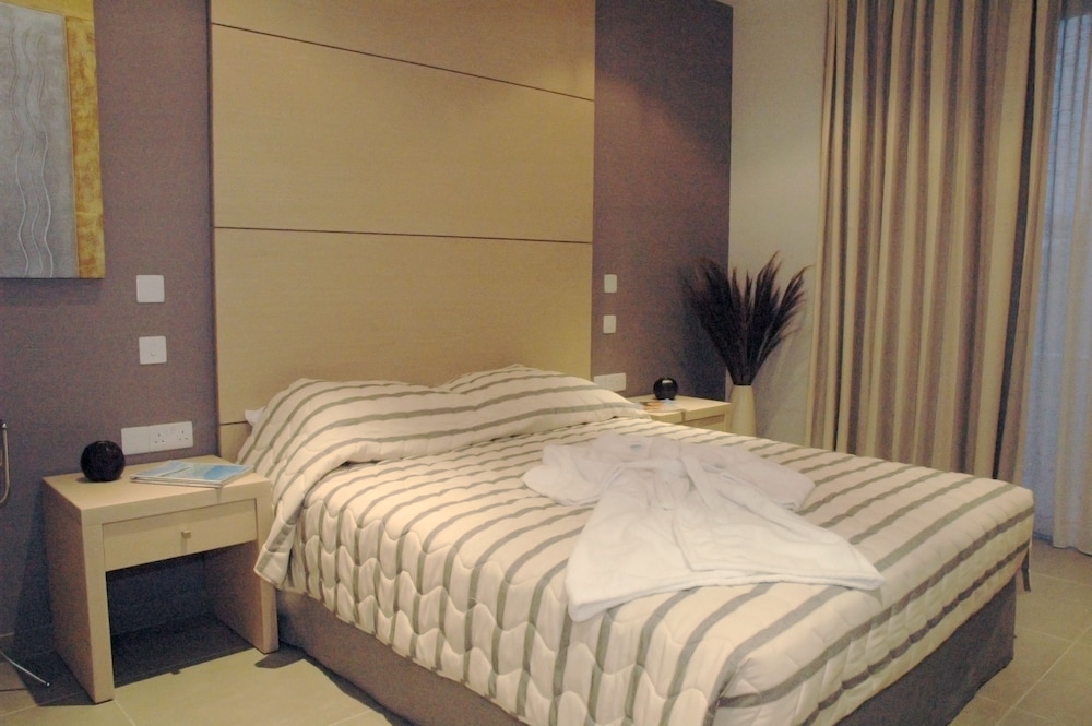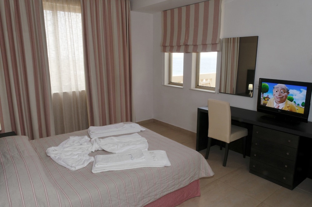 The location of the hotel is in a great spot with a long stroller friendly walkway that goes down to Paphos harbor and sights like tombs of the kings. The outdoor facilities are just lovely. There are a few beaches that are safe for swimming even on windier days. Rooms were very clean though the style was a bit dated and the daily service kept things very tidy. The spa and indoor pool area were in a very bad state - and the changing rooms were dilapidated. Otherwise staff was lovely and friendly, there was a great buffet breakfast with a view of the sea.