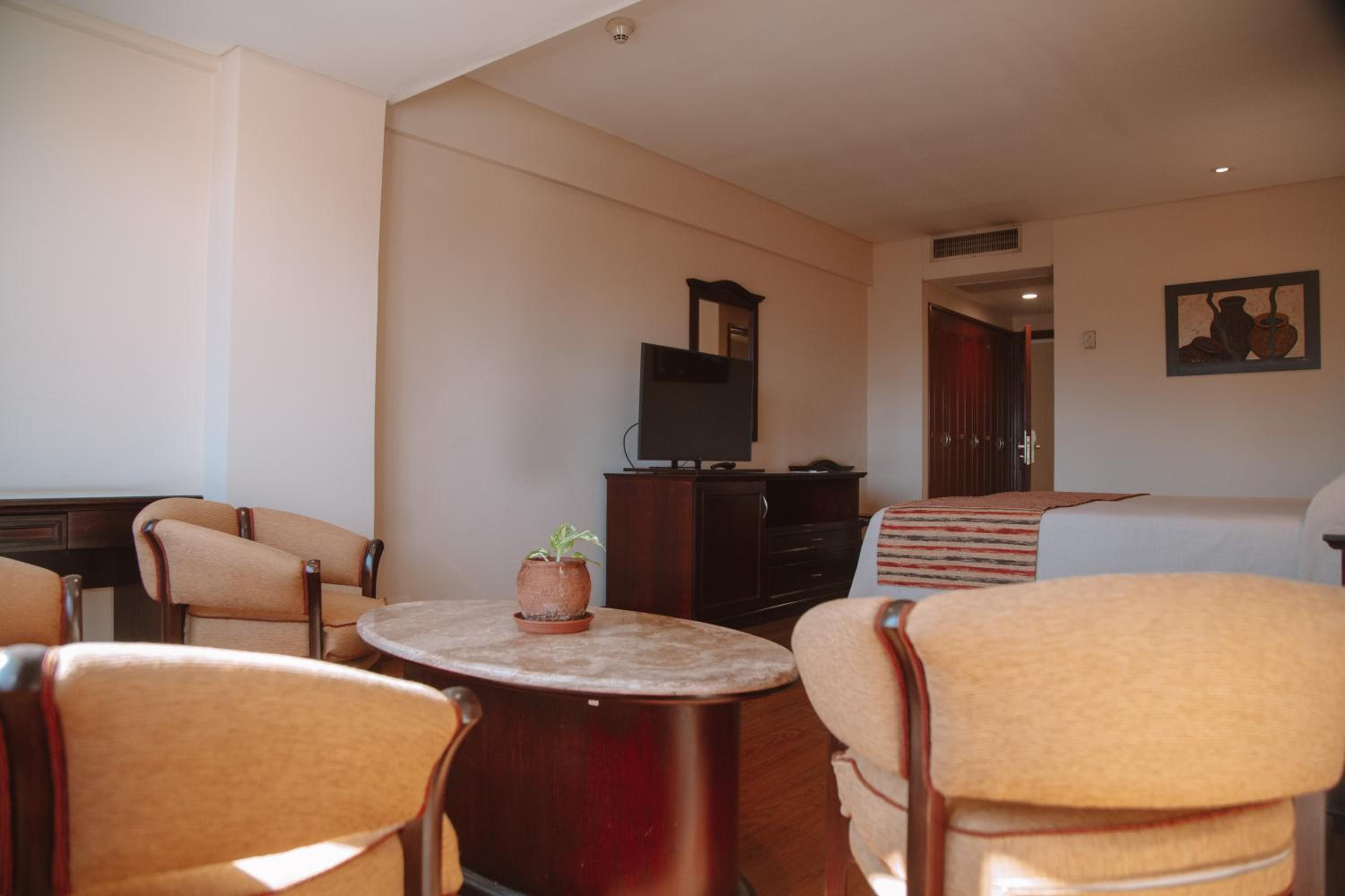 Each guestroom at Casa Real Hotel is equipped with air conditioning, a minibar, flat-screen TV, and a dining area. The centralized AC/heating system ensures comfort throughout the year. The hotel's proximity to the city center and popular dining spots adds to the convenience of your stay.