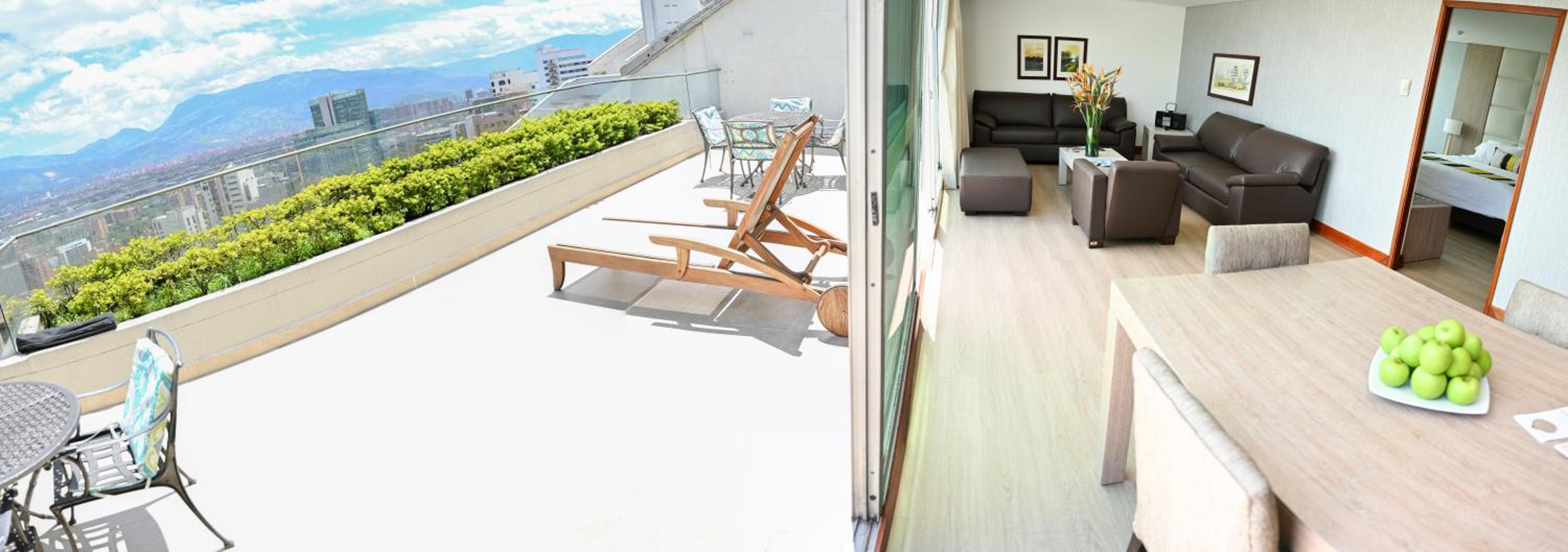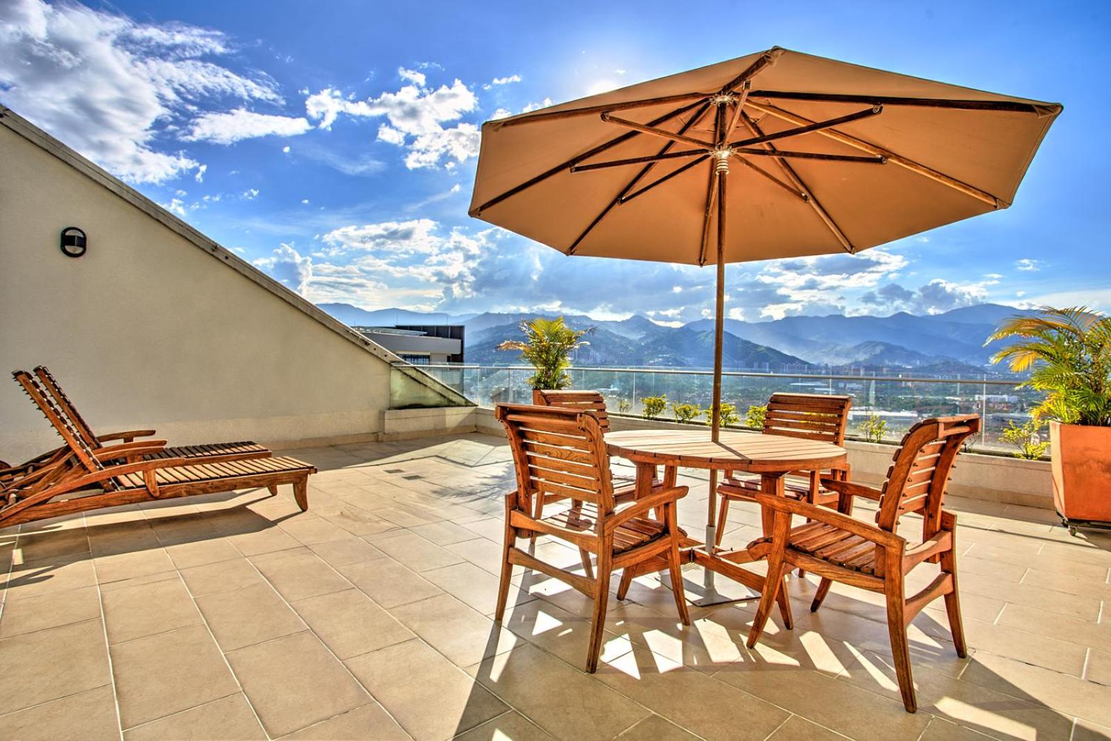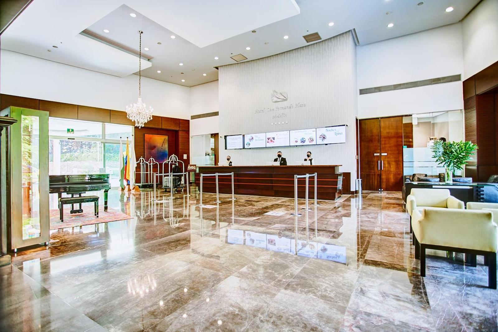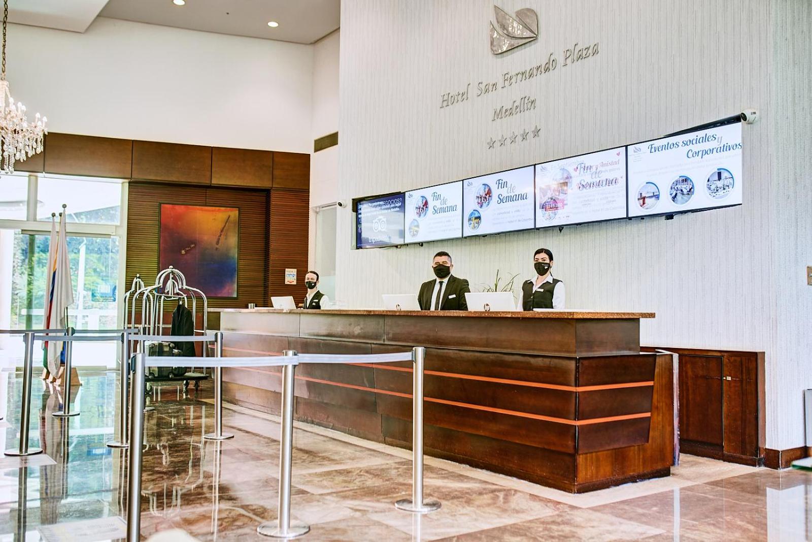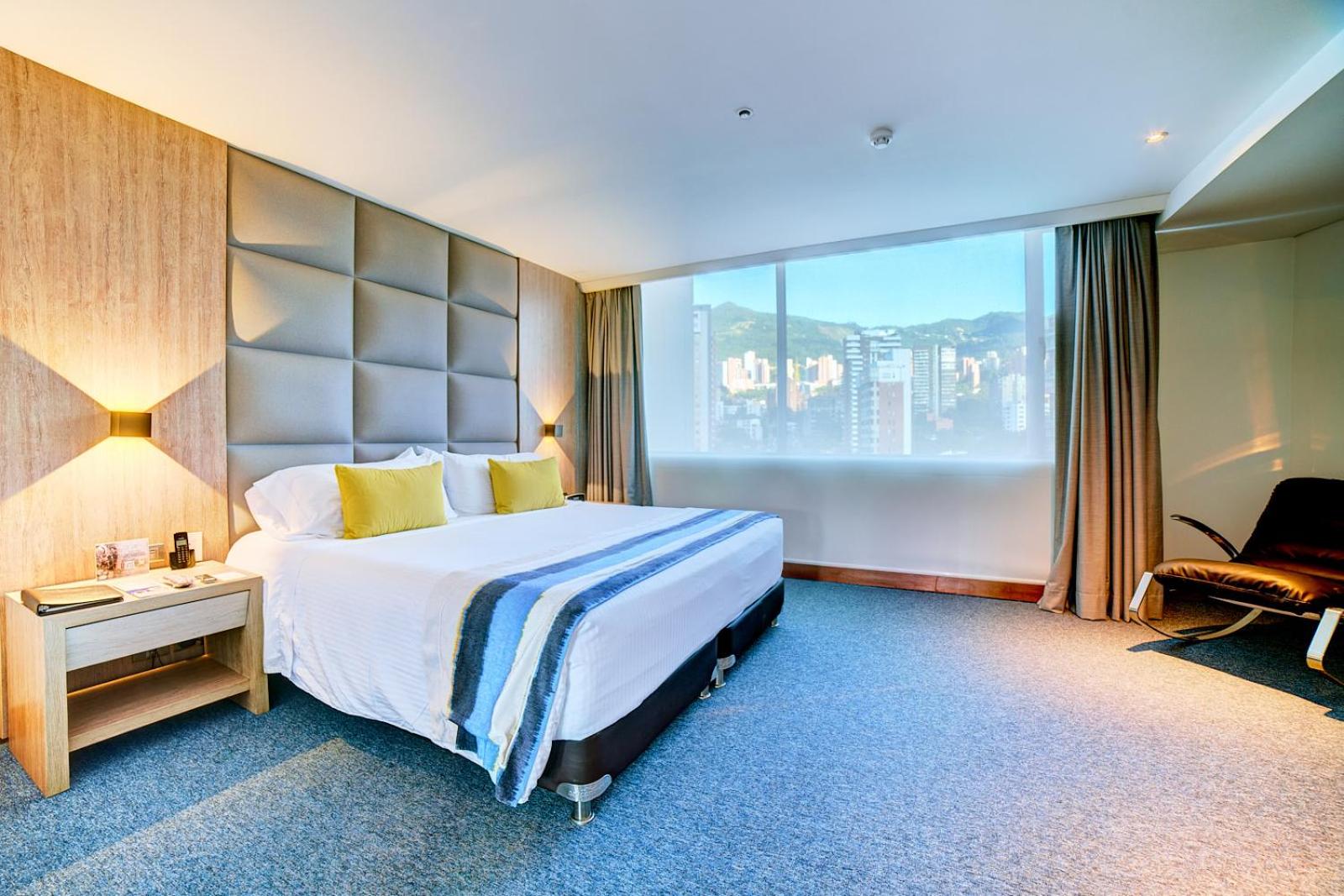 Hotel San Fernando Plaza in Medellin offers a premium experience with a heated pool, spa, and fitness center. The rooms feature high-speed WiFi, satellite TVs, and some even have city-view terraces.