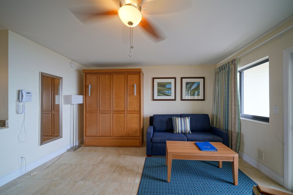 Ocean view was limited even from balcony but inside it has curtains pinned shut, so you have no view:( Murphy bed in studio is horrible! Studio is cramped for two people and wouldn’t work for four. They shouldn’t allow people to leave tents, chairs and wagons set up on beach all week. The beach is beautiful, but it does have public access right next door. The building is older but maintained as well as most on the beach. There’s lots to do in the area and restaurants nearby, not onsite.