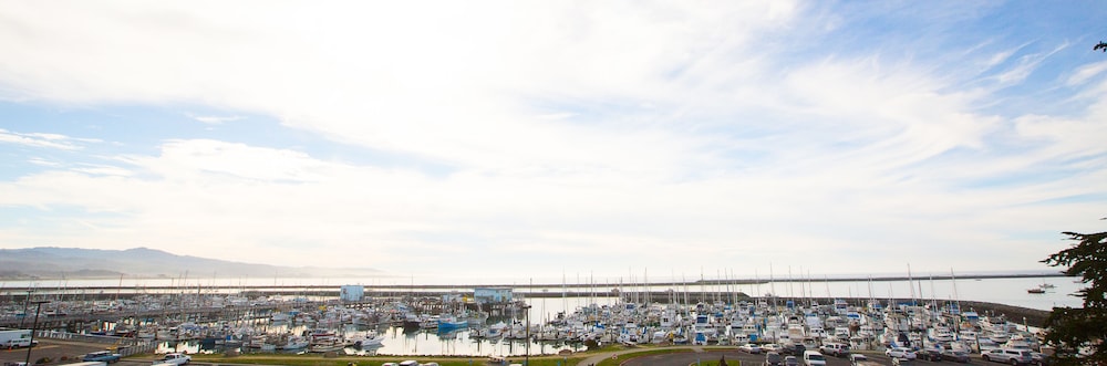 It overlooks a (noisy) street, a parking lot, restaurants, and the harbor.