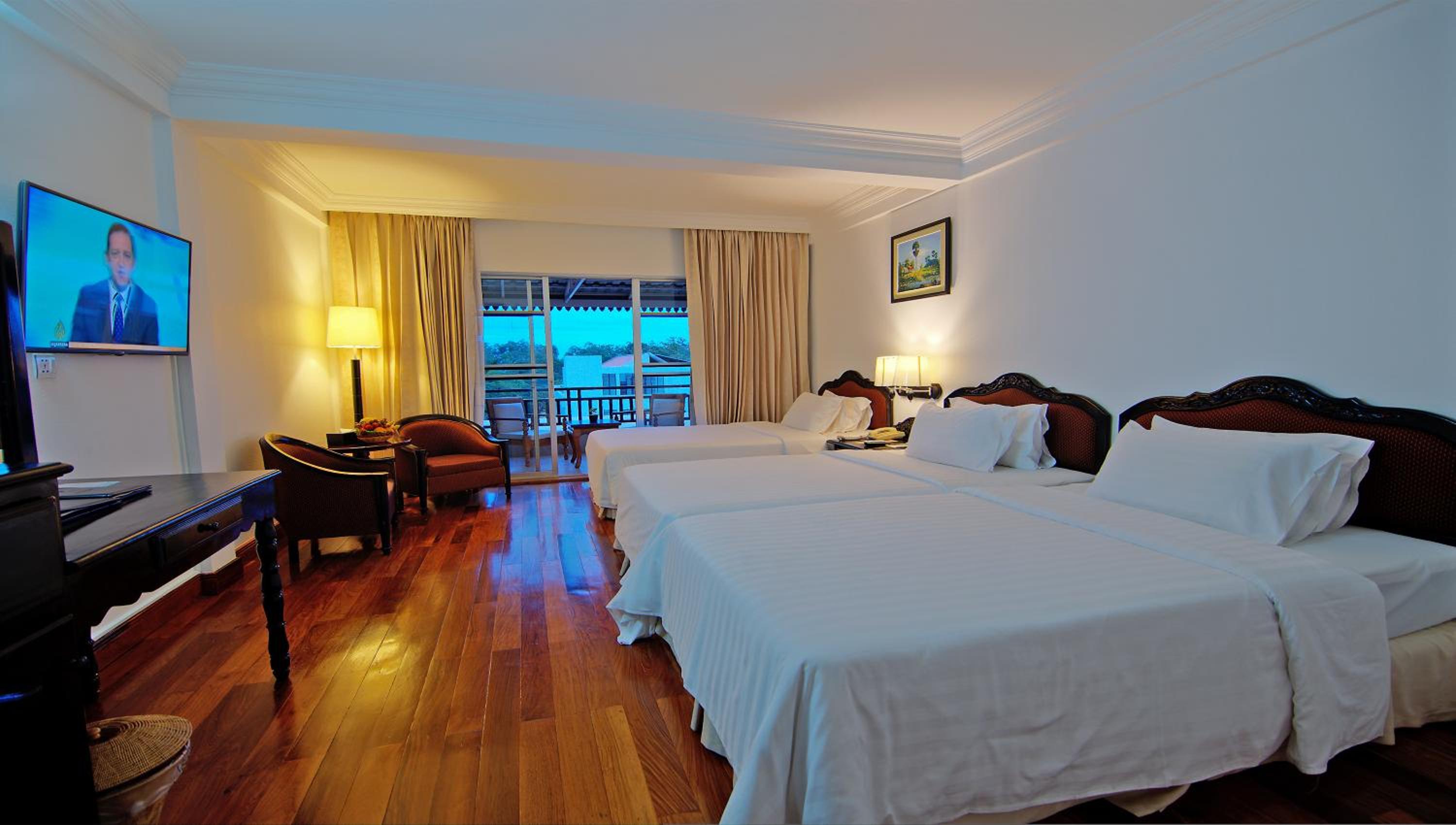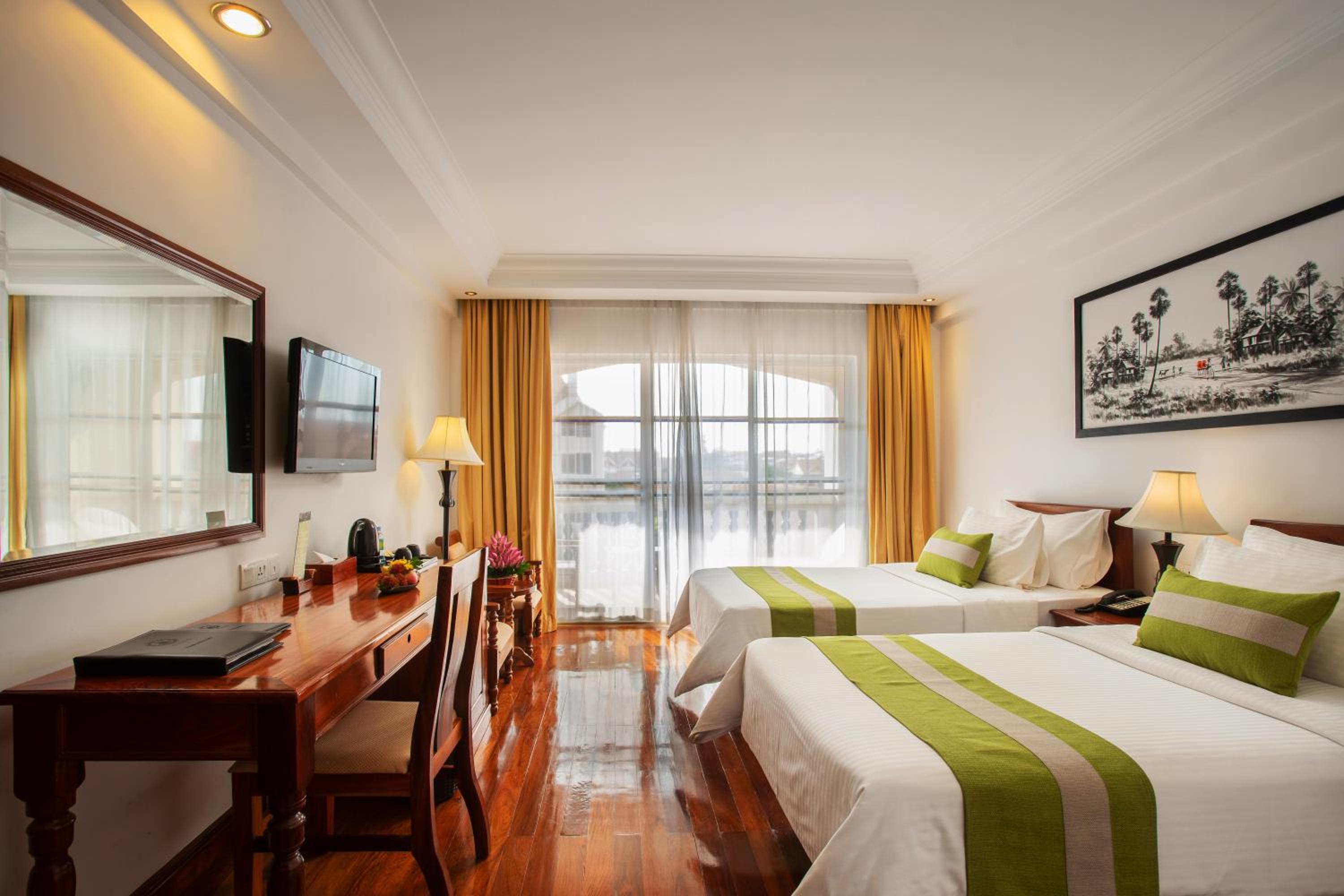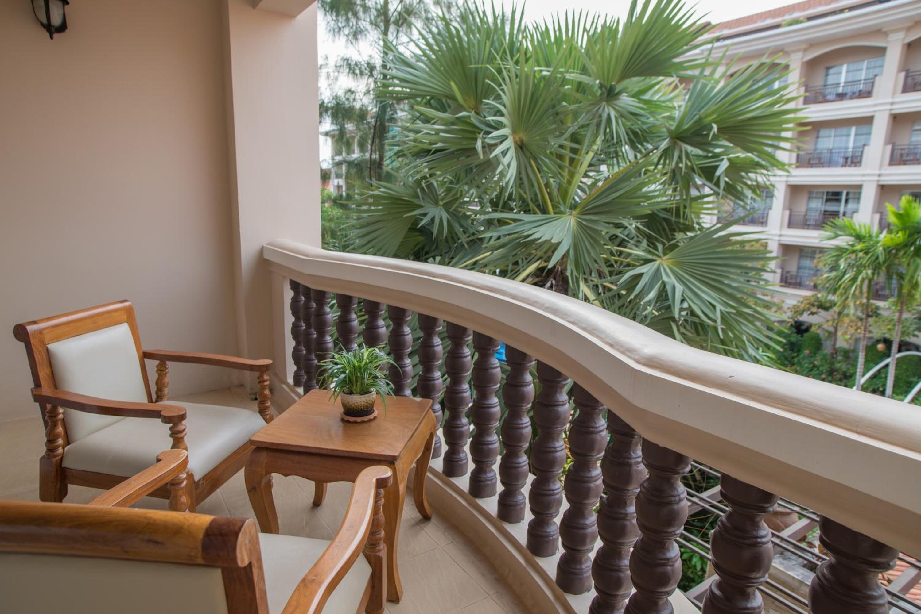 Hotel Somadevi Angkor Resort & Spa offers elegant rooms with hardwood flooring, private balconies, and modern amenities like cable TV and minibars. The attached bathrooms are equipped with a bathtub and separate shower, ensuring a comfortable stay for all guests.