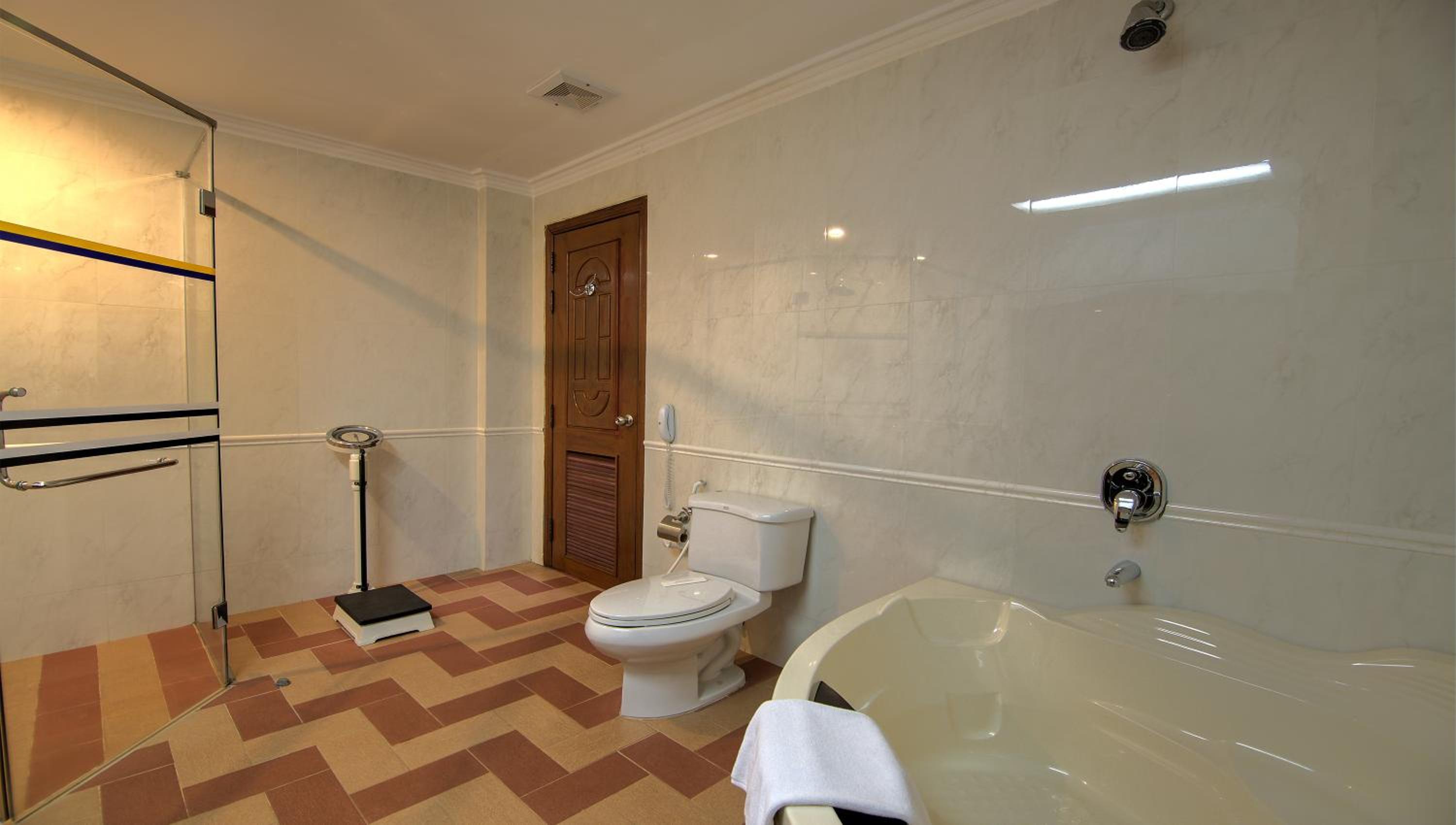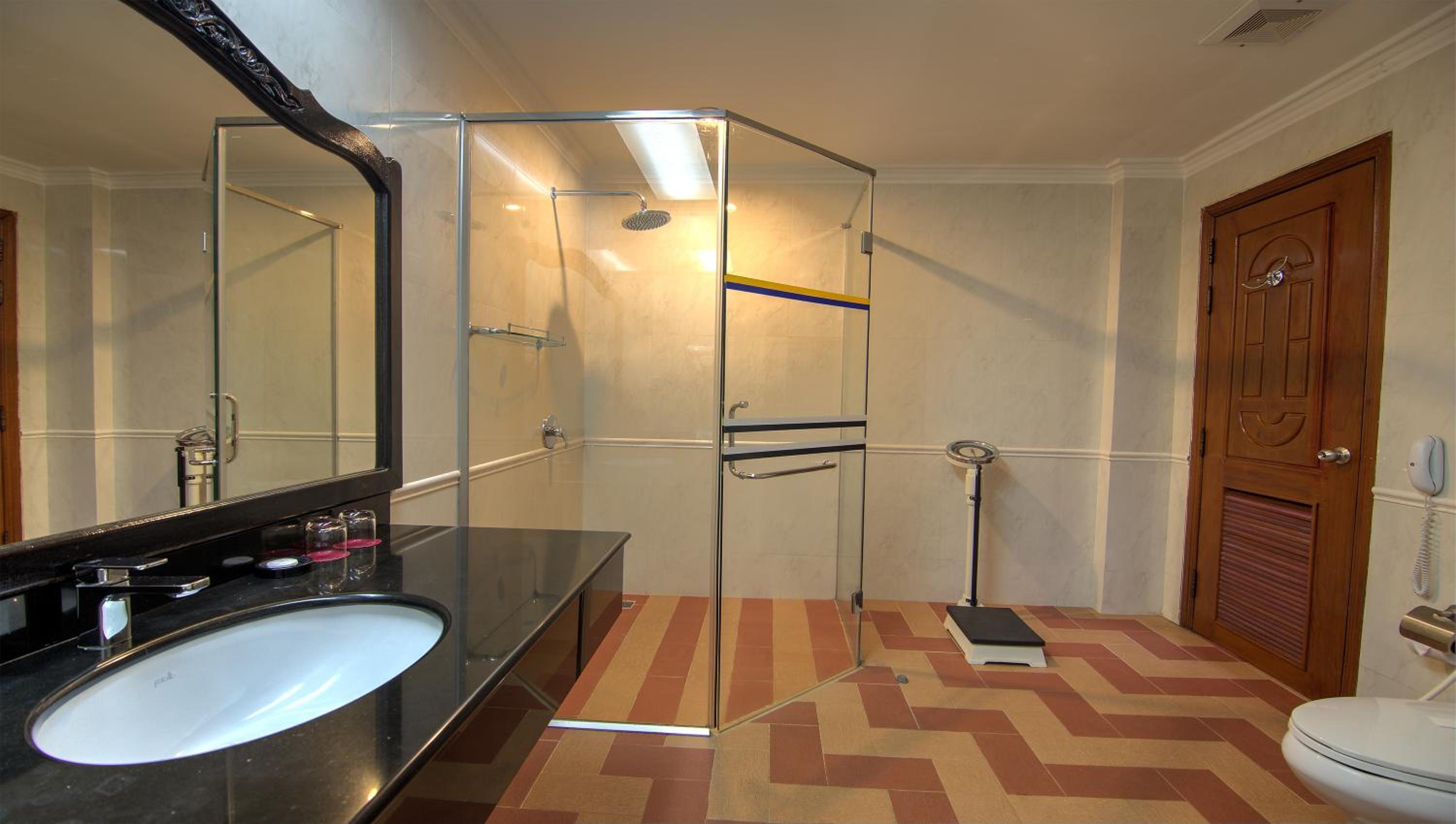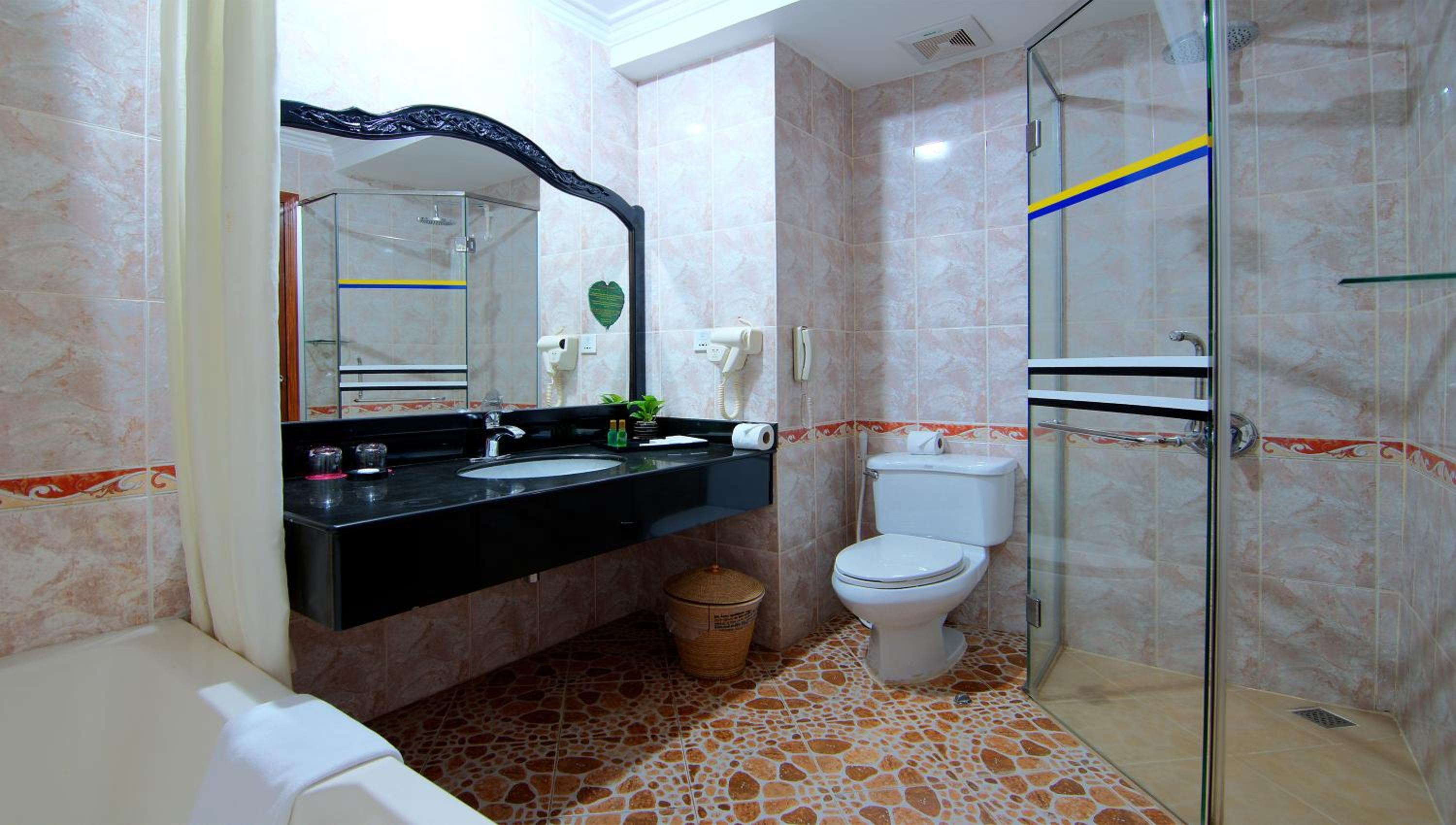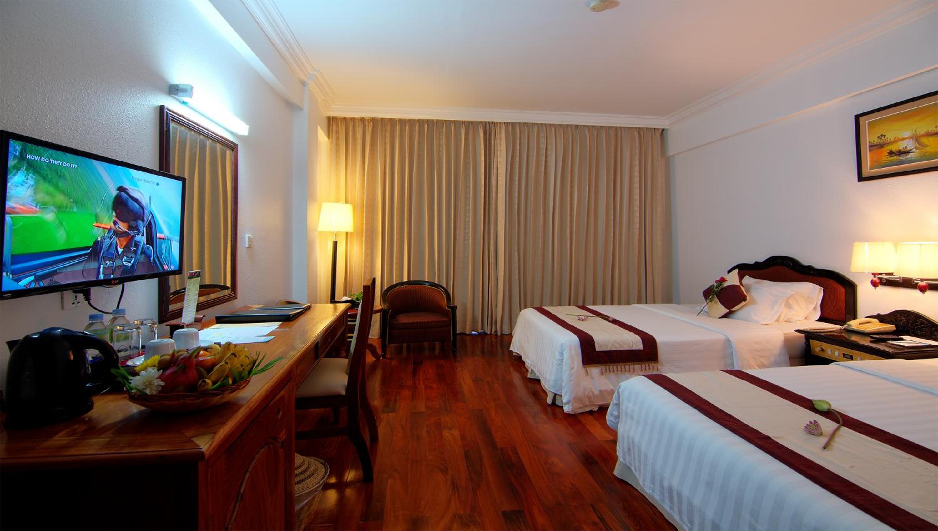 Hotel Somadevi Angkor Resort & Spa offers elegant rooms with hardwood flooring, private balconies, and modern amenities like cable TV and minibars. The attached bathrooms are equipped with a bathtub and separate shower, ensuring a comfortable stay for all guests.